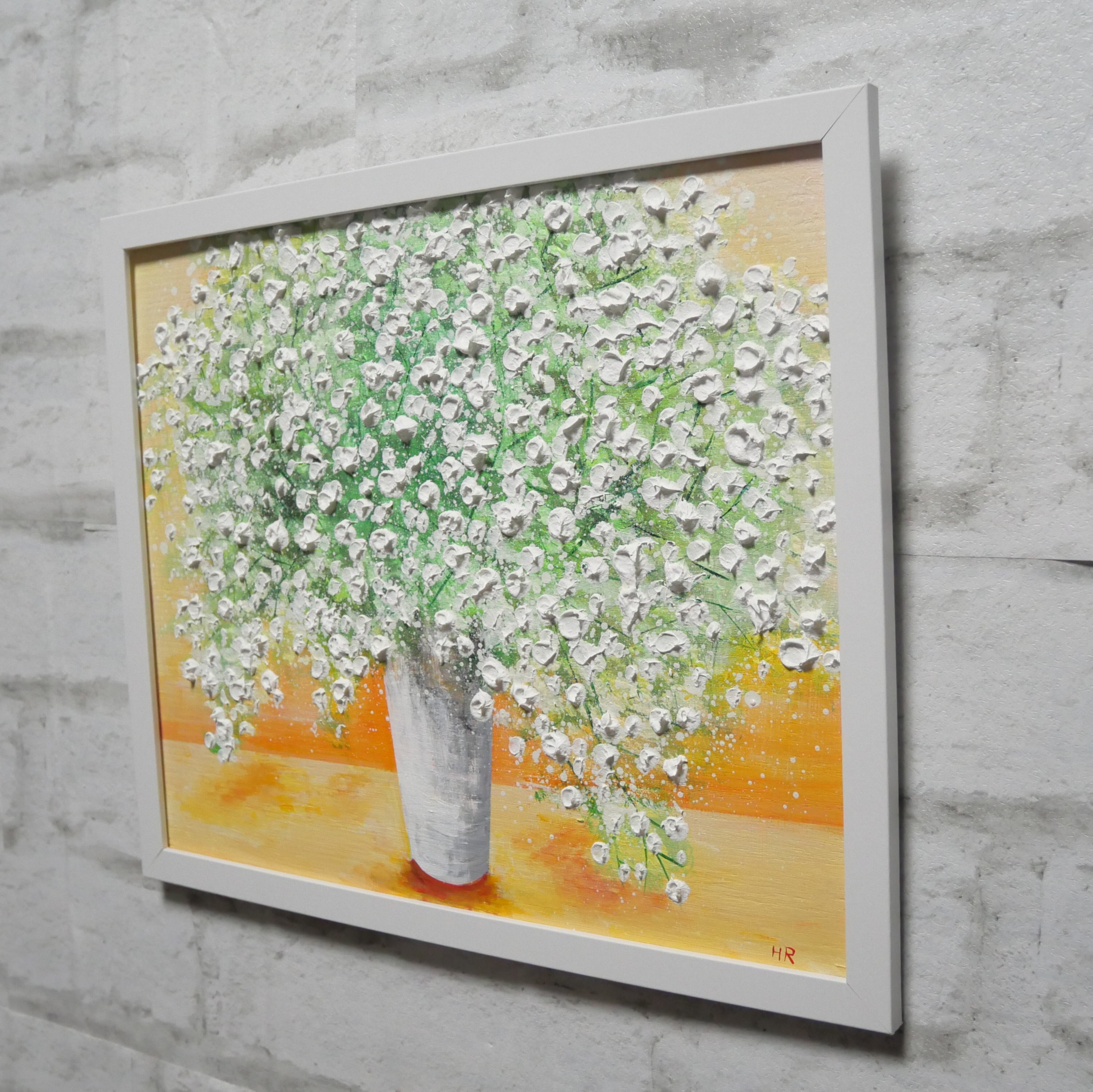 美しいカスミソウを描いた油絵「かすみ草」。清らかな心、無邪気、幸福、感謝、親切といった意味を持つカスミソウの花言葉に共感し、心揺さぶる美しさをお届けします。絵画サイズは305×254で、技法は油絵・油彩を使用。ラッピングもお付けしており、贈り物にも最適です。