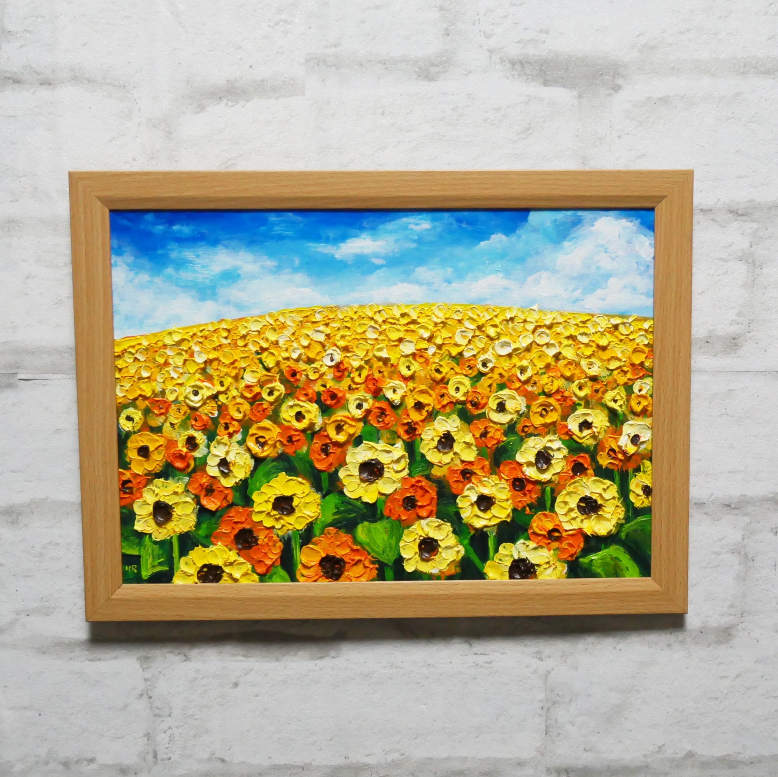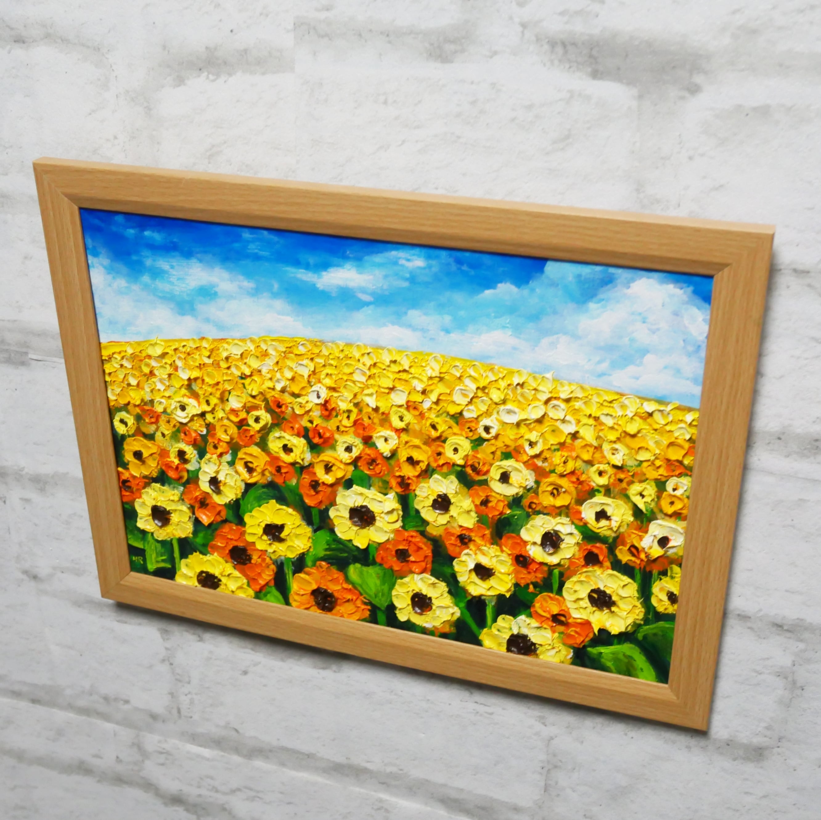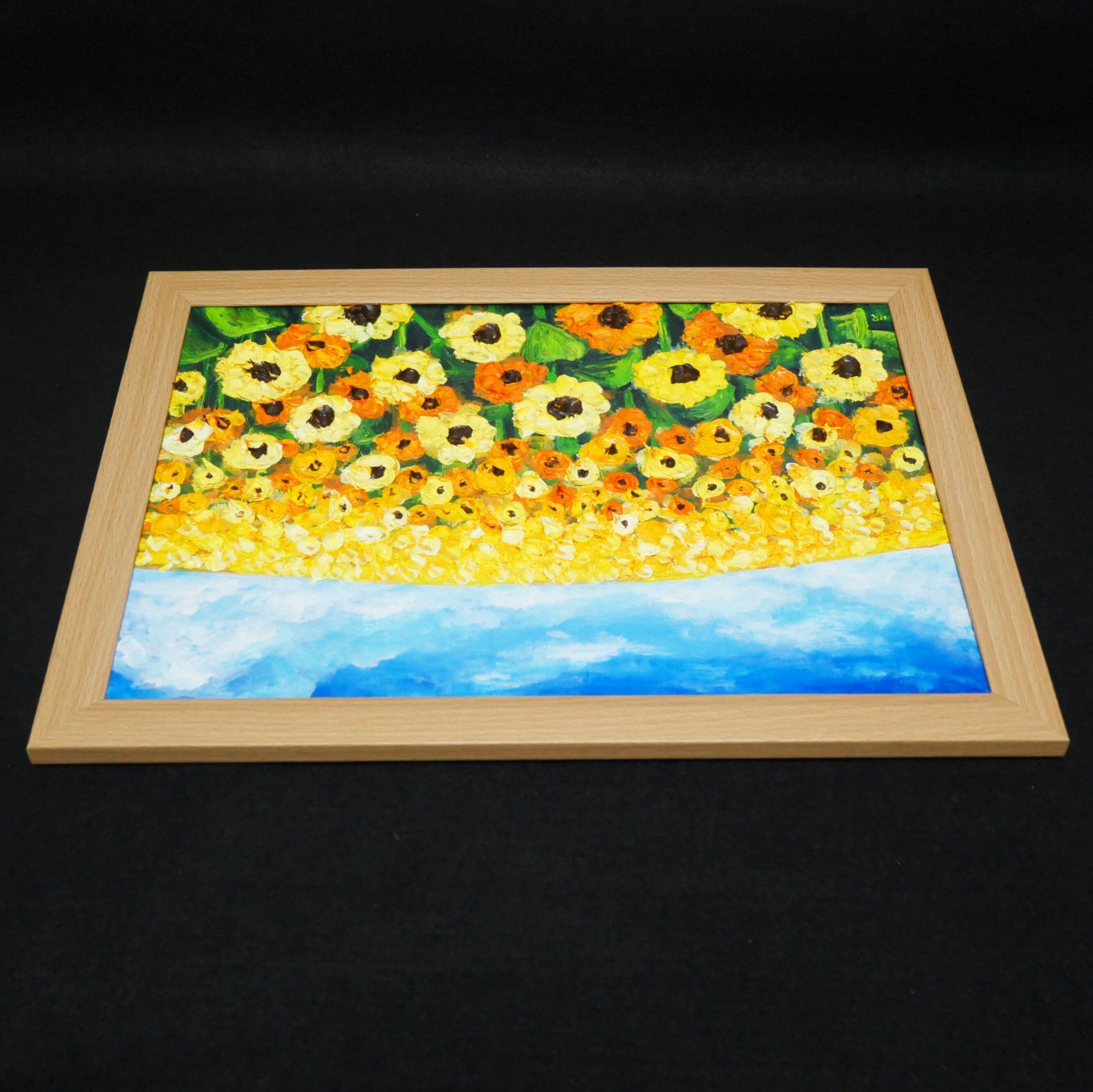 【ひまわりの丘】は、日常に幸せな一筋の光を灯す絵画です。油絵・油彩で描かれた、美しいひまわりと広がる空のコントラストが、心を穏やかに満たしてくれます。広がるひまわり畑を楽しむことができます。