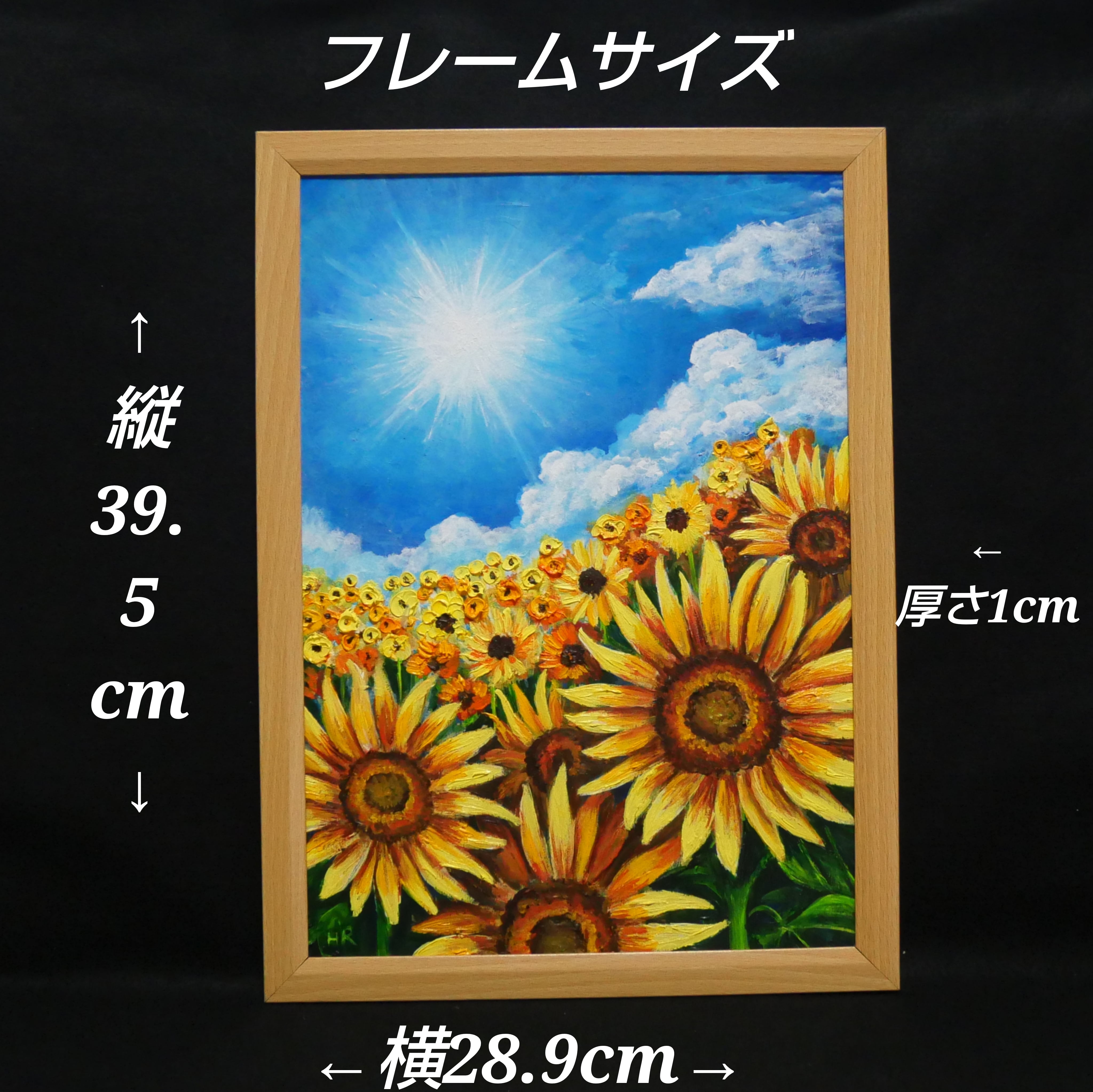 このアート作品は、夏の自然美や花の持つ力強さを表現したものです。メインのひまわりは、夏の象徴であり、一面に広がるひまわり畑と太陽の輝きが、暑い季節の活力と元気を感じさせてくれます。真夏の気分を味わいたい方や、自然を感じるアートがお好きな方にお勧めの作品です。