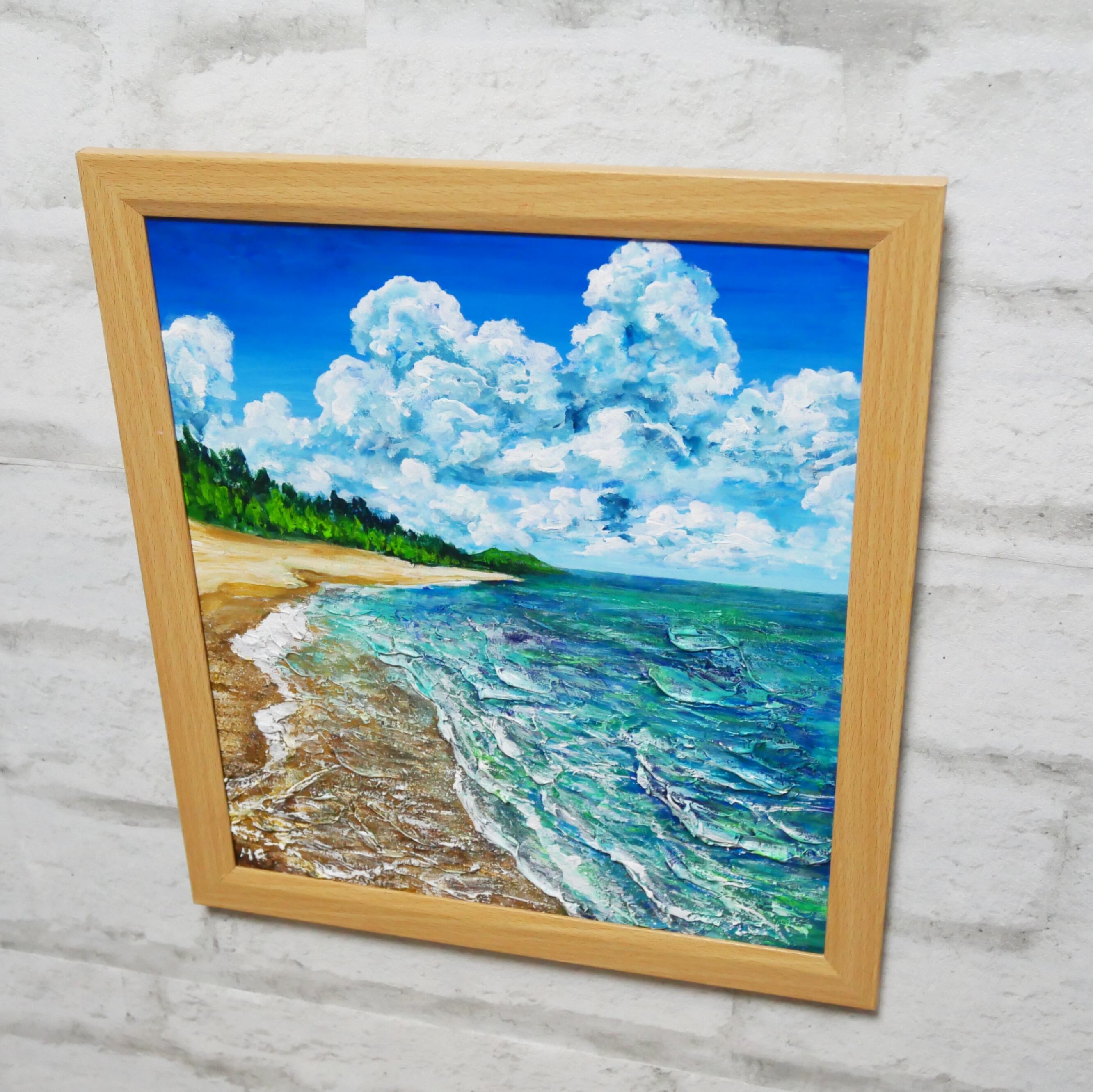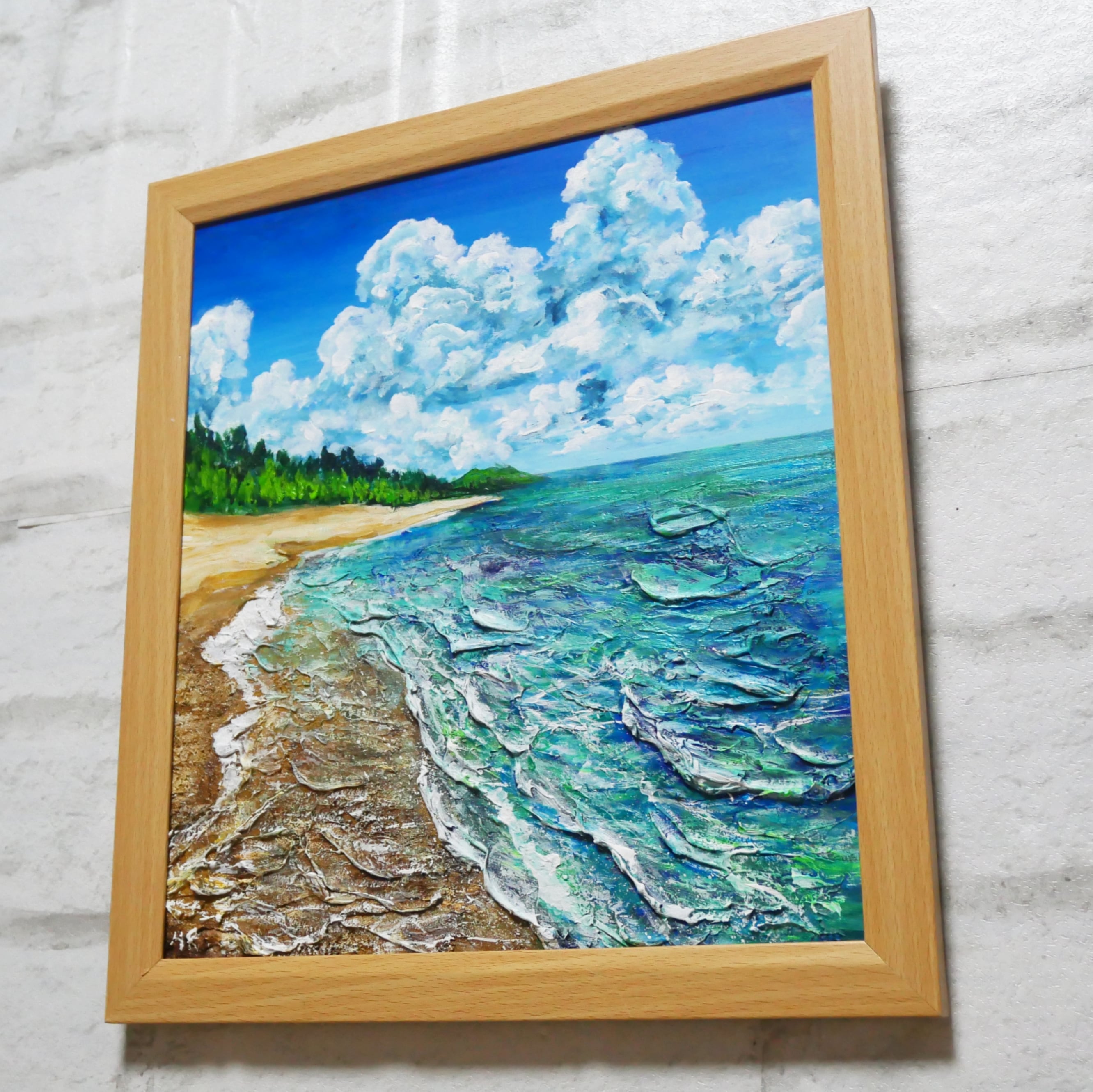 真夏の海と砂浜を描いた油絵。モチーフは海や夏空、砂浜など夏のイメージが詰まった一枚。繊細な色使いと技法が、リアルな風景を生み出しています。作品のサイズは242mm×272mm、フレームサイズは27.4×30.4×0.9cmで、壁掛け用の金具も付属しており、お好きな場所に簡単に飾ることができます。真夏を感じさせる絵画は、お部屋のアクセントにもなります。