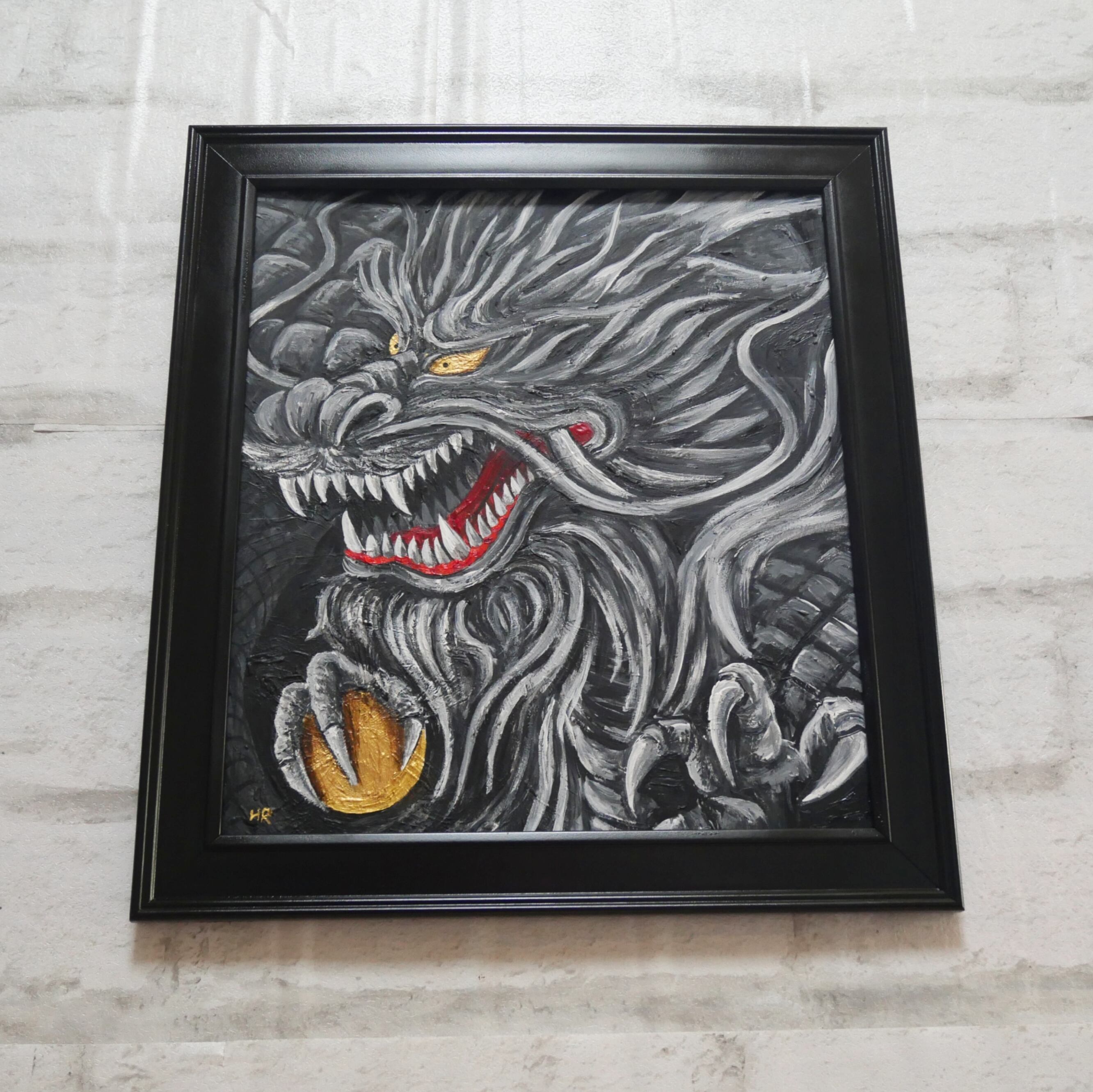 黒龍を描いた油彩画です。緻密に描かれた黒龍が、壁に飾るだけで空間に神秘的な雰囲気を演出します。モノトーンのカラーリングと縦横無尽な動きが、見る者を惹きつけます。技法には油絵・油彩を使用し、ホルベインの油絵具と色紙を組み合わせて仕上げました。黒色のフレームに収められたサイズは横24.2cm、縦27.3cm。インテリアにアクセントを加えたい方、龍やドラゴンをお好きな方、この作品はきっとお部屋の雰囲気を一変させることでしょう。虚実入り交じる龍の世界に、日々の生活から離れ、憧れを抱きませんか。