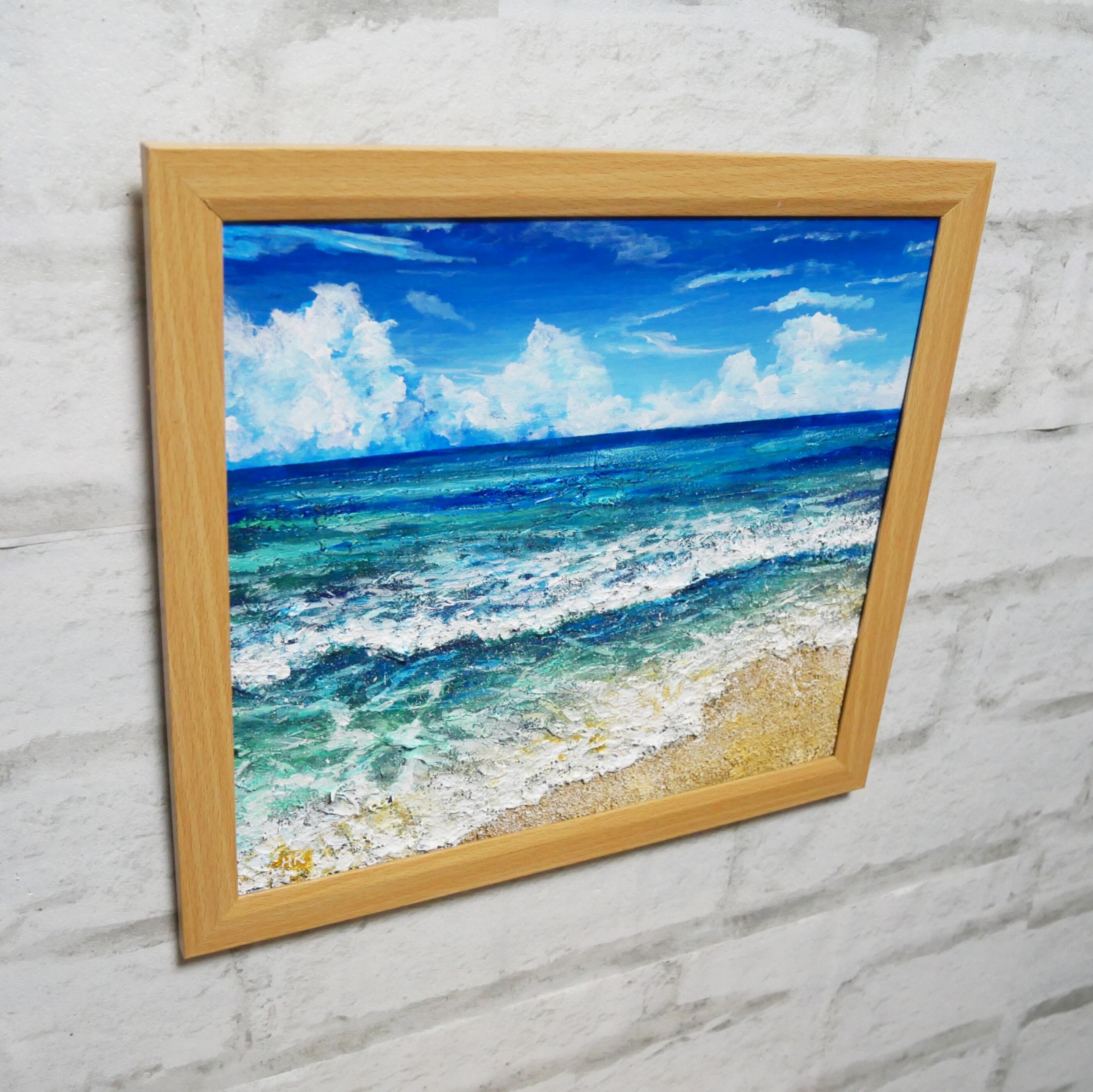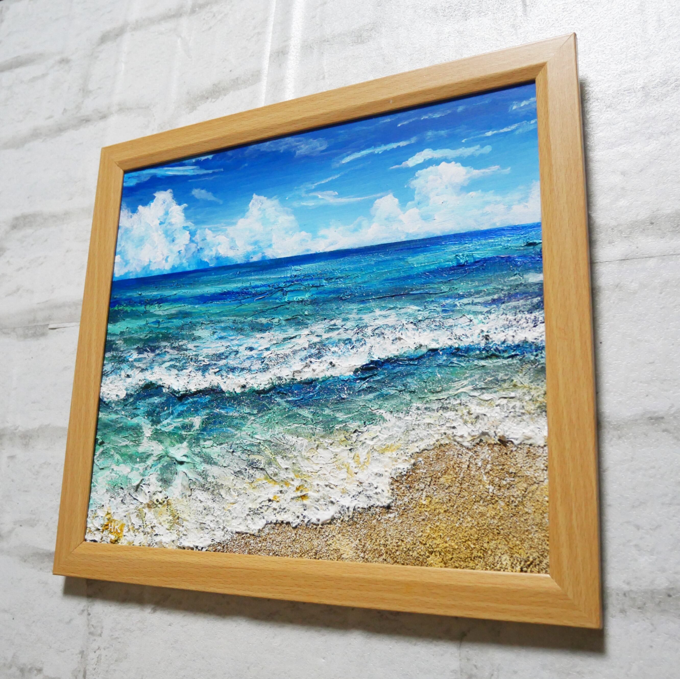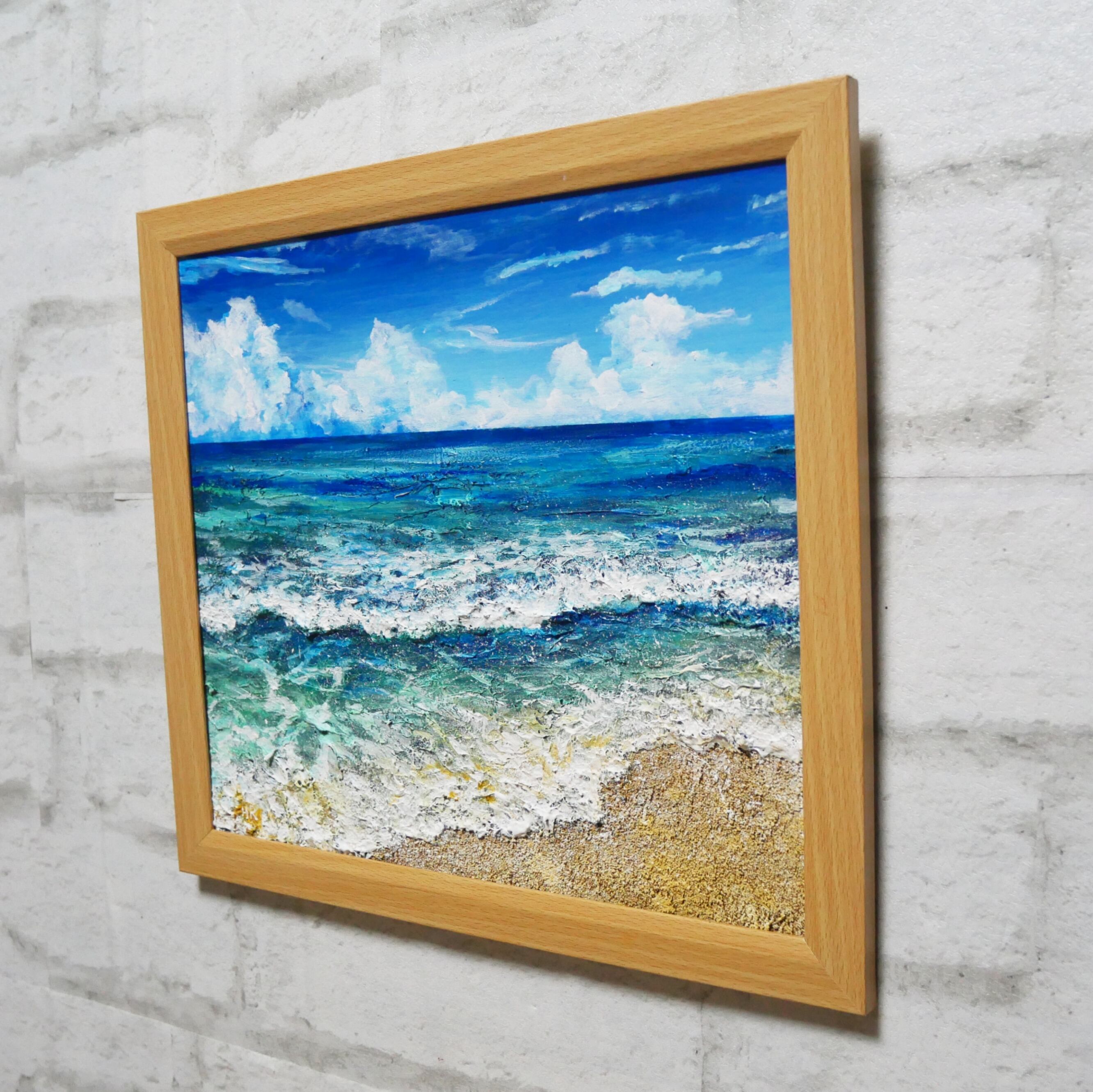 美しく輝く夏の海をテーマに描かれた油絵【真夏の海】。繊細なタッチで描かれた波の音が聞こえてきそうな透明感あふれる作品です。モチーフとなる海や夏空、砂浜の色彩は、まるで瞬間を切り取ったかのようなリアリティがあります。ホルベインの油絵具を使用し、丁寧に手が加えられた作品は、その質感や色彩が鑑賞者の心をとらえることでしょう。