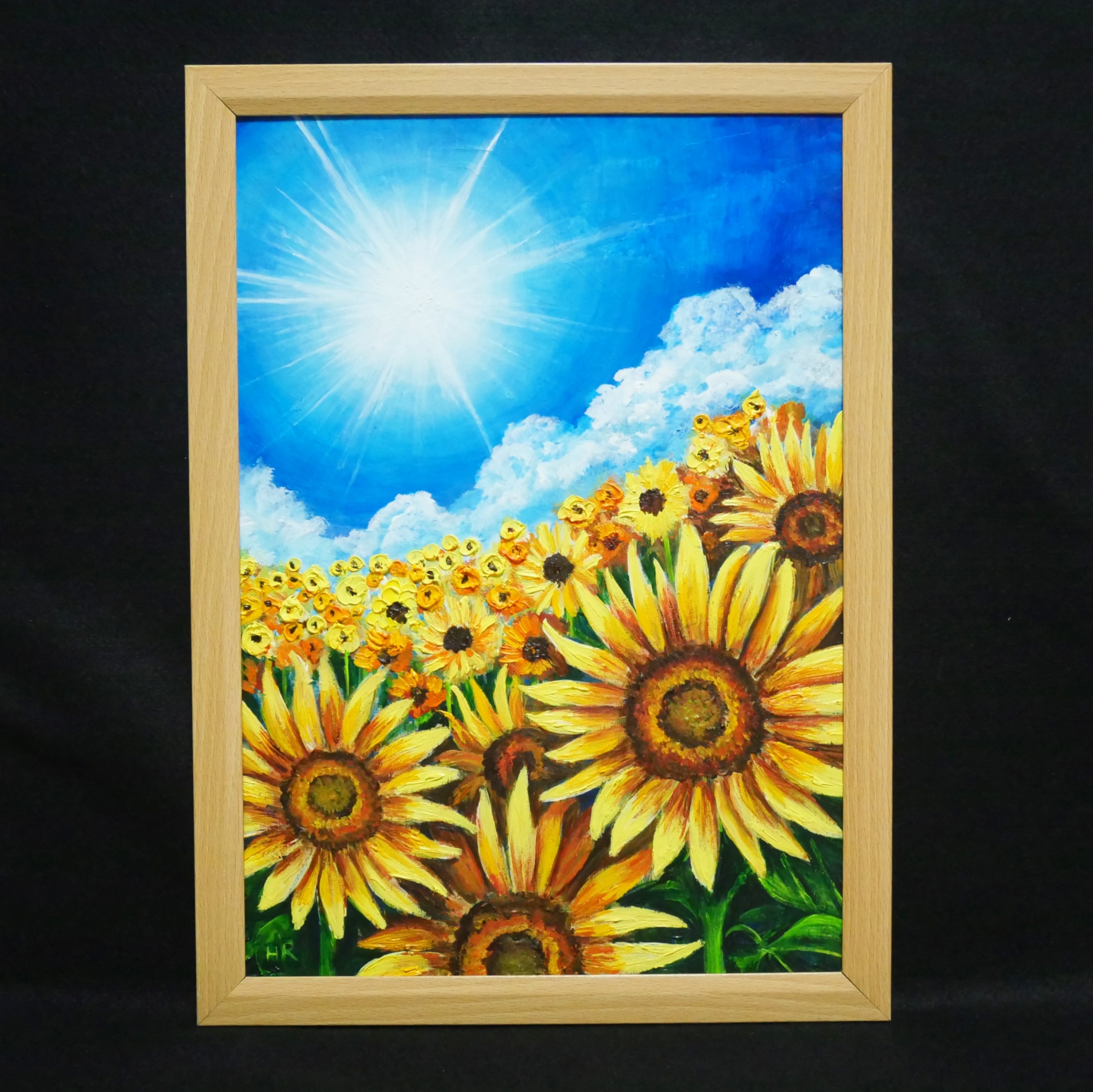 このアート作品は、夏の自然美や花の持つ力強さを表現したものです。メインのひまわりは、夏の象徴であり、一面に広がるひまわり畑と太陽の輝きが、暑い季節の活力と元気を感じさせてくれます。真夏の気分を味わいたい方や、自然を感じるアートがお好きな方にお勧めの作品です。
