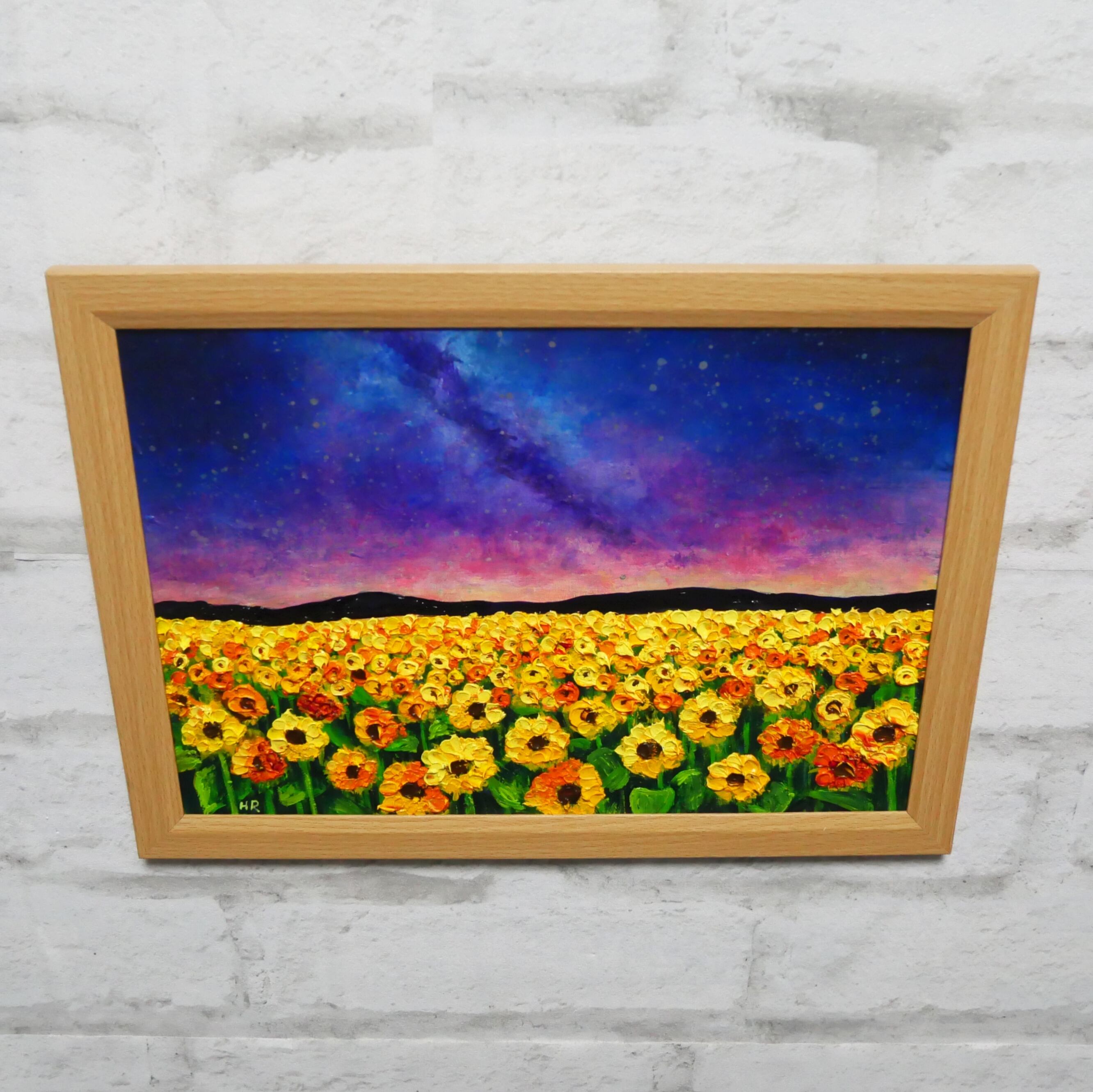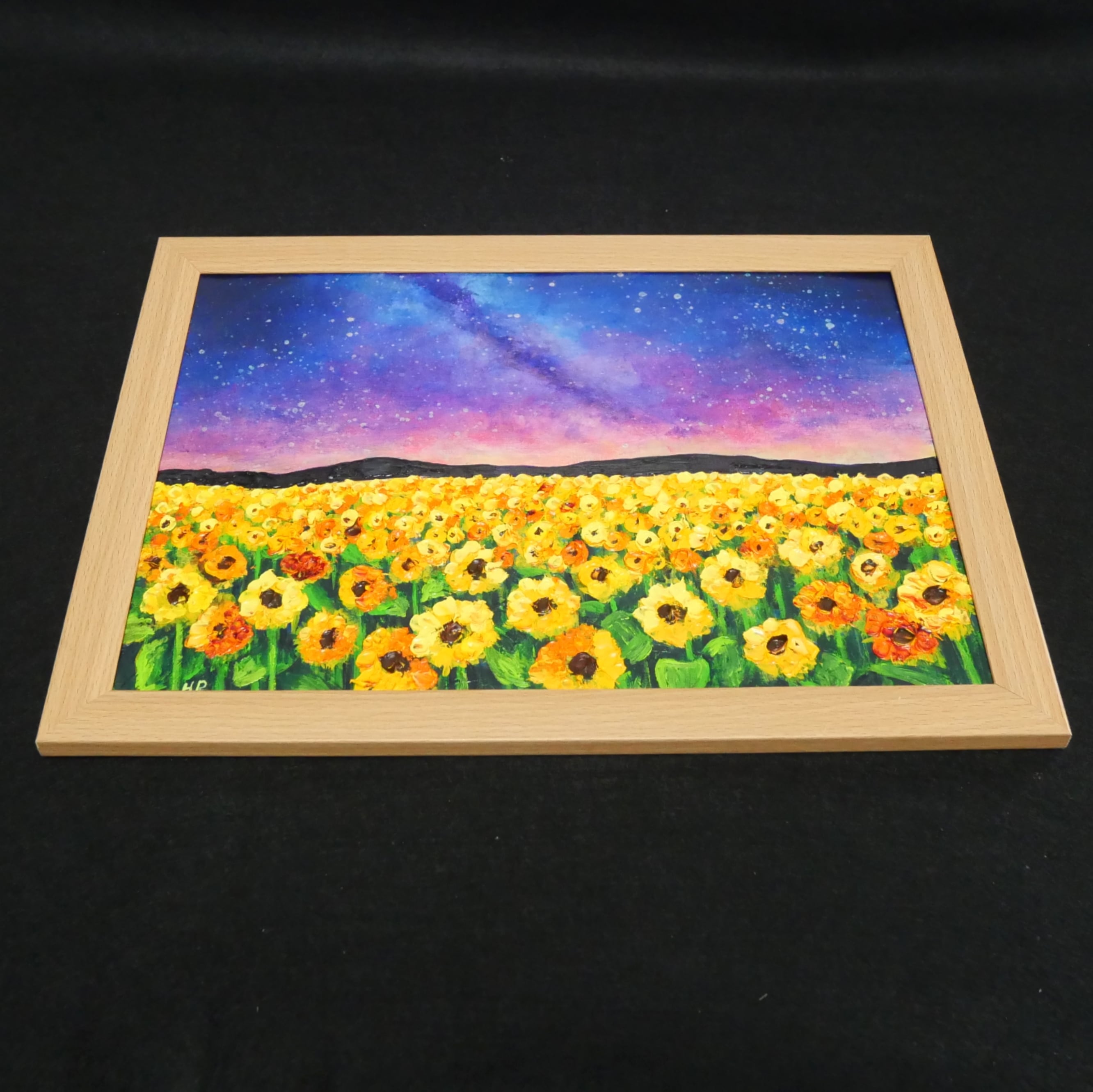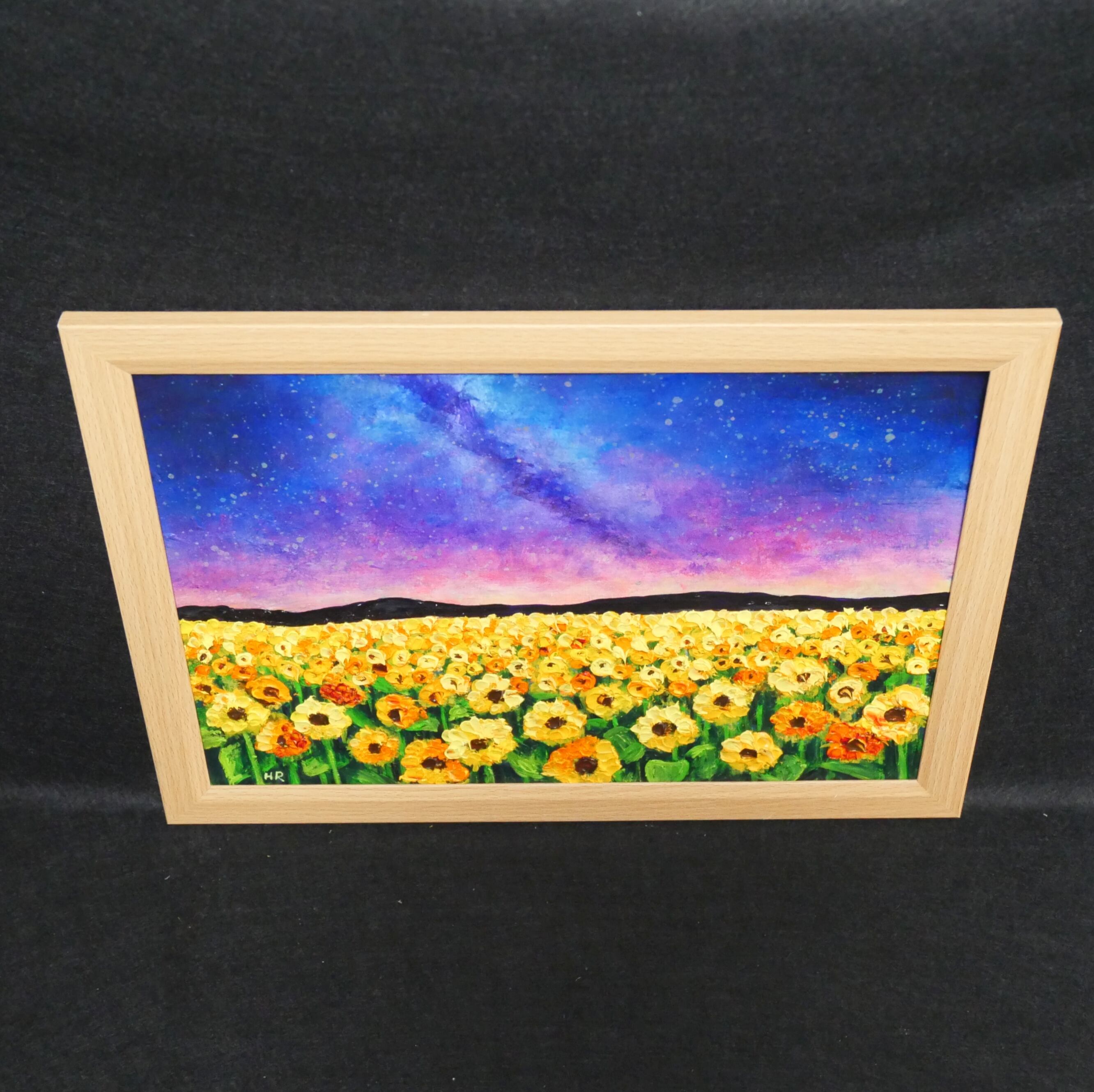 この油絵のサイズは縦210mm × 横297mmで、A4厚紙サイズのキャンバスに直接描かれています。ナチュラル額縁に収めたサイズは縦24.2cm × 横32.8cm × 厚さ1cmで、壁掛け用の金具も付属していますので、お好きな場所に簡単に飾ることができます。「星空の向日葵畑」は、大切な方への贈り物や特別な瞬間を彩るアートとして、おすすめいたします。