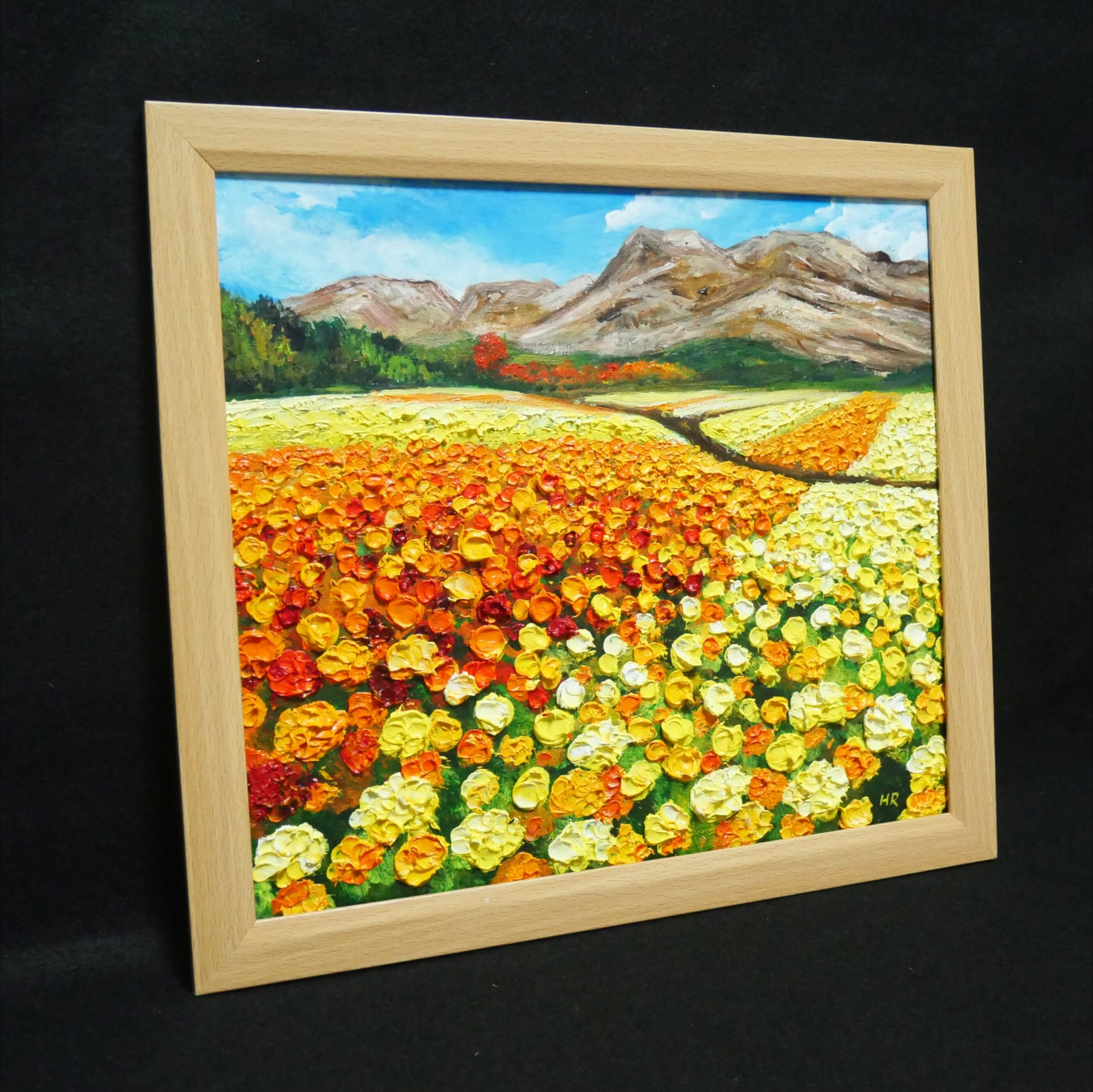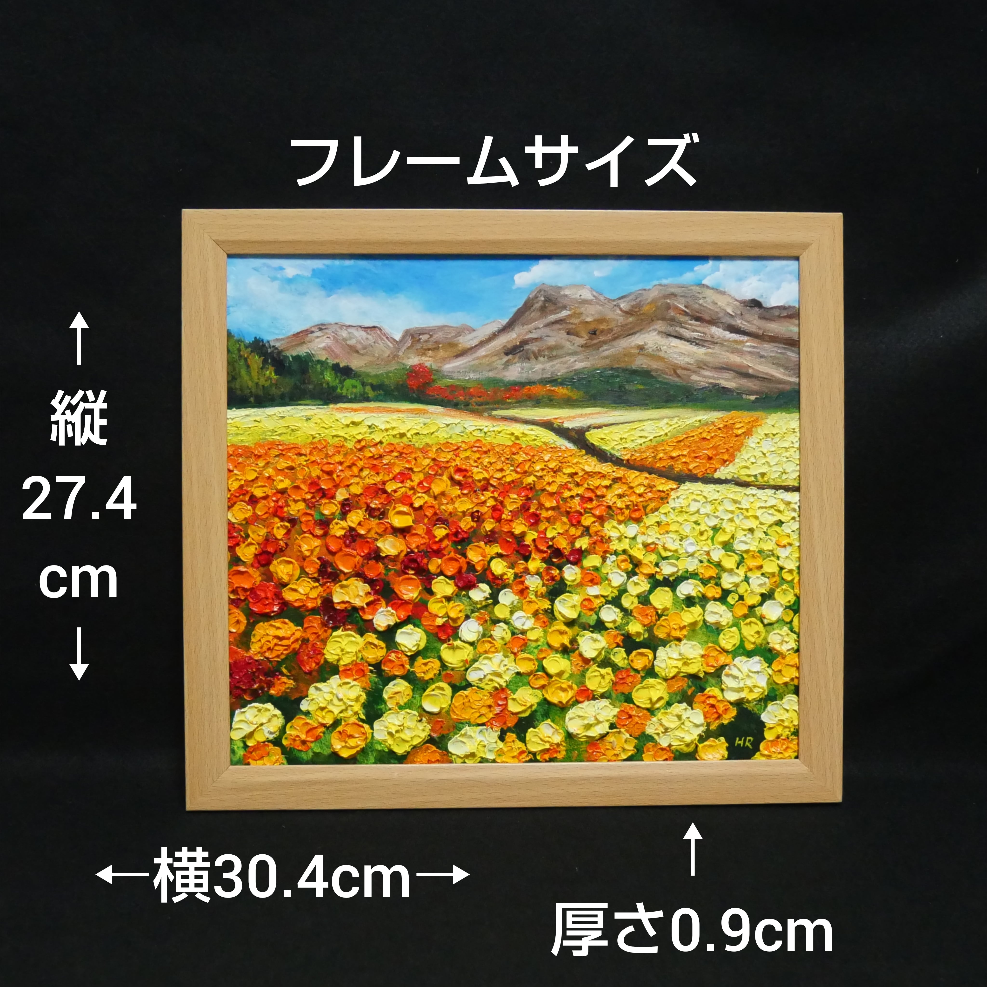 丹精込めて描かれた「くじゅう花公園とマリーゴールド」の油彩画。豊かな色彩が目を引き、花畑の爽やかな風景が描かれています。アート愛好家や花が好きな方におすすめの一枚です。繊細な筆致が感じられるのは、職人が時間を掛けて一つ一つ手描きしたから。絵画制作の技術と情熱が詰まった逸品です。