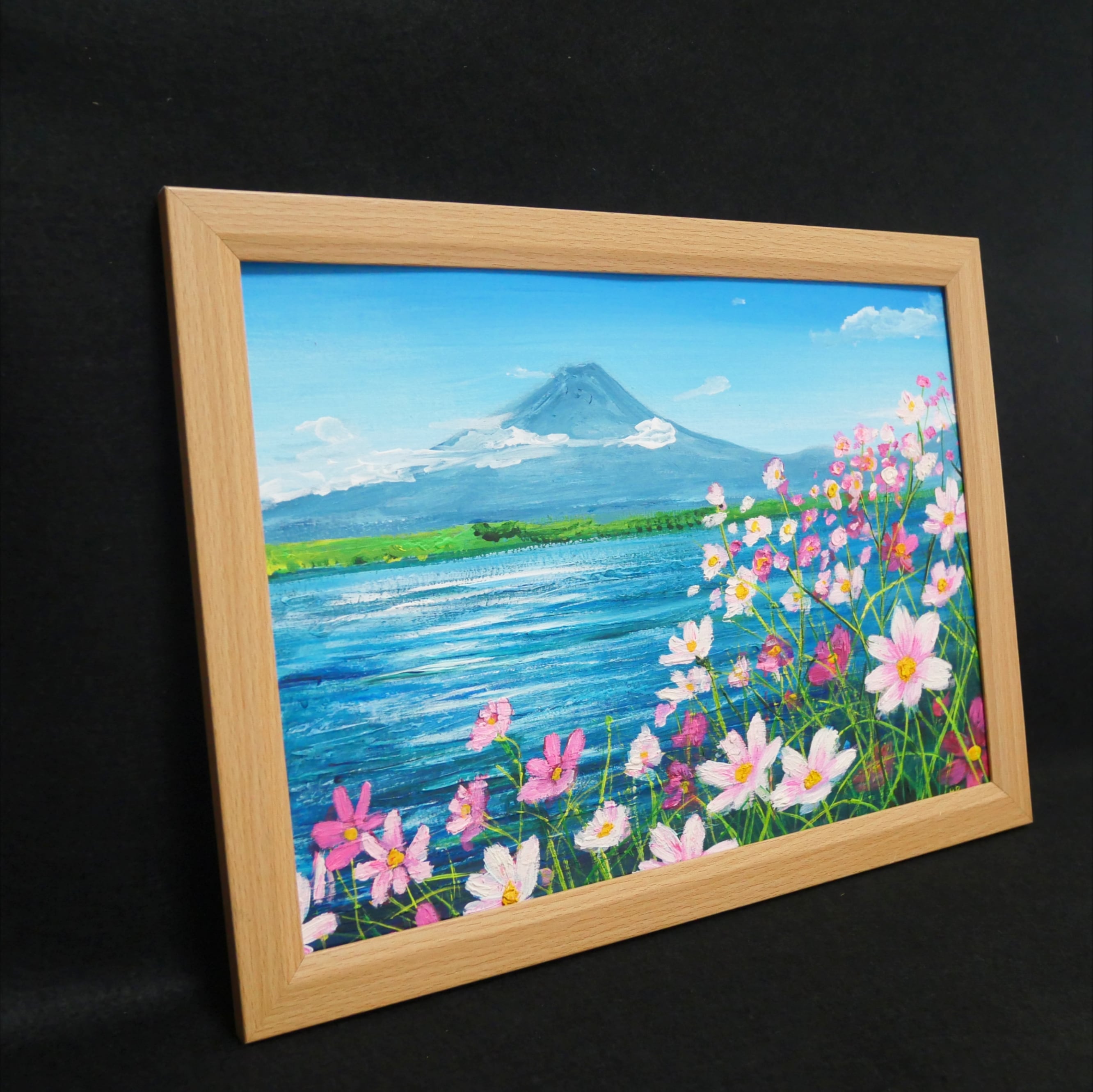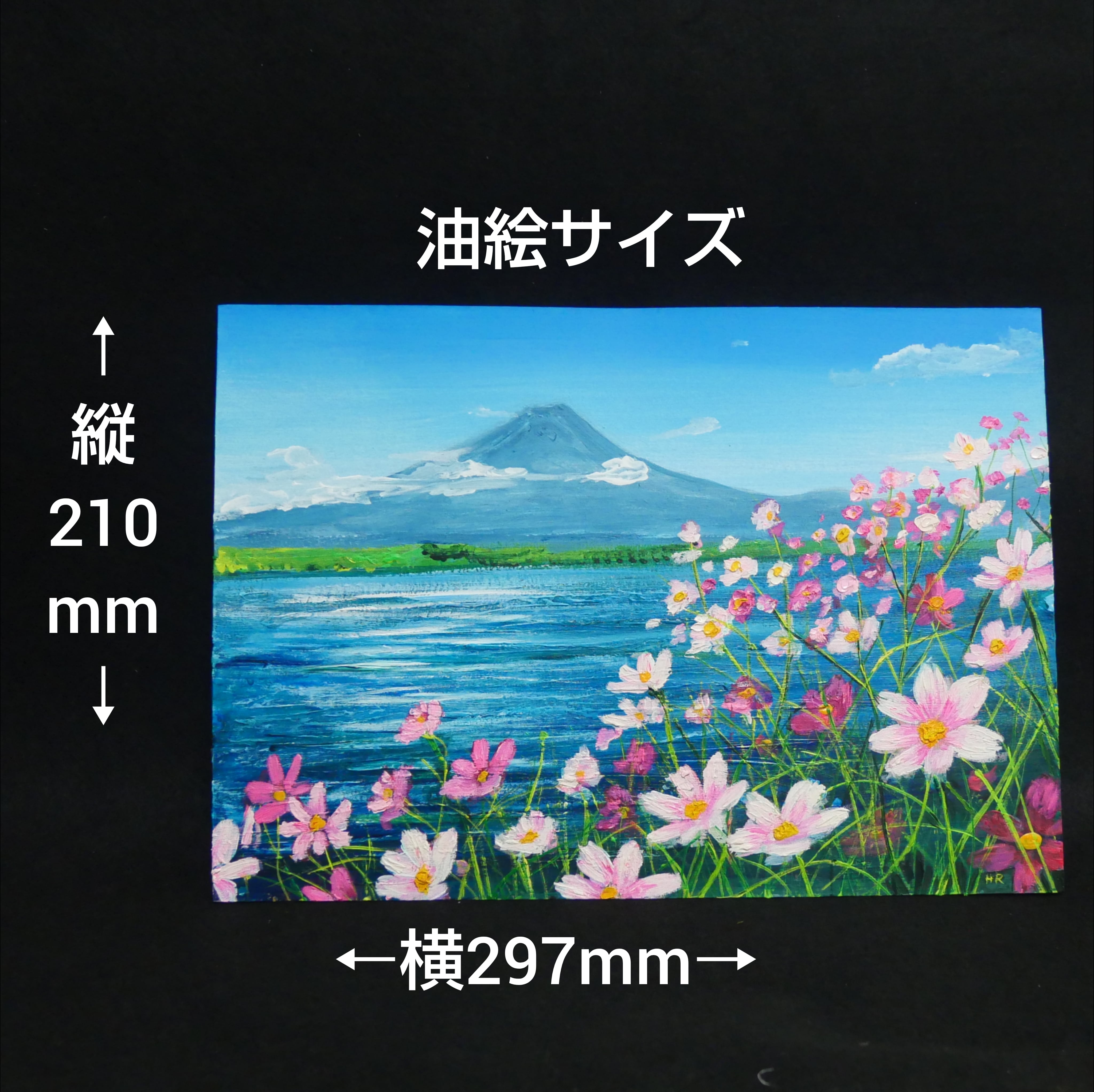 油絵 絵画 【コスモス畑から見える河口湖と富士山】