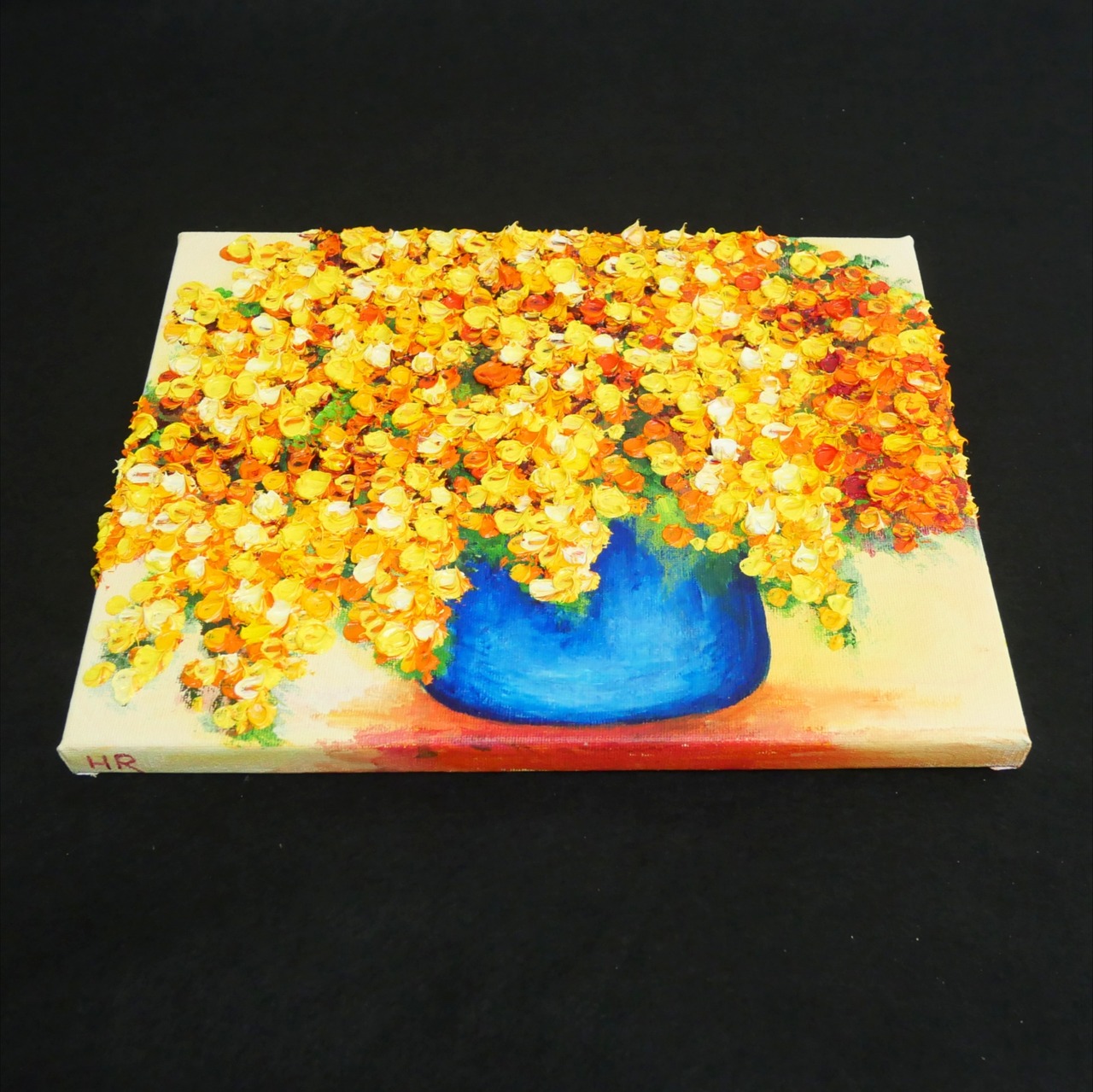 心温まる油彩画「ミモザ」は、愛らしいフサアカシアの黄色い花々をモチーフにし、春の訪れを感じさせる鮮やかな作品です。ホルベインの高品質な油絵の具を使用し、明るい黄色の背景と青い瓶が調和した美しい横構図で仕上げられています。お部屋のアクセントやギフトとしても最適な一品です。