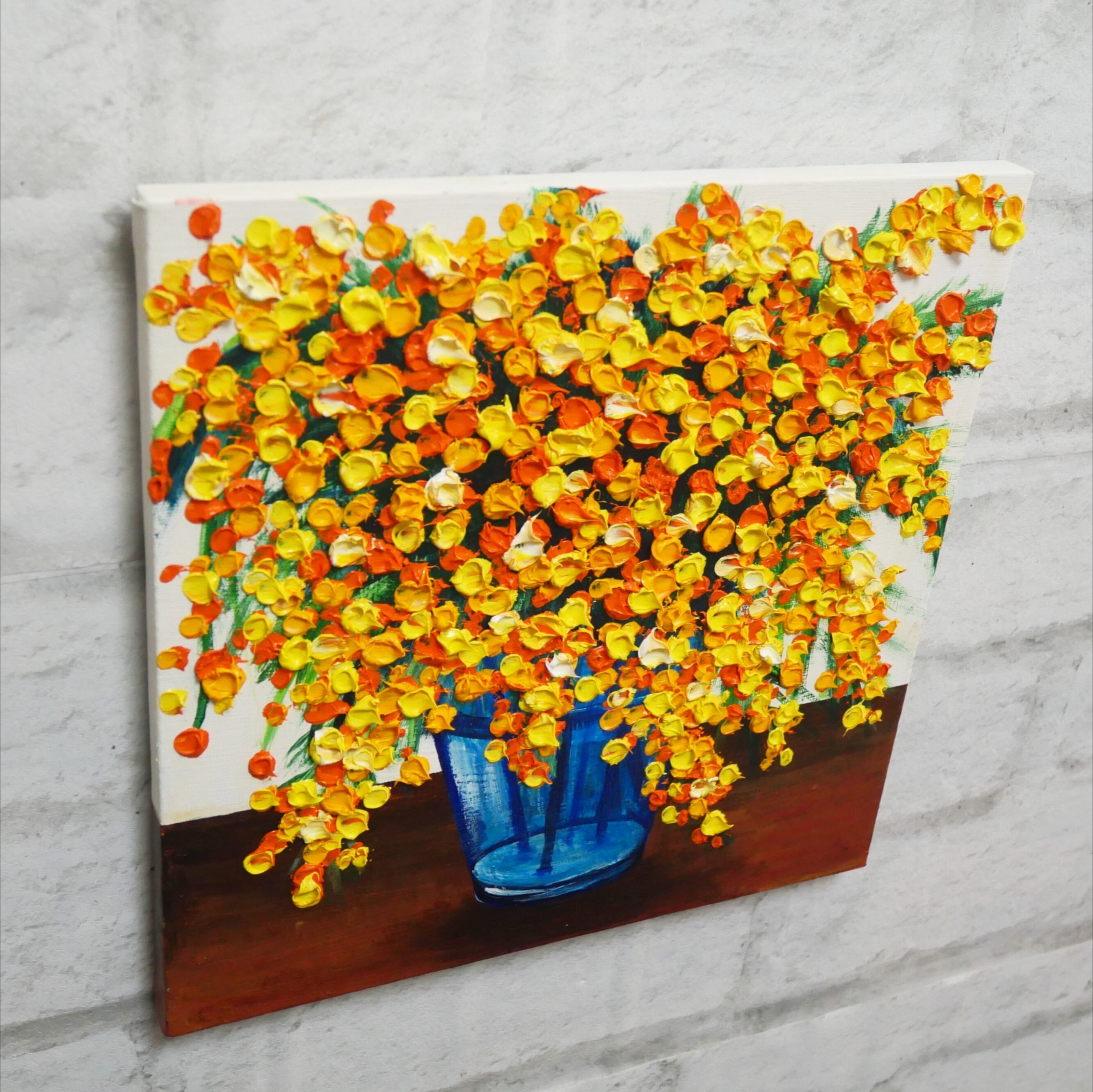 優しく華やかなミモザの花を描いた油絵のアートパネル、それがこの作品です。手の届く価格で、美しいアートをお部屋に飾りたい方にぴったりの一枚です。金具も付属しており、壁掛けも簡単にできます。小さなサイズでも存在感のある、縦25.0cm ×横25.0cm×厚さ1.5cmの作品です。