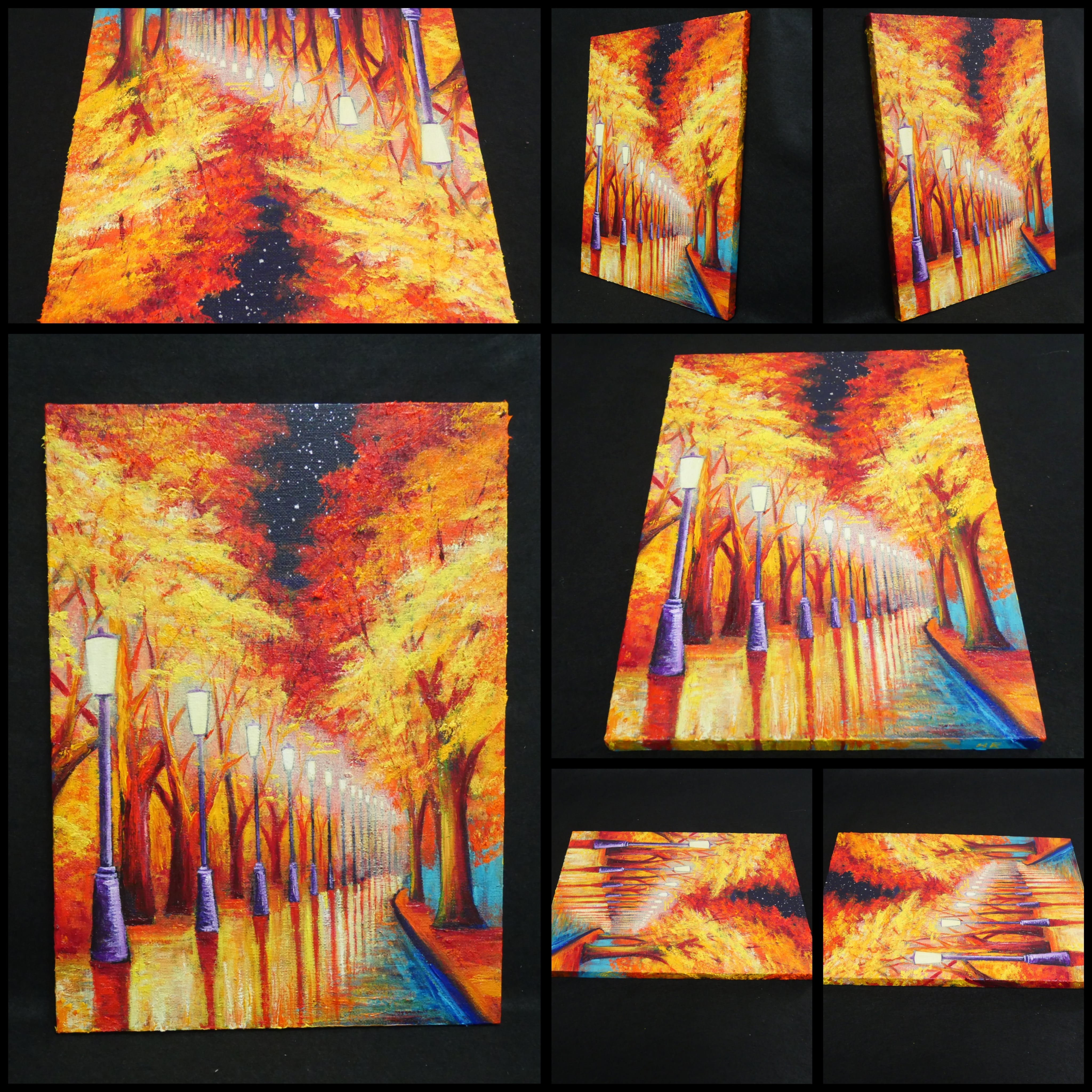 秋の夜にのぞく幻想的な風景を描いた油彩画【夜の秋】。紅葉が美しく色づいた木々と、公園の温かな照明が織り成すコントラストが、見る者の心を癒します。夜空の下、心を寄せるように描かれたこの作品は、秋の季節に最適なアートピースです。お部屋に飾ることで、一瞬の静寂とともに、豊かな自然の美しさを感じていただけることでしょう。