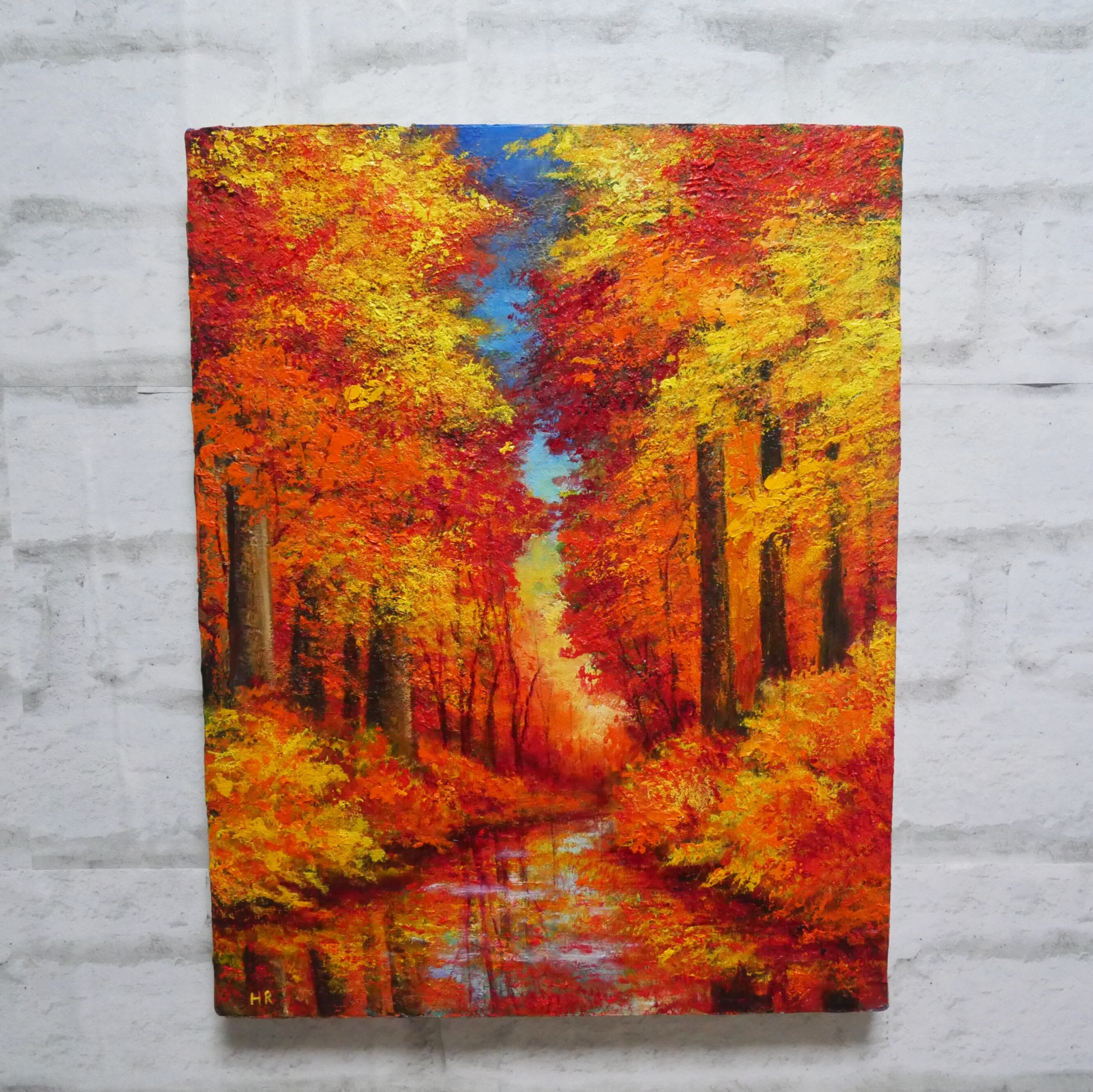 秋の深まりを感じさせる美しい風景を描いた油彩画【紅葉】。この作品では、紅に染まる森と穏やかな川が織りなす、まさに秋の情景を表現しています。心温まるこの風景は、自宅やオフィスに飾ることで、訪れる人々に安らぎを提供します。