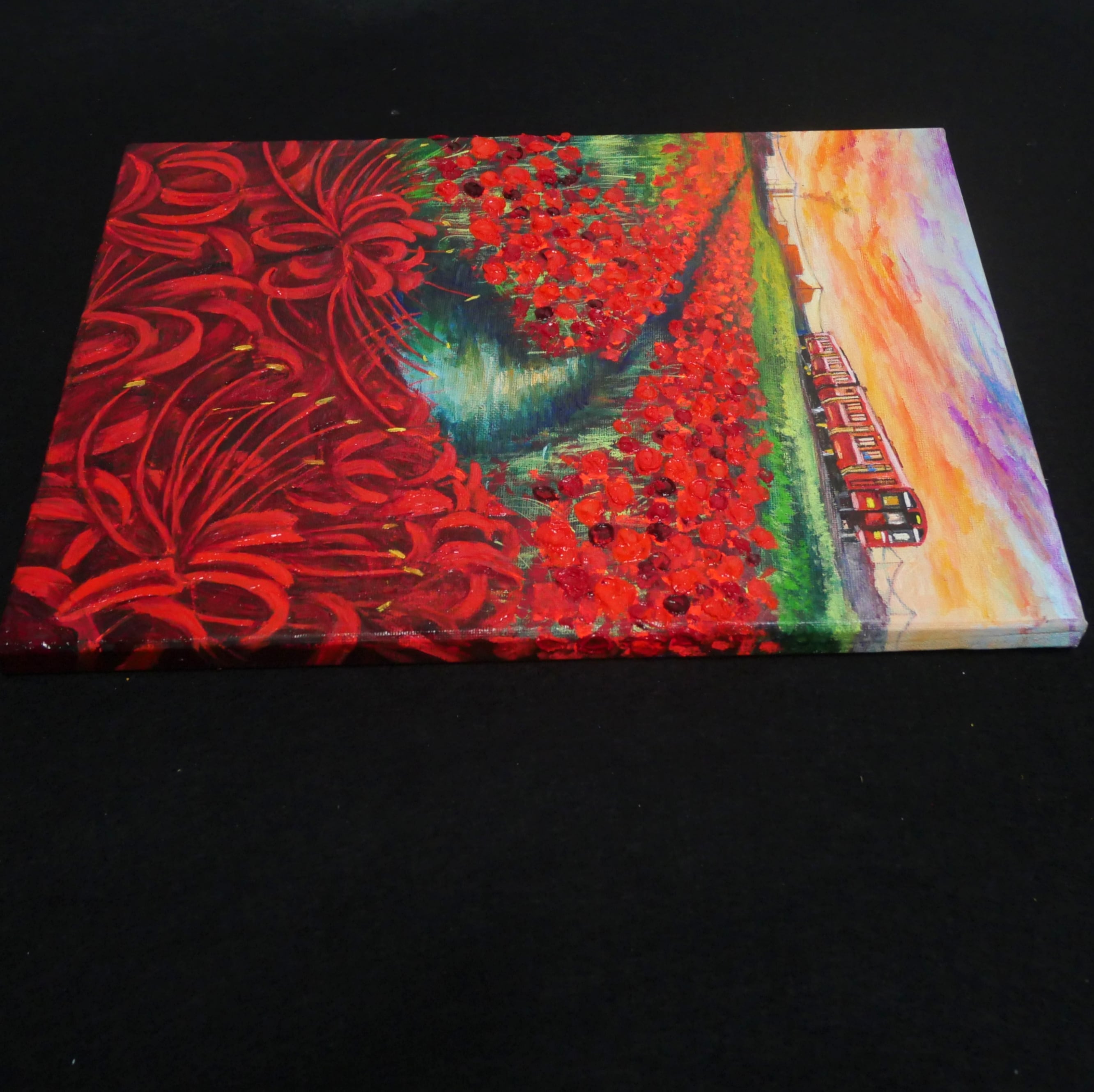 「彼岸花と赤い電車」のアートで、あなたの生活空間に美しさを感じる一瞬をお届けします。心の癒しをぜひご体験ください。