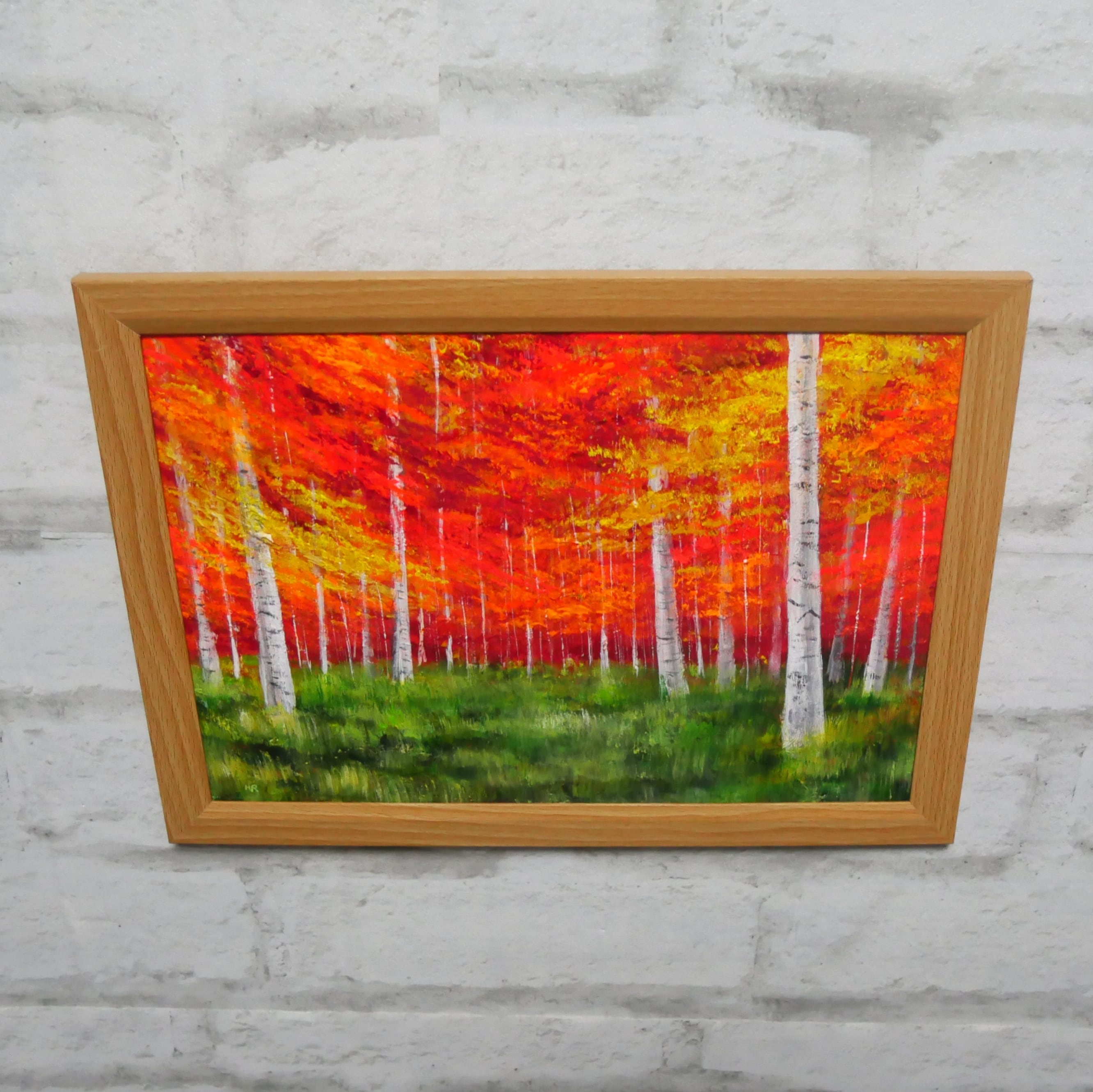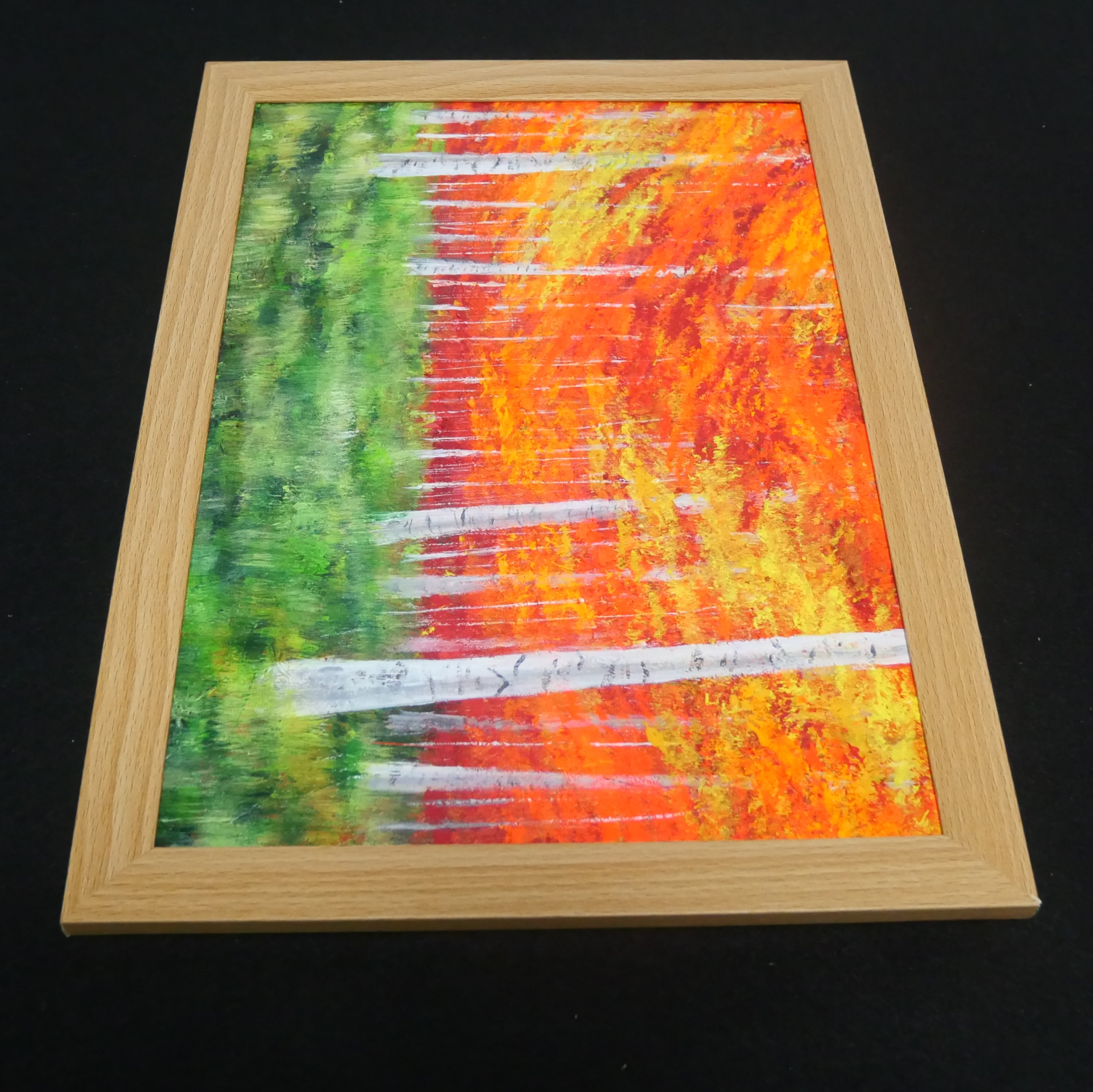 「白樺の紅葉」は、赤と黄の美しい紅葉と白い白樺を描いた特別な油絵作品です。この風景画は、秋の訪れを感じさせ、見る人に心の安らぎを与え、特別な空間を演出してくれることでしょう。秋の深まりと共に、心温まるひとときを提供します。