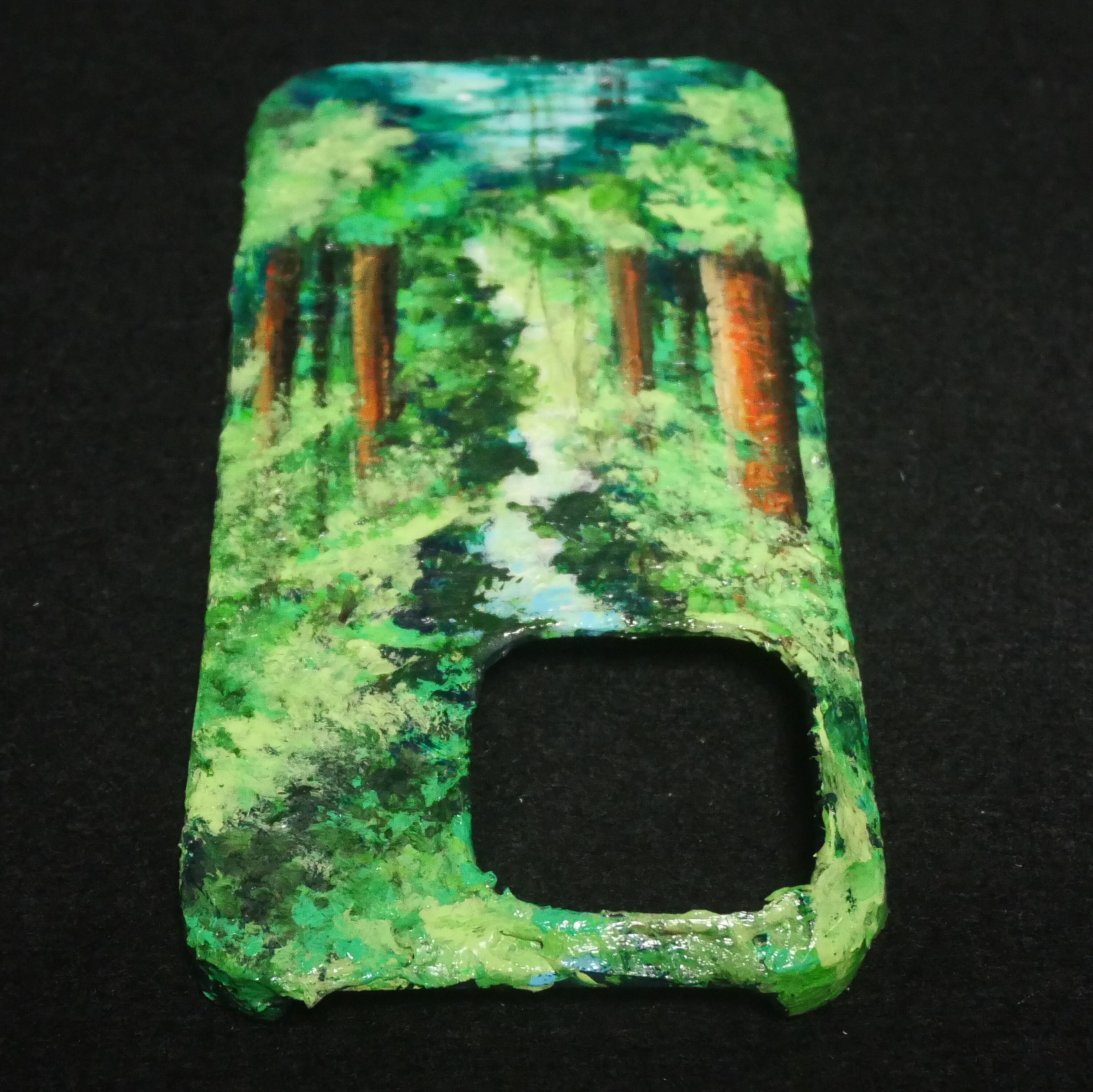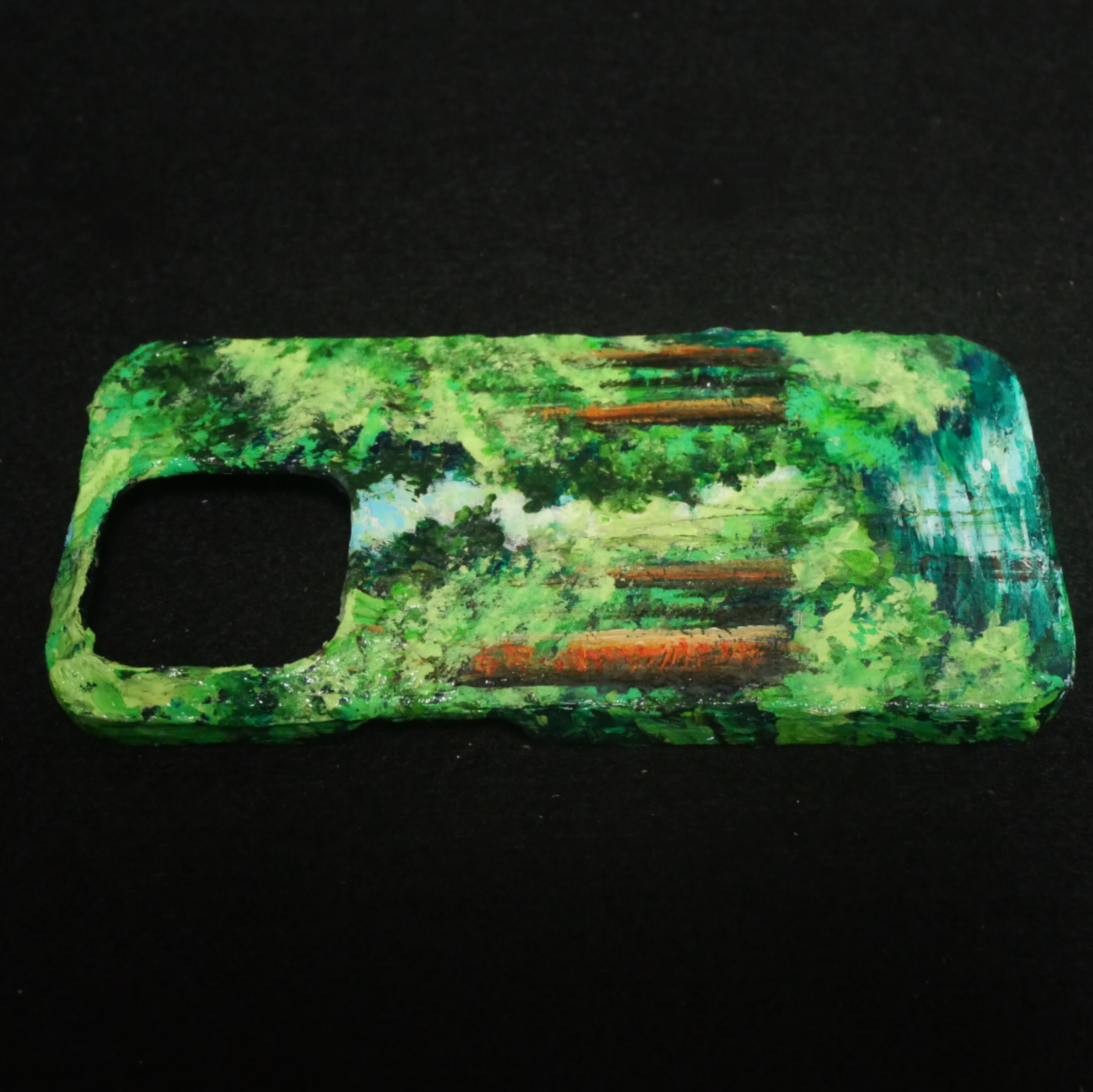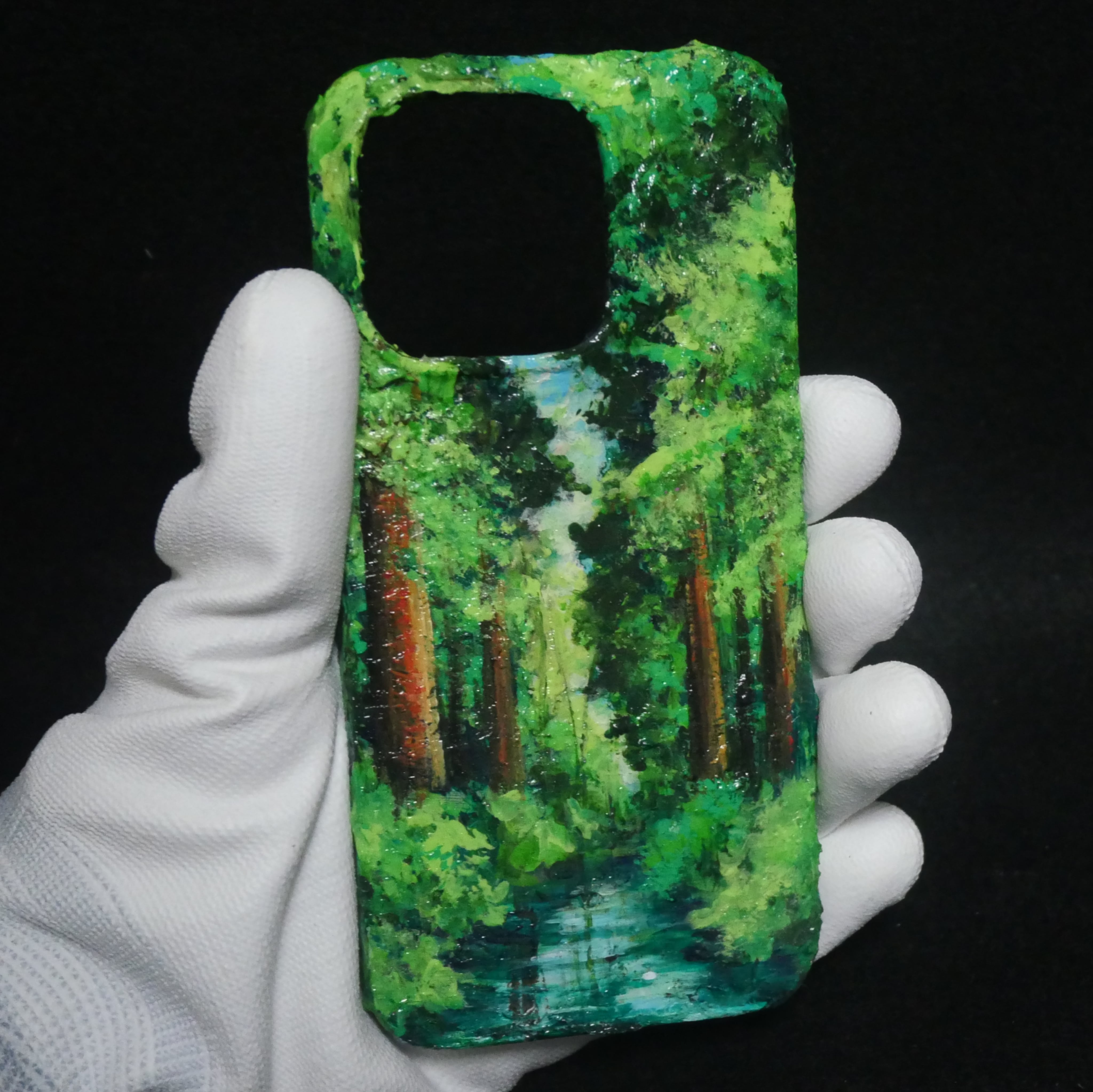 自然の美しさを手元で楽しめる油絵「森」が、iPhone 15 Pro用のクリアハードケースに仕上がりました。この作品は、鮮やかな緑に覆われた森と静かに流れる川の風景を、上質な油絵の具【ホルベイン】で丁寧に描き出しています。見ているだけで癒される、そんな魅力を持ったデザインです。