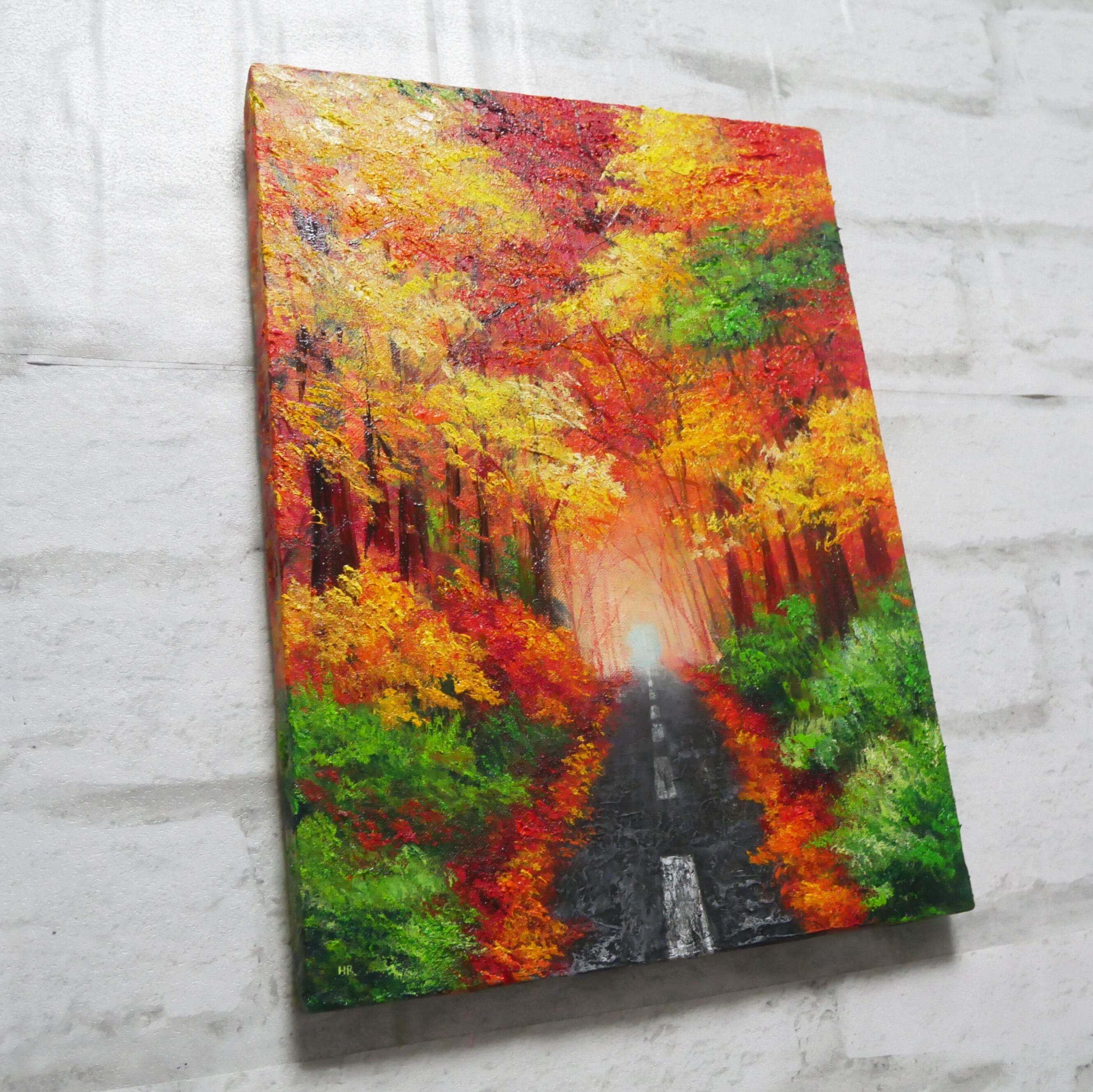 「紅葉の道」という油絵は、秋の美しさを余すところなく表現した作品です。道路と森道が交差する風景を描き、緑色、赤色、黄色、オレンジといった色彩が織りなす鮮やかな紅葉が、見る人の心を惹きつけます。