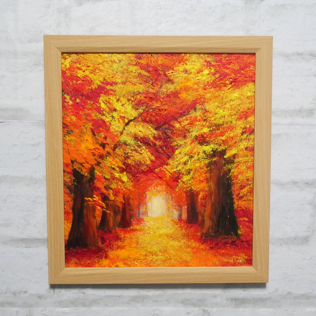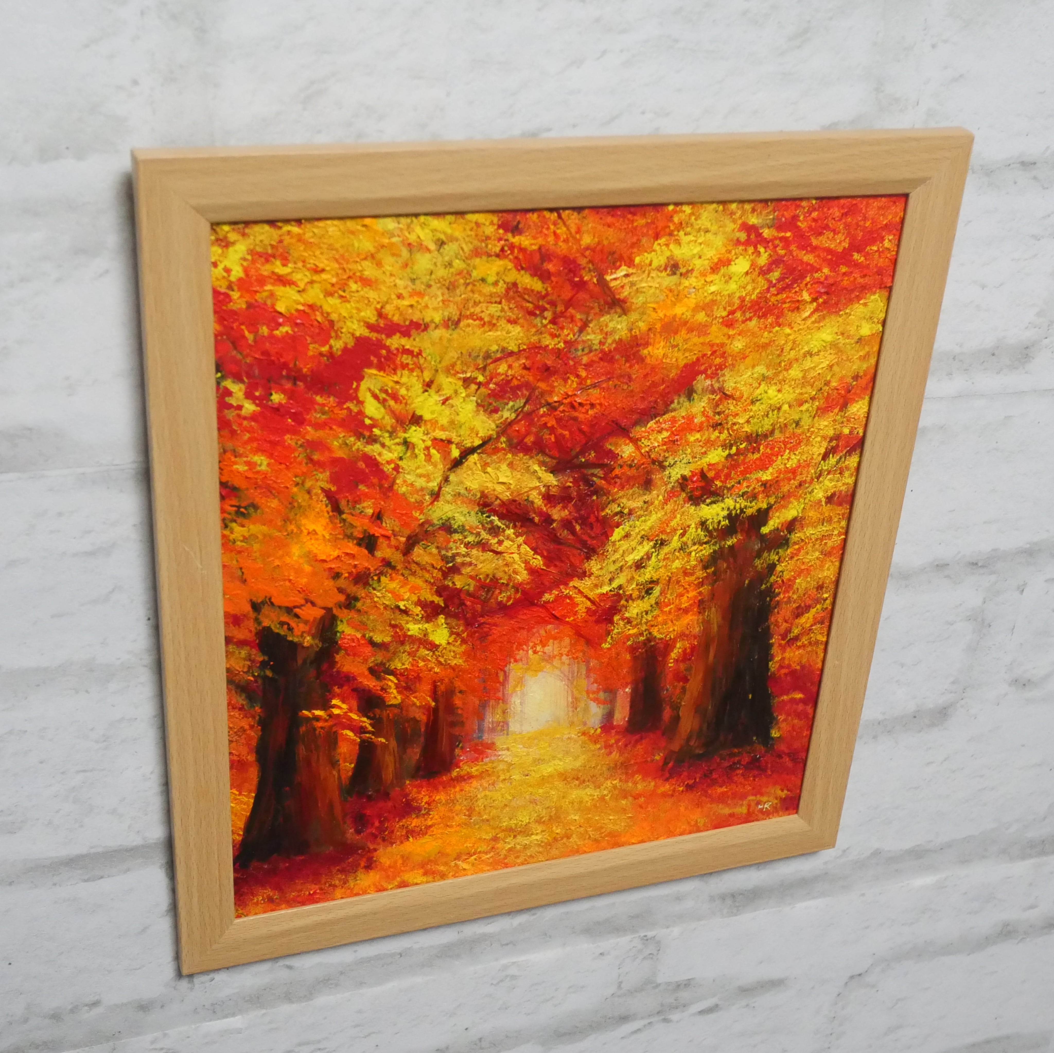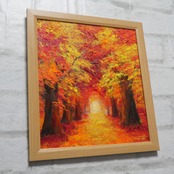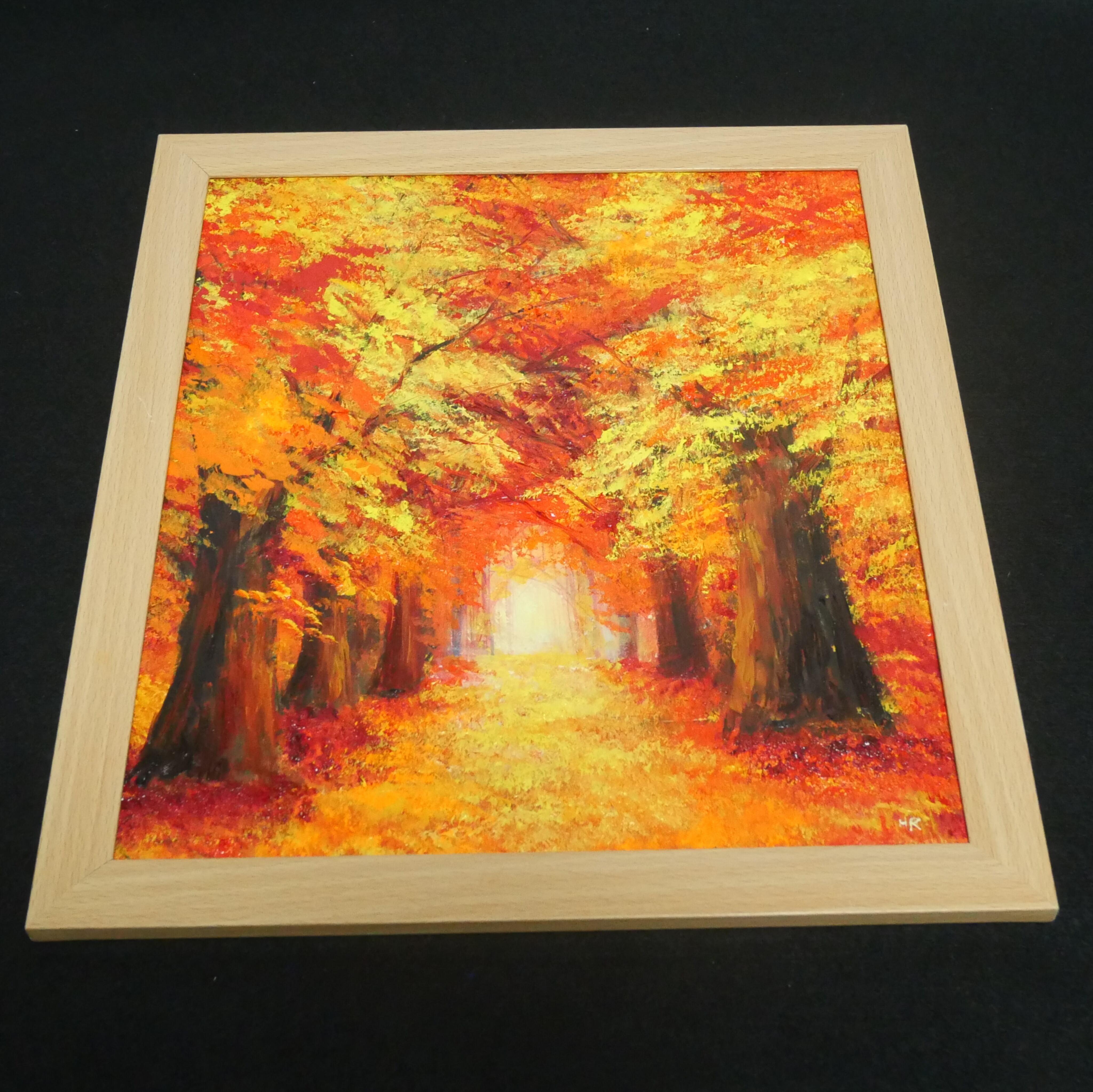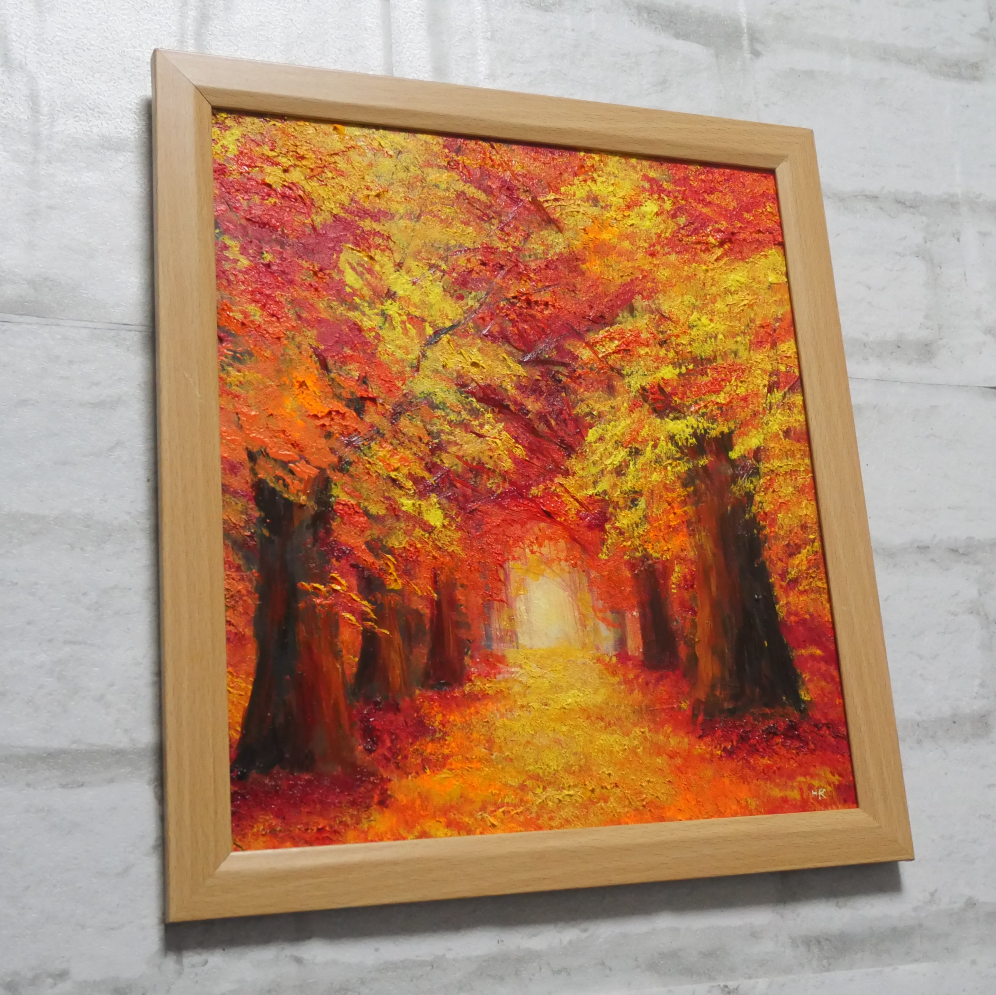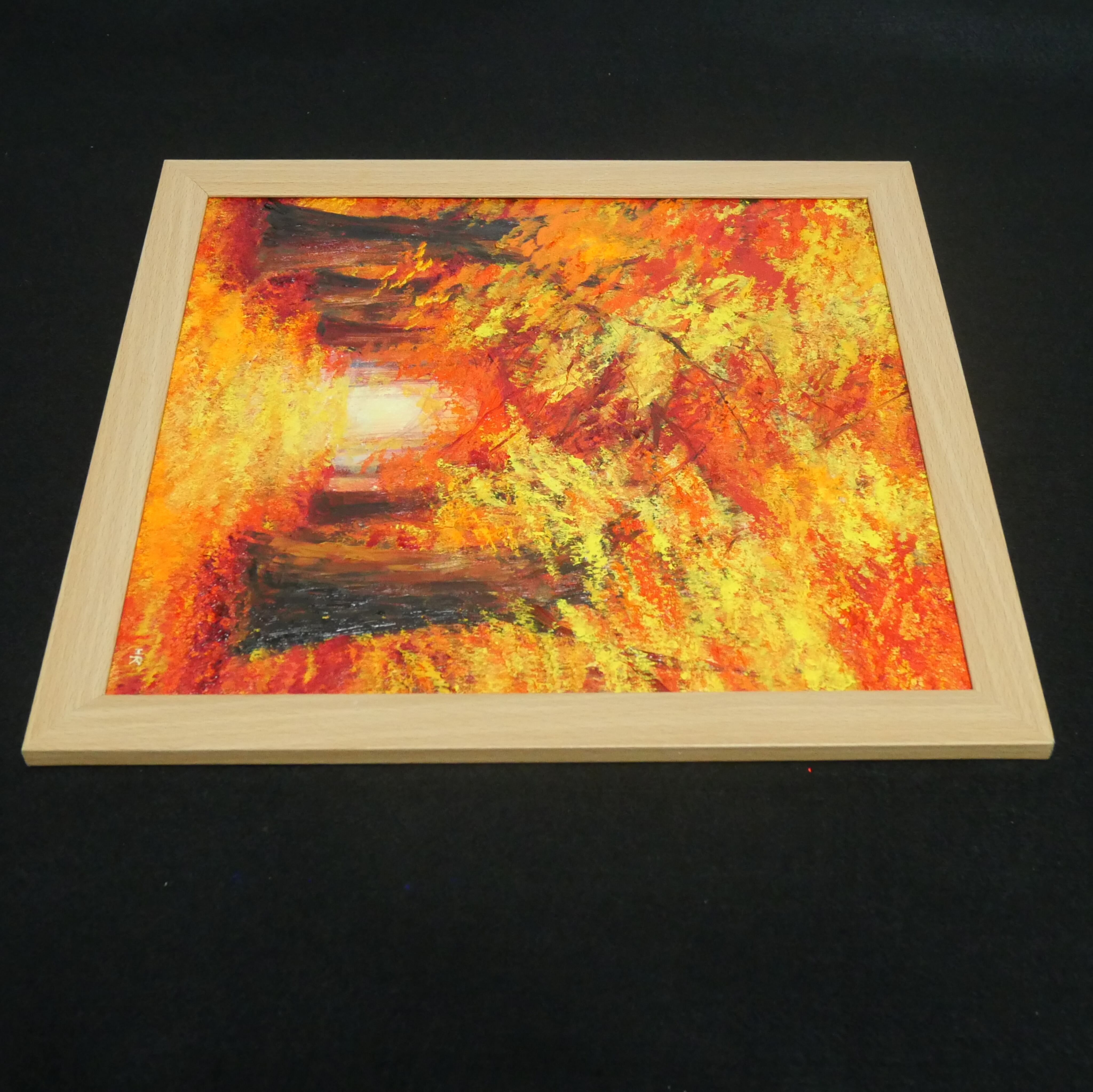 紅葉の美しい秋の風景を描いた油絵。枯れ葉の色合いや光の表現が秋の深い森を思わせる、美しい作品です。モチーフとして選ばれた秋・森・紅葉の要素が見事に融合し、見る人を心地よい幻想の世界に誘います。絵画を眺めるだけで、秋の爽やかな風を感じることができます。