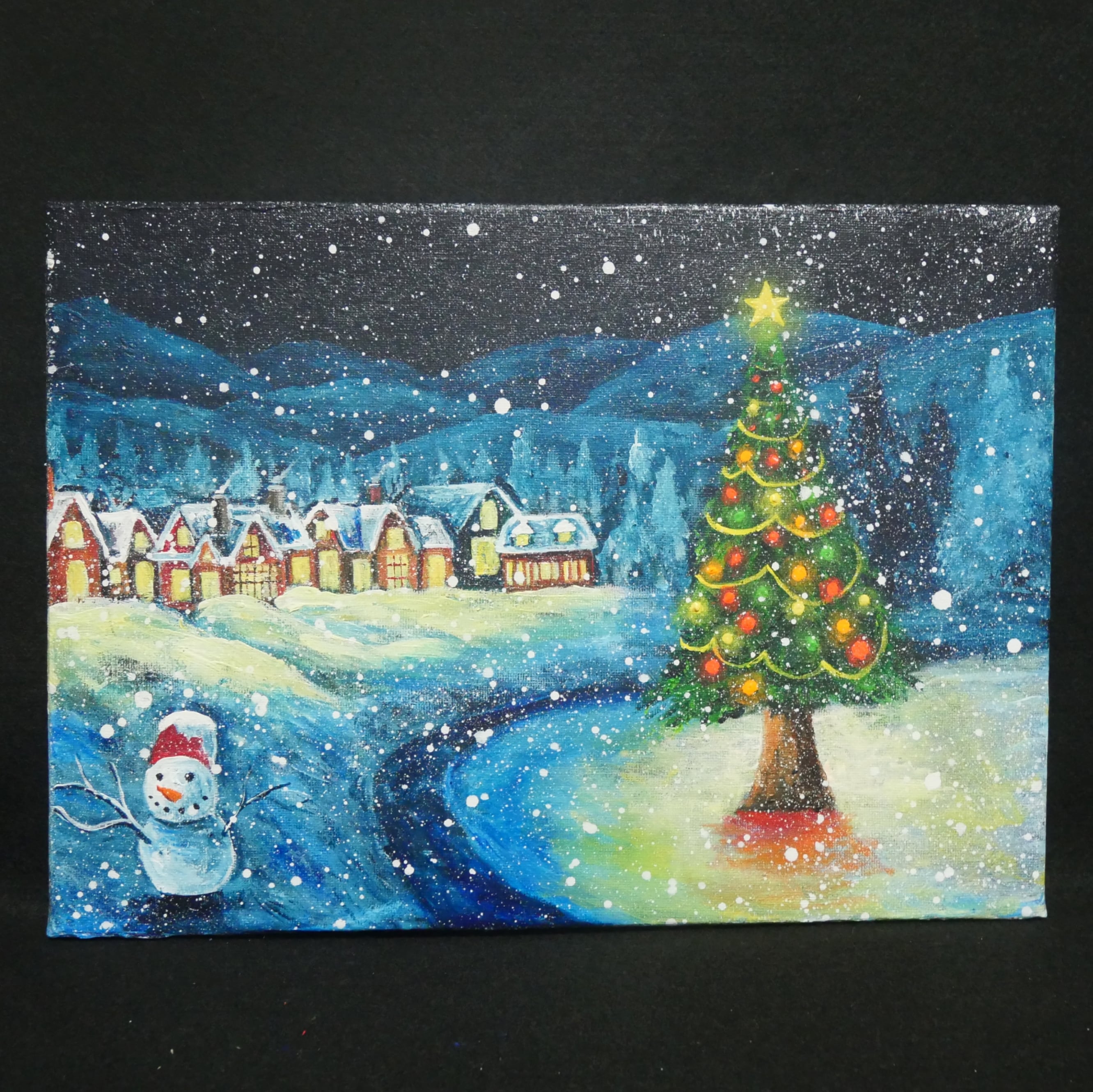 「クリスマス村」は、雪に覆われた冬の景色を背景に、右側には華やかなクリスマスツリー、左側には愛らしい雪だるまが描かれた温かみのある油彩画です。この作品は、小さな村のほっこりとしたクリスマスの雰囲気を届ける一枚で、見る人の心を和ませ、クリスマスの喜びを感じさせてくれます。
