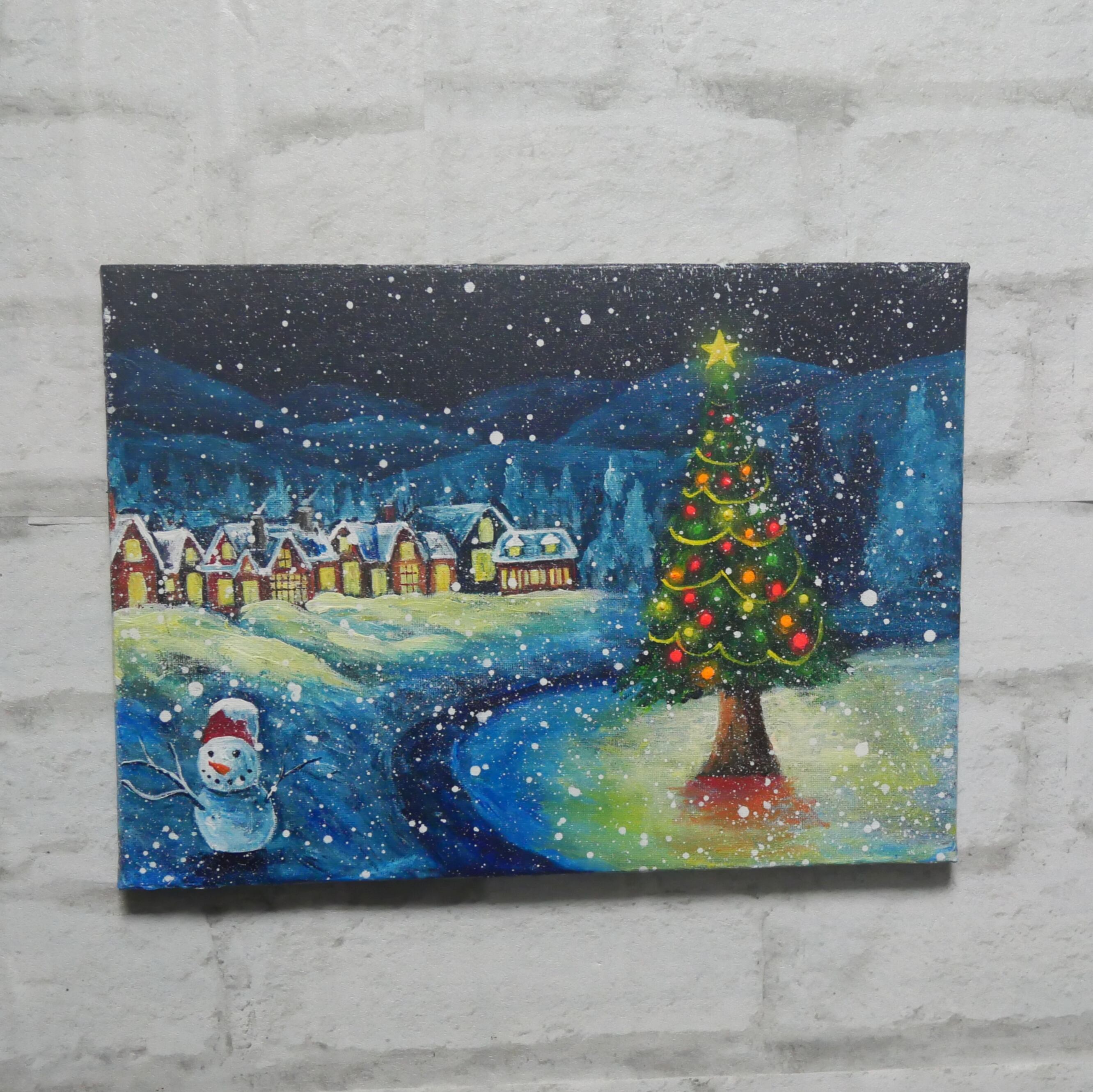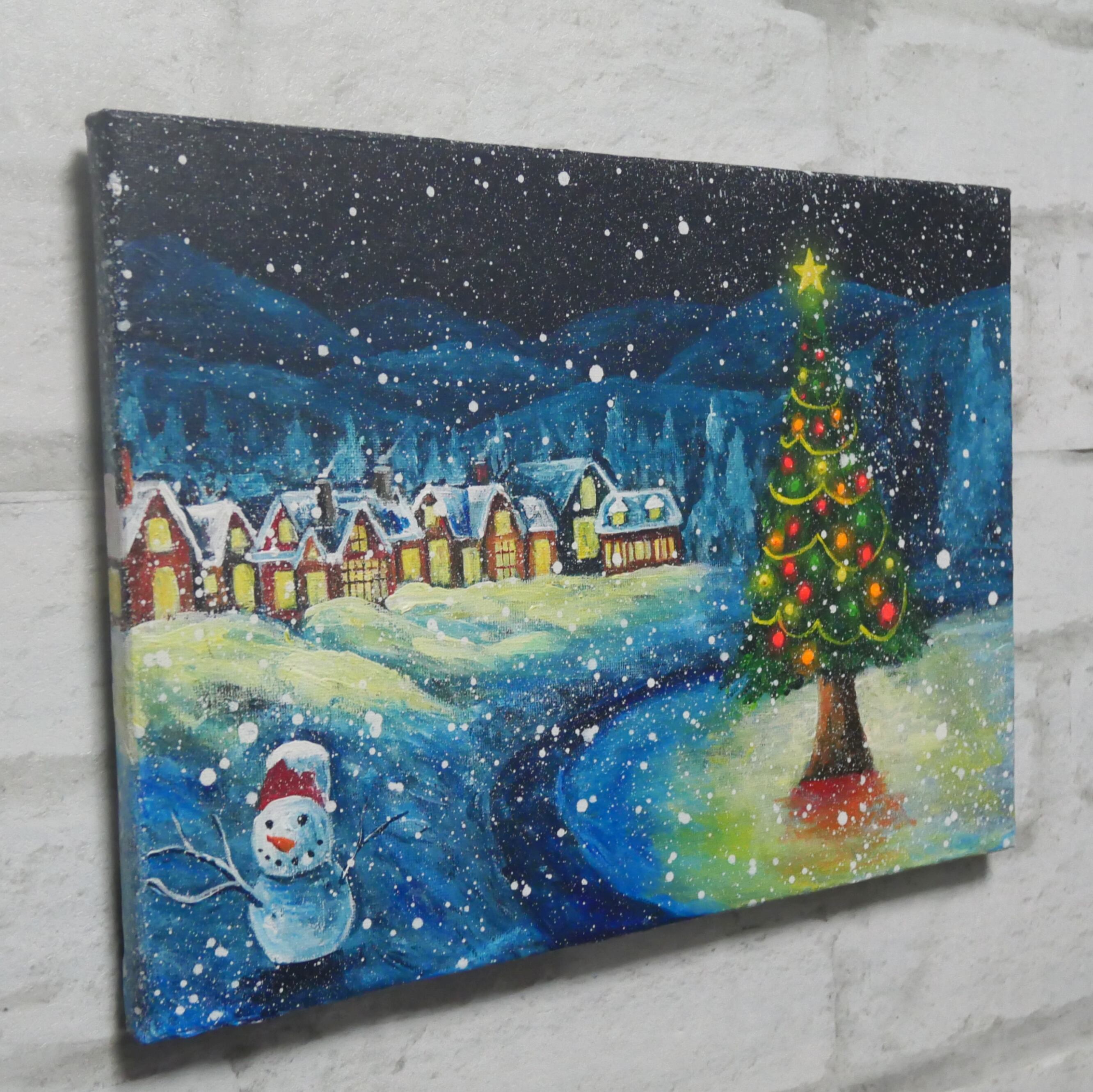 冬の訪れと共に、その美しい景色が心に響くこの油絵は、リビングや玄関など、クリスマス時期の装飾にぴったりです。クリスマスツリーや雪だるまなど、冬の定番モチーフが融合したこの作品は、温かく暖かな家族のひとときを想起させてくれるでしょう。
