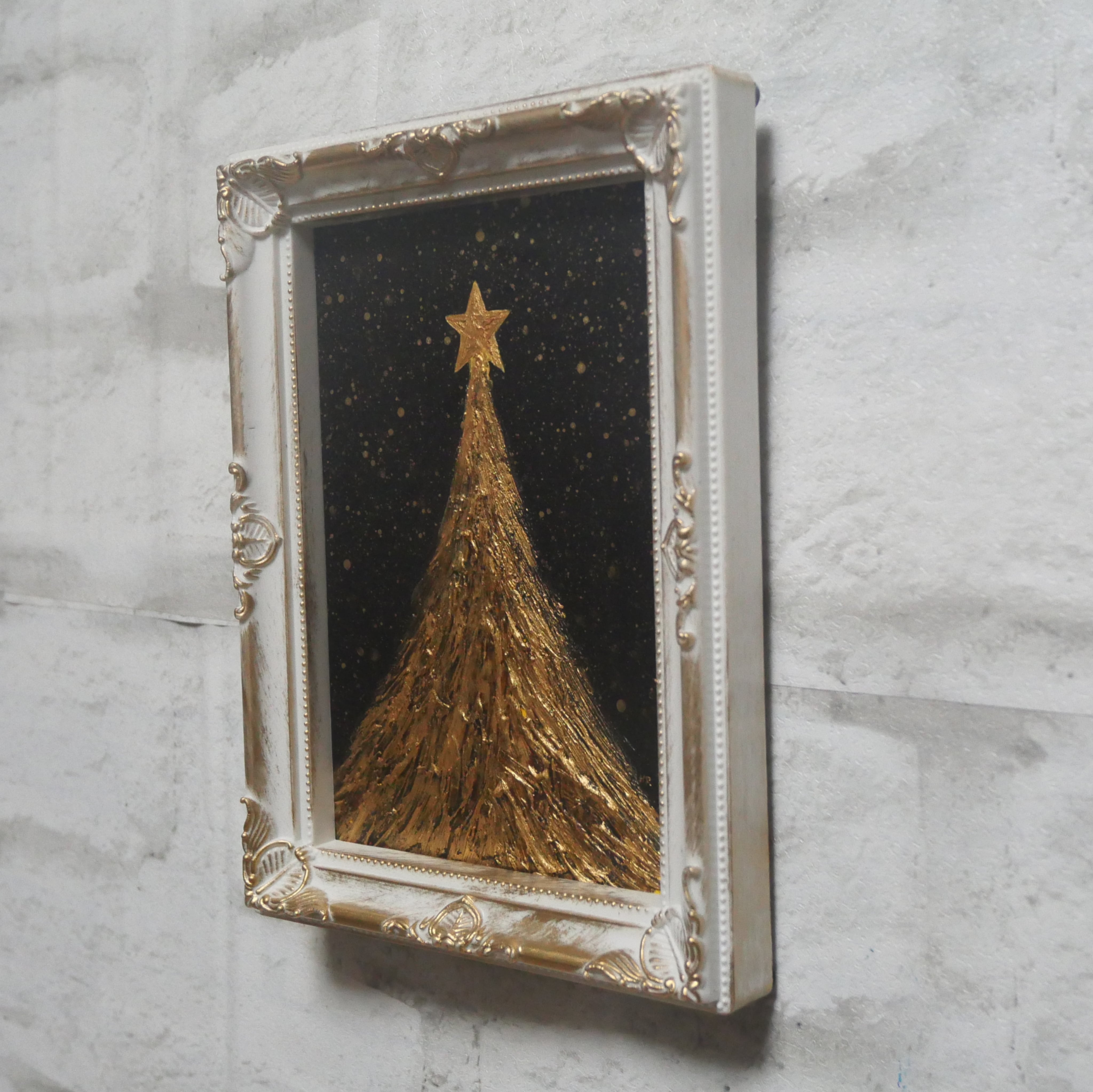 【作品名】:油絵 画 ミニ絵画【黄金クリスマスツリー】