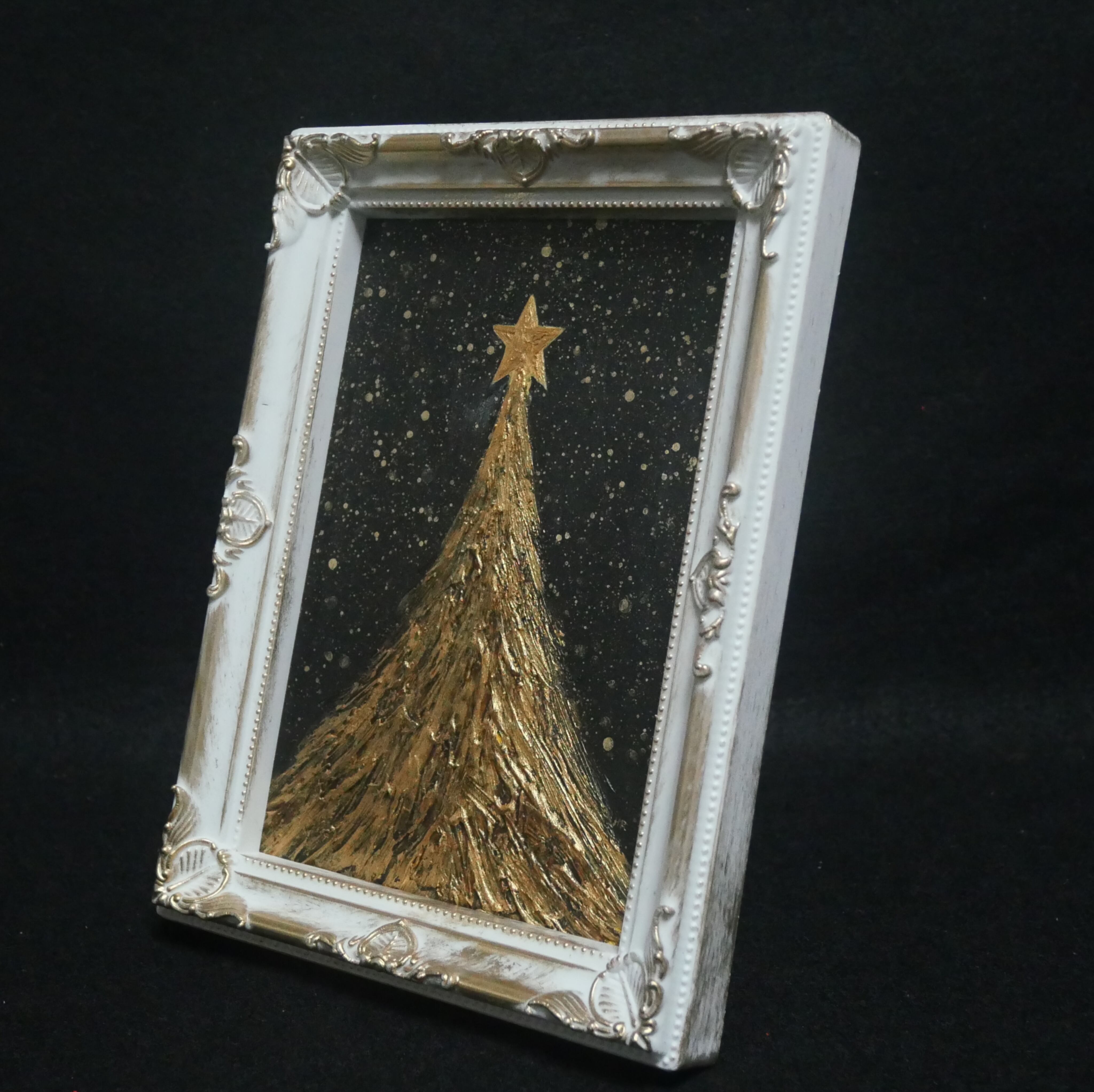 「黄金クリスマスツリー」は、幻想的な黒い背景に金色の雪が舞い降り、輝くクリスマスツリーが描かれた美しいミニ絵画です。クリスマスの華やかさと温かみを感じさせるこの作品は、贈り物やクリスマスのデコレーションに最適な一枚です。