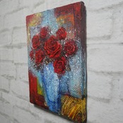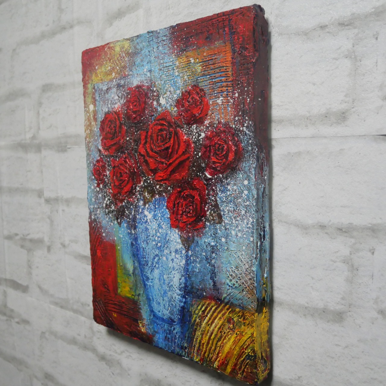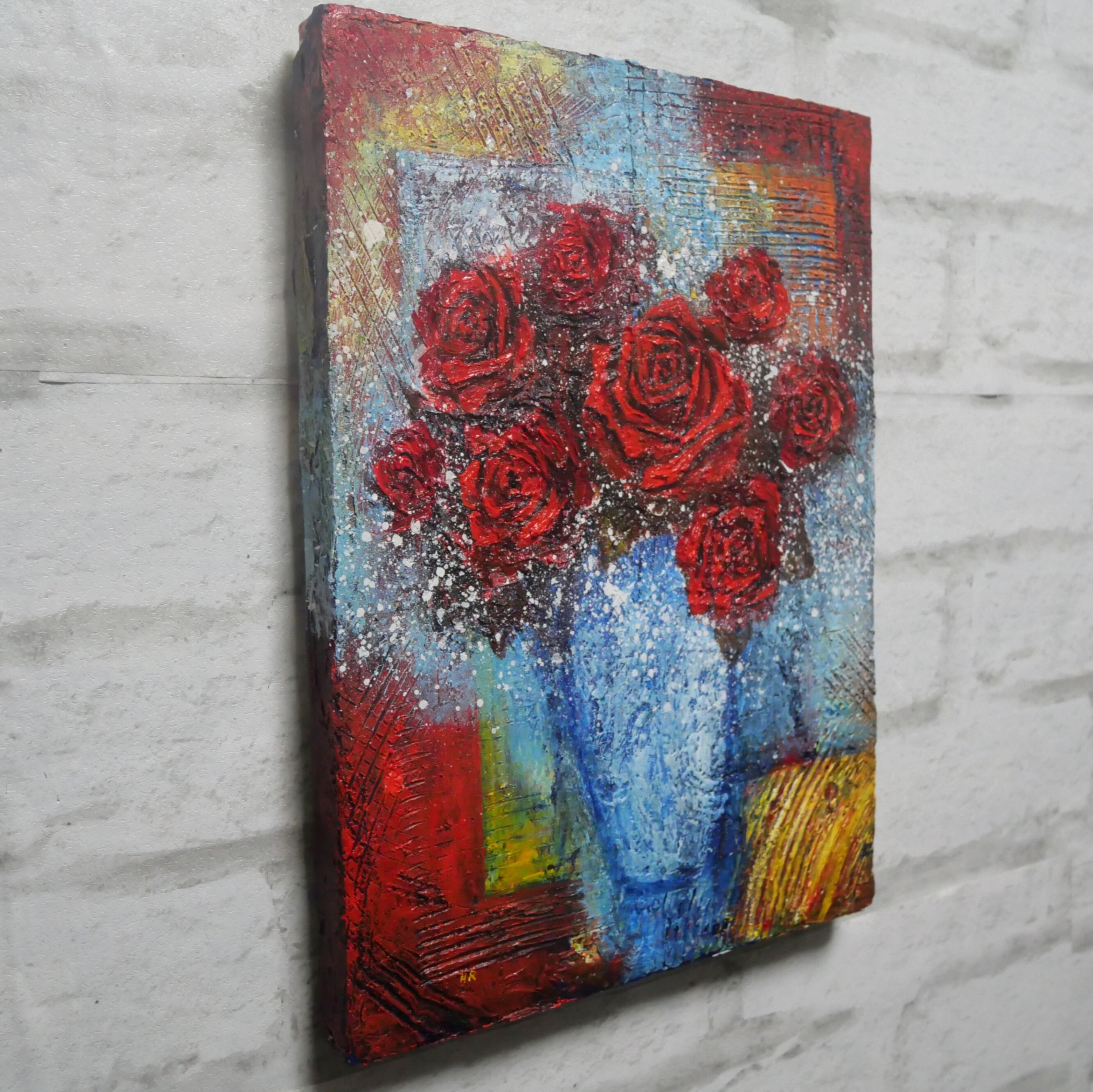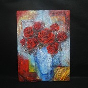 「薔薇」は、青と黄、オレンジ、赤の抽象画風の背景に美しく描かれた赤い薔薇が目を引く、一際華やかな作品です。背後にかすみ草を添えることで、情熱的な赤い薔薇の存在感が一層際立ち、視覚的な美しさとともに心に響く特別な一枚に仕上げられています。