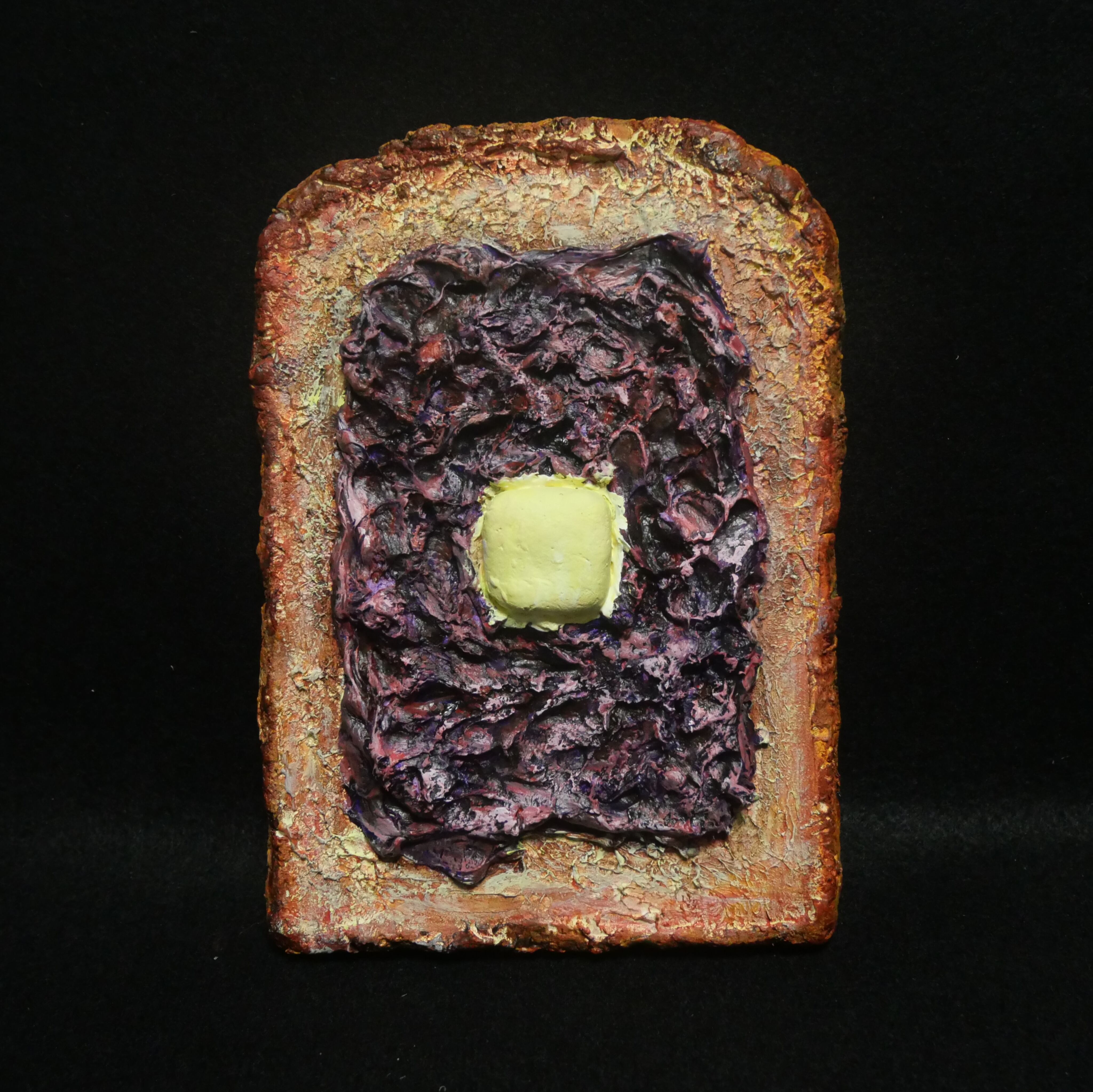 「小倉トースト」は、トーストの形をしたアートパネルに、豊かな色彩で描かれたユニークな作品です。大胆に中心に塗られた油絵の具があんこを模し、その上にはバターのような質感が表現されています。カフェや家庭のリビングに飾るのにぴったりな、心温まるデザインです。