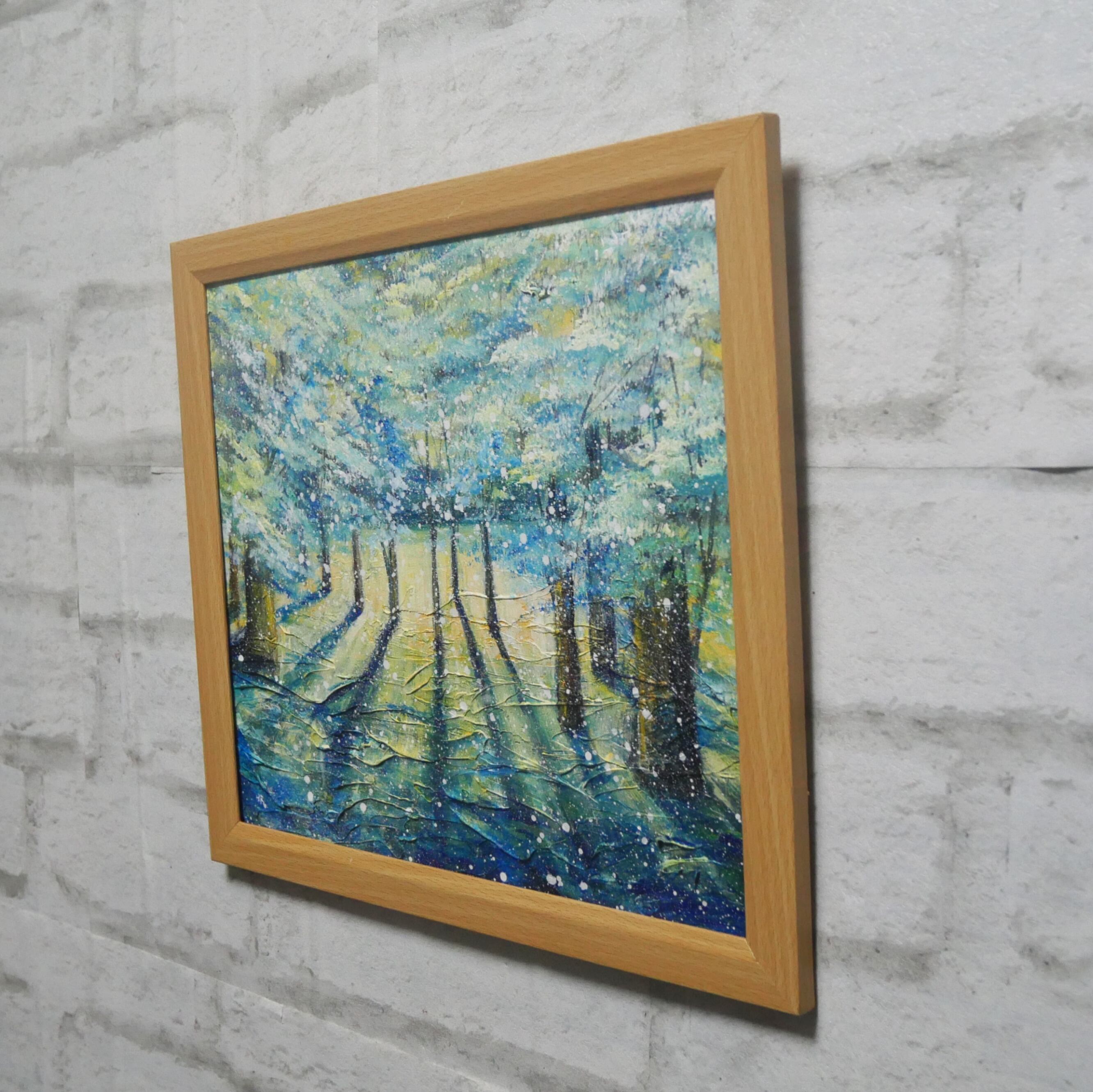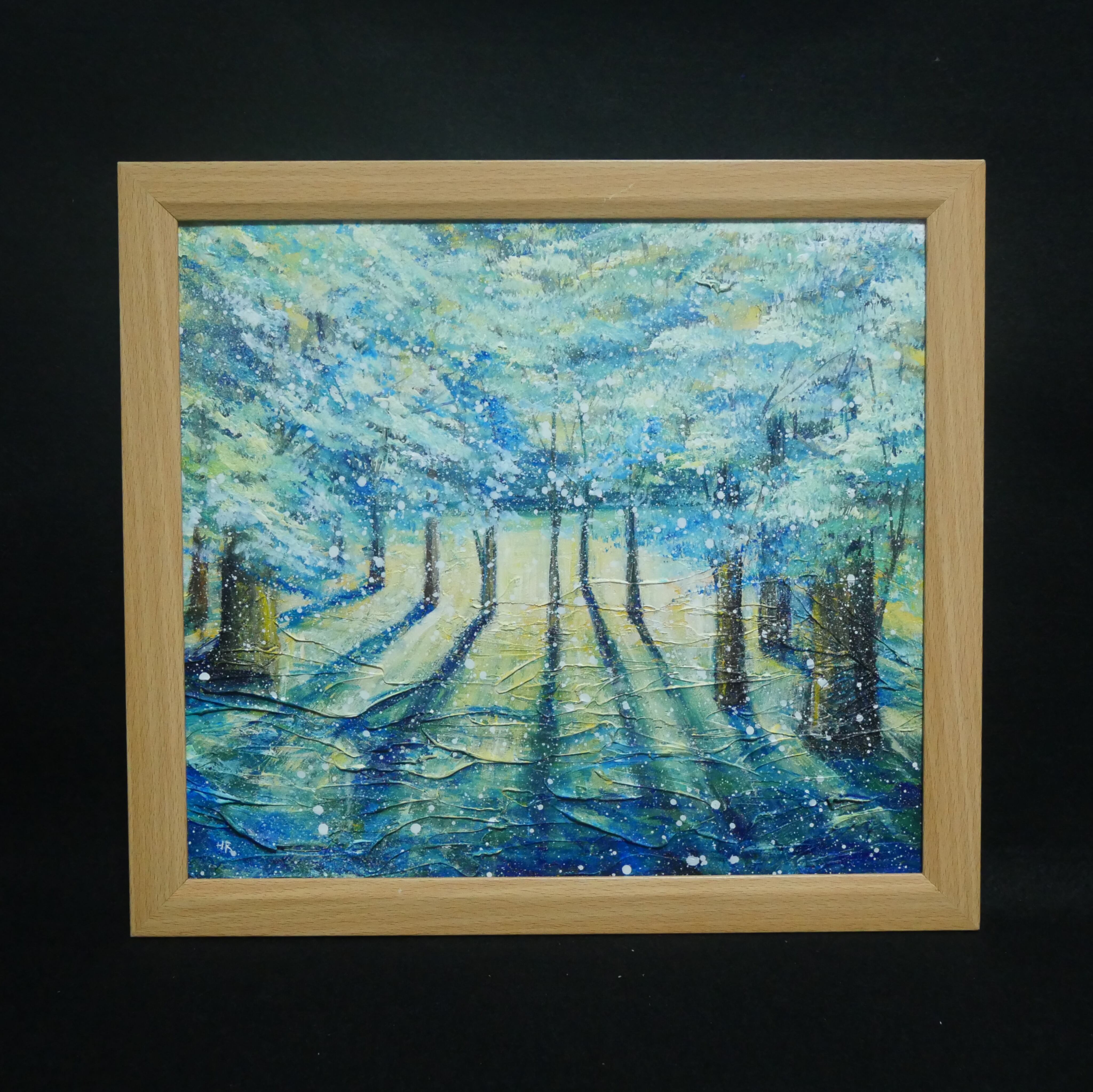 この油絵は242mm×272mmのサイズで、様々なインテリアに合わせやすいコンパクトなフォーマットです。お部屋やオフィスに飾ることで、冬の魅力を感じながら、温かい陽射しを楽しむことができるでしょう。また、壁にかけることで、冬の透明感ある空気感を演出し、穏やかな雰囲気を添えてくれます。