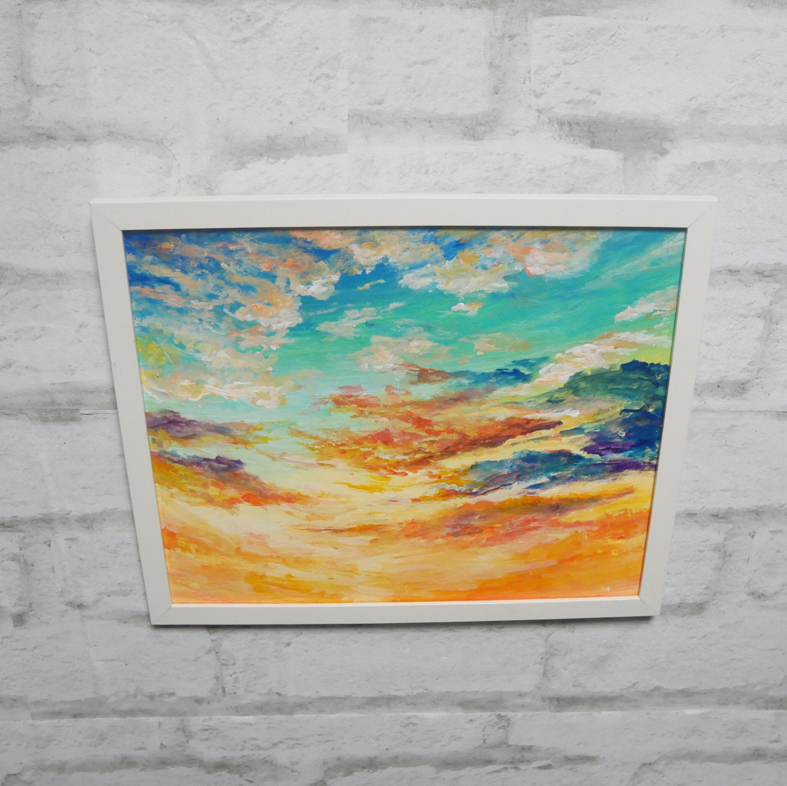 「朝焼けの空」は、青とブライトアクアグリーン、そして黄色、オレンジ、赤が調和し、幻想的な朝の風景を描いた美しい油彩作品です。この一枚は、明けゆく空と雲のコントラストが織りなす特別な瞬間を切り取っており、観る人に心の安らぎと感動をもたらします。朝の柔らかな光が広がる様子は、日常の喧騒を忘れさせてくれることでしょう。