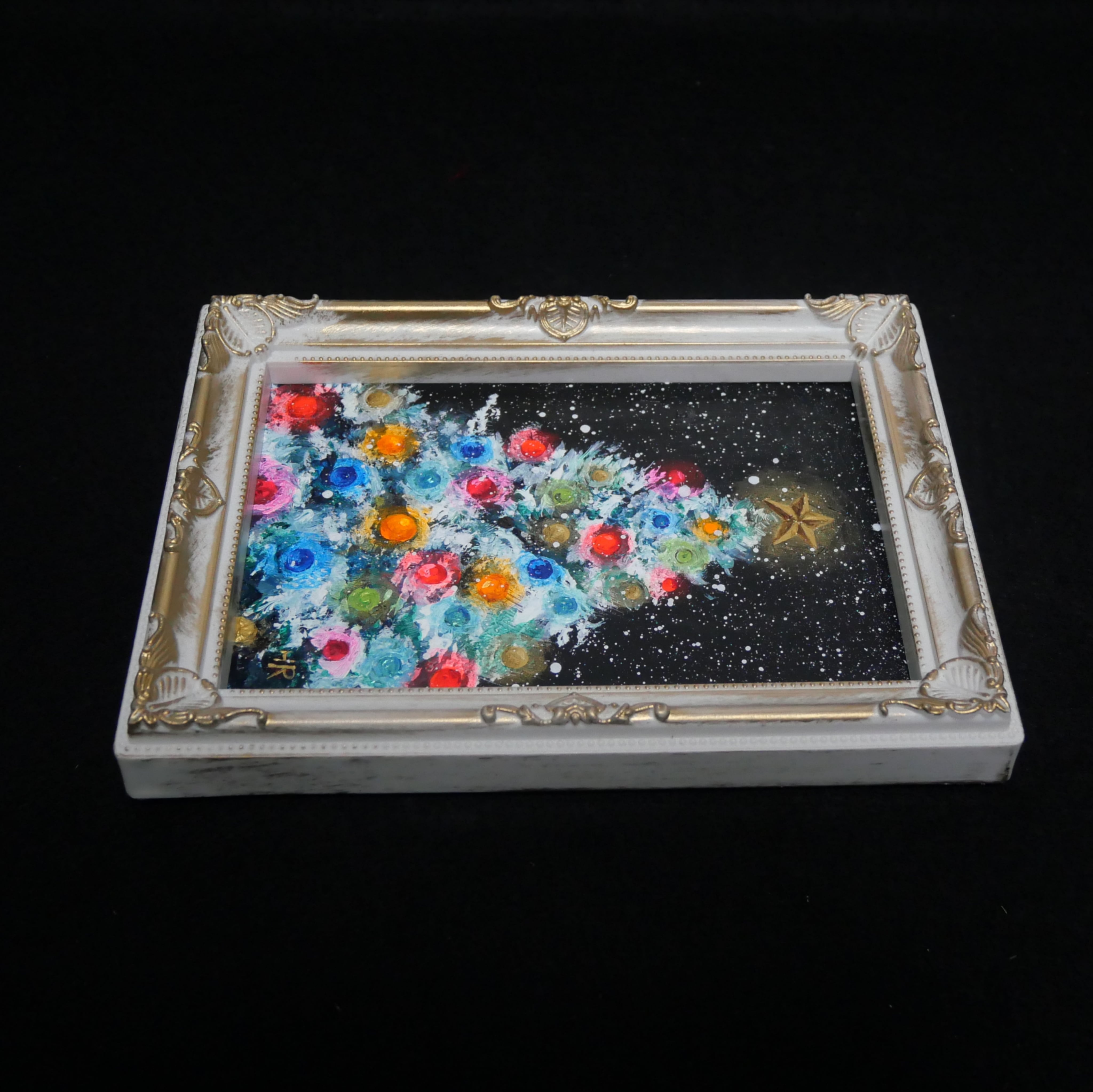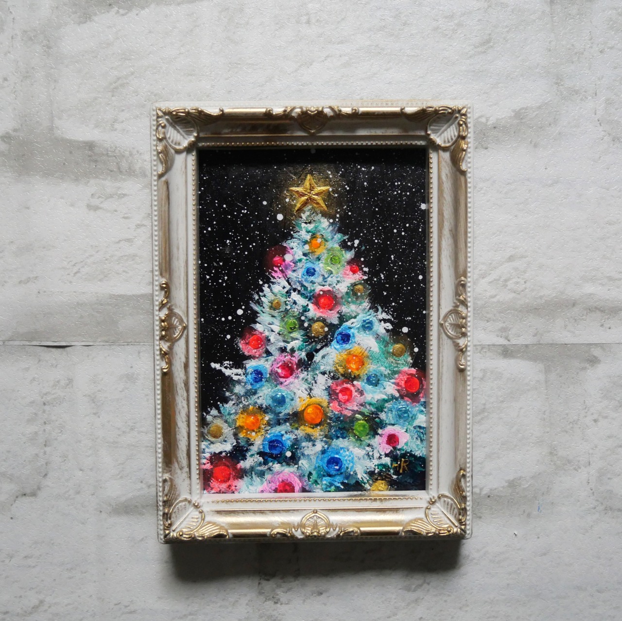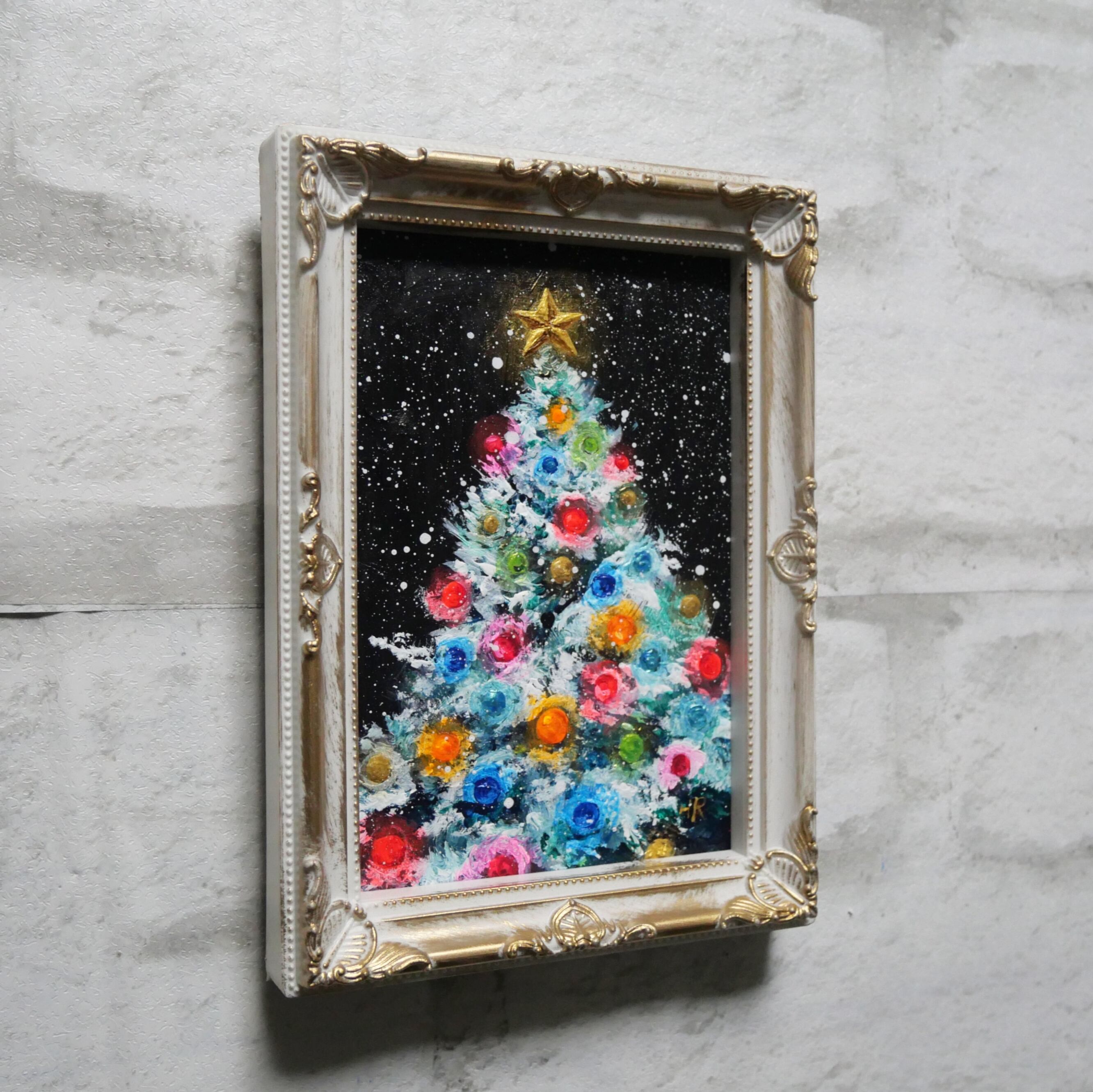 「雪のクリスマスツリー」は、黒を背景にした美しいクリスマスツリーを描いた特別な油彩作品です。この一枚は、雪が優雅に積もったクリスマスツリーにカラフルなオーナメントボール、そして金色のスターが輝き、特別な季節の雰囲気を存分に感じさせる作品です。降り注ぐ雪の中で、クリスマスの祝福を感じられること間違いなしです。