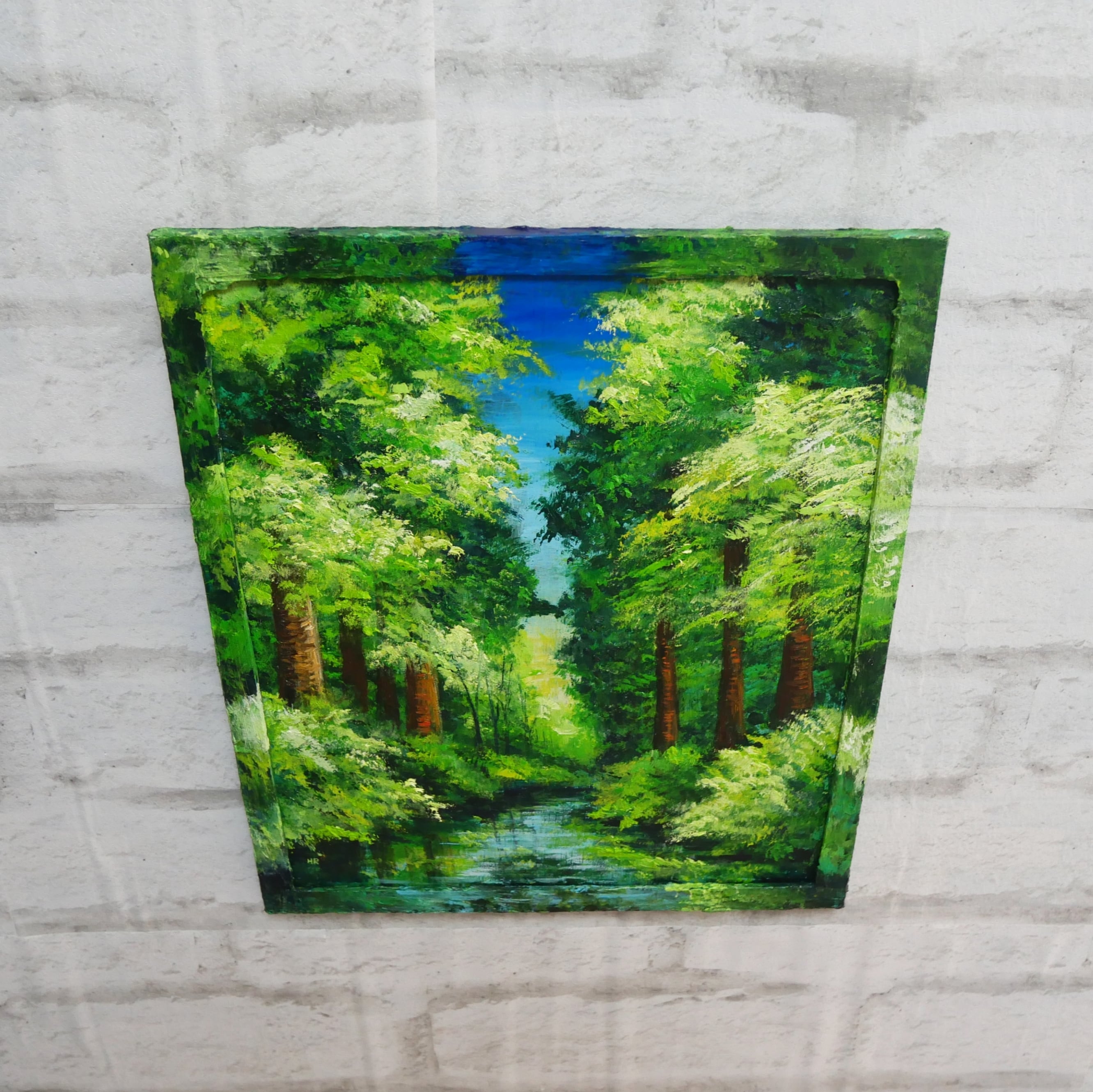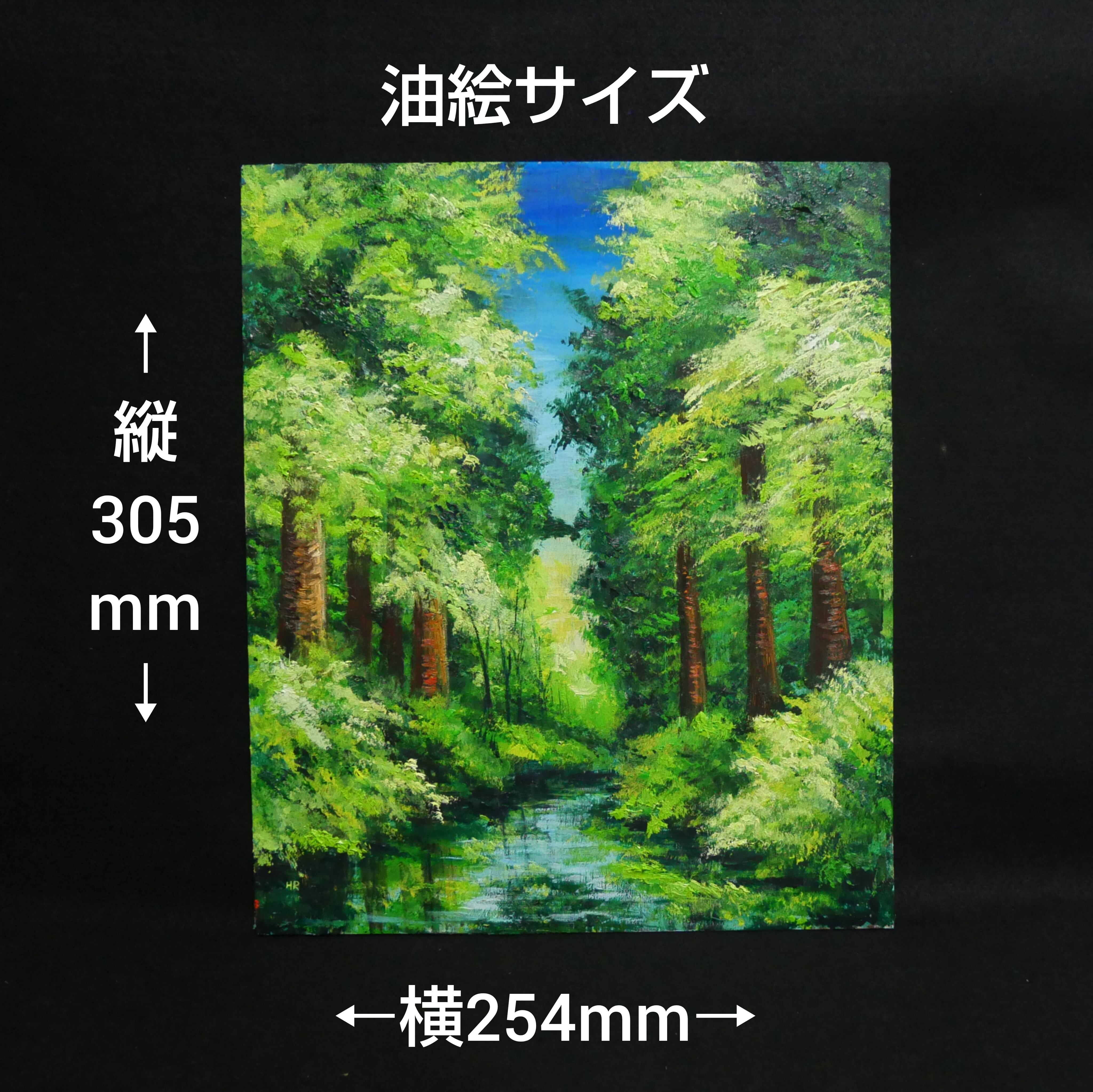 使用されている油絵具は高品質な【ホルベイン】で、その豊かな色彩と質感が見事に表現されています。この「新緑の川」が、あなたの生活空間に華やかさを加え、心豊かなひとときを提供します。