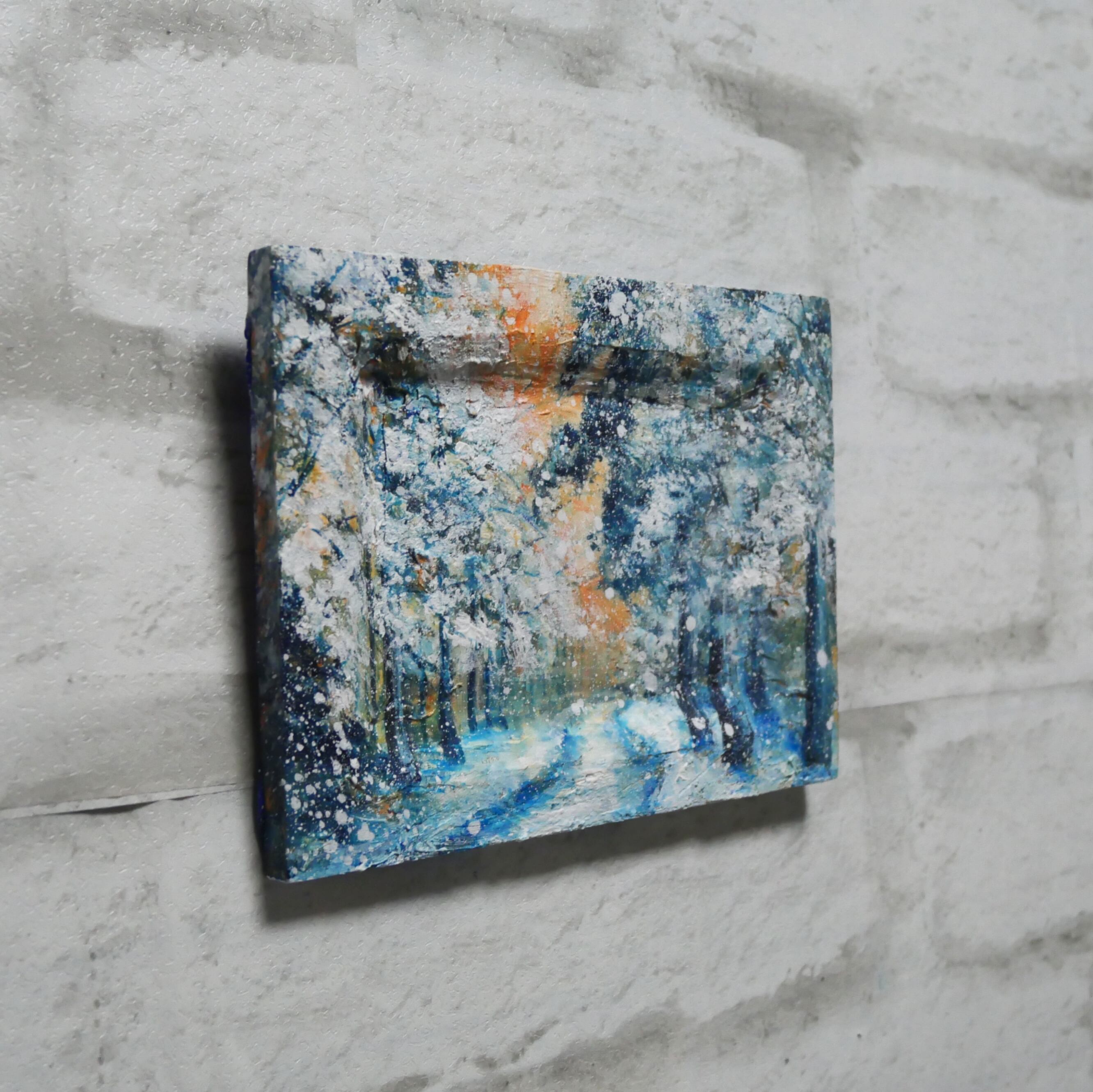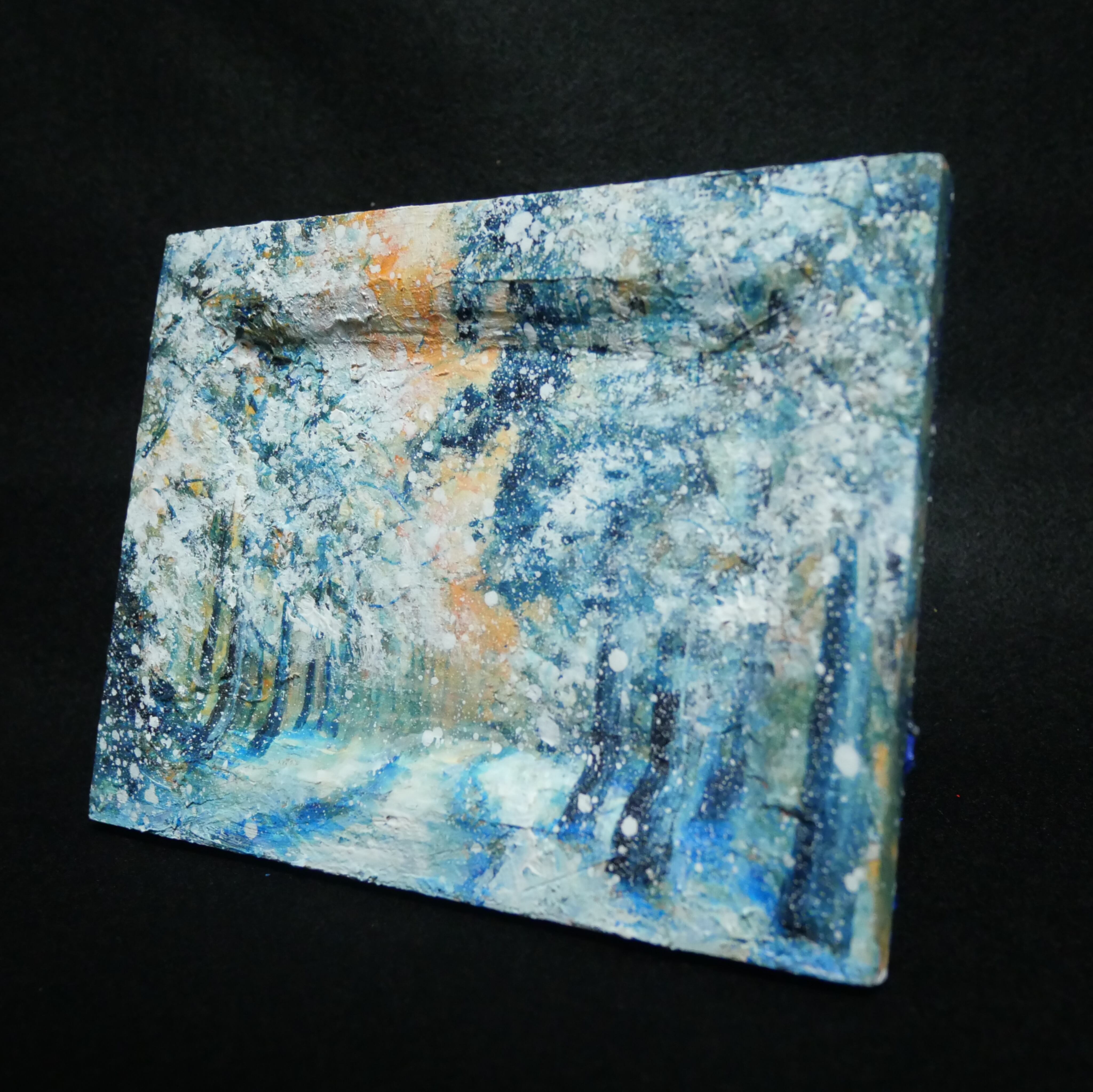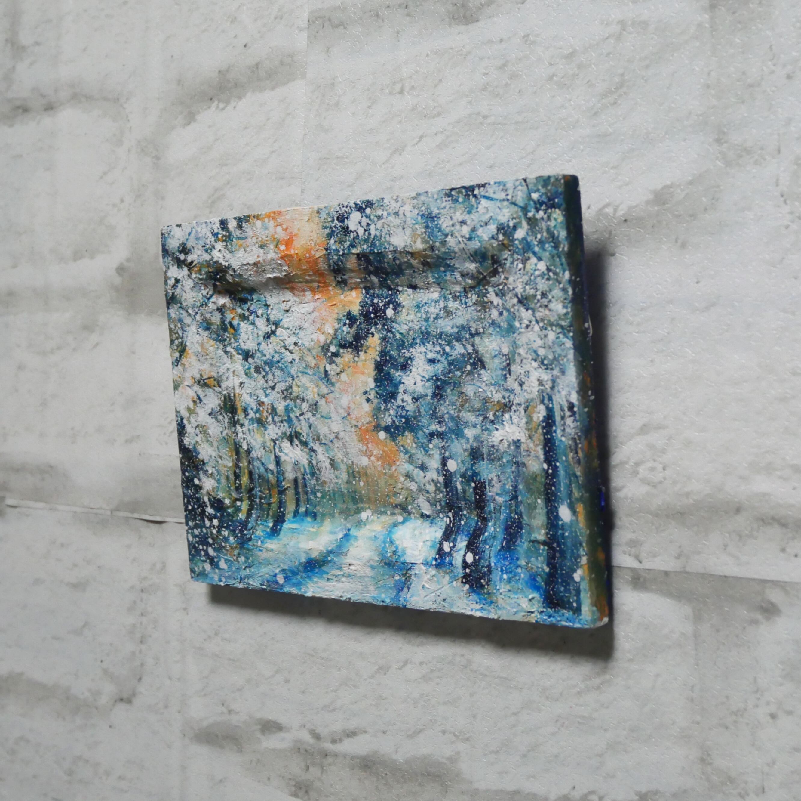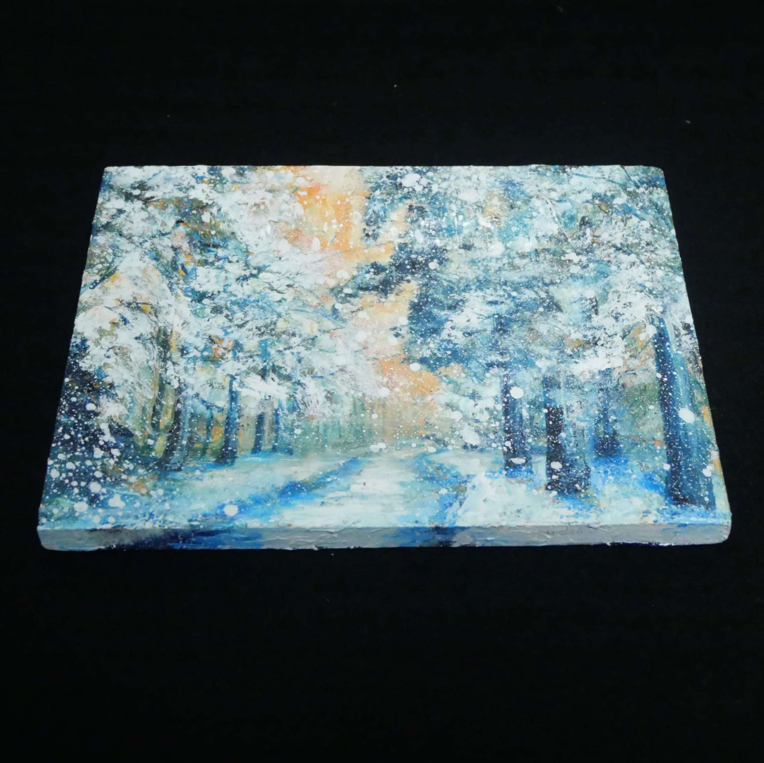 使用されている油絵具は高品質な【ホルベイン】とアクリル絵具【リキテックス】で、その豊かな色彩と質感が見事に表現されています。この「オレンジ空から降る雪」が、あなたの生活空間に心豊かな冬の景色を演出します。