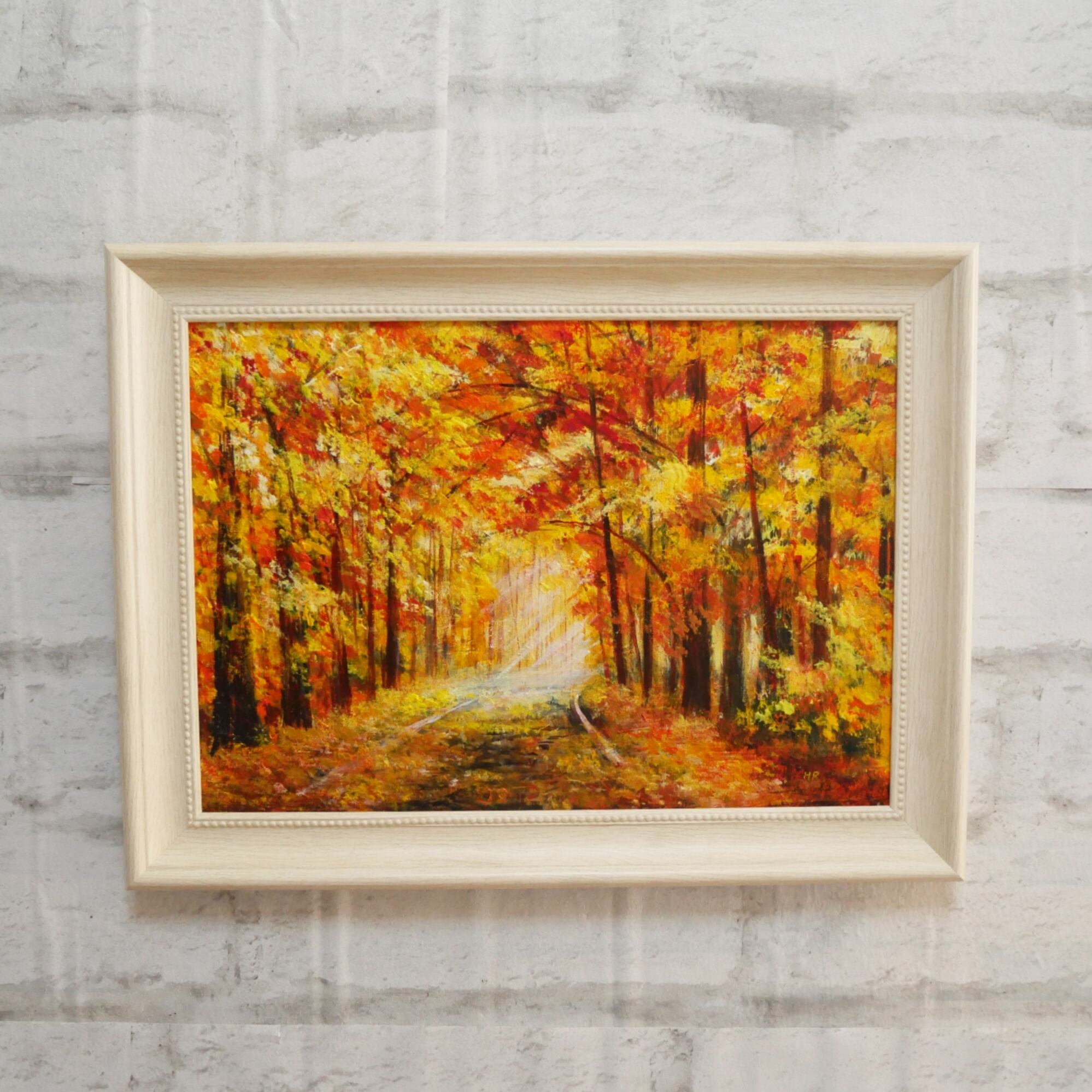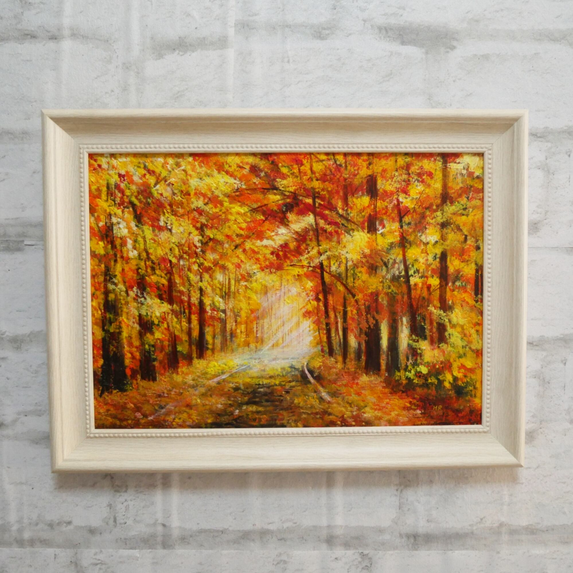 「銀杏並木」は、秋の色彩が美しく描かれた特別な油絵作品です。銀杏の落ち葉が舞う道路脇に広がる銀杏並木と、奥から差し込む淡い光が幻想的な風景を演出し、見る人に心温まる思い出を呼び起こします。高級感あふれる白の額縁が、作品の魅力を一層引き立て、どんなインテリアにも調和しやすいデザインです。