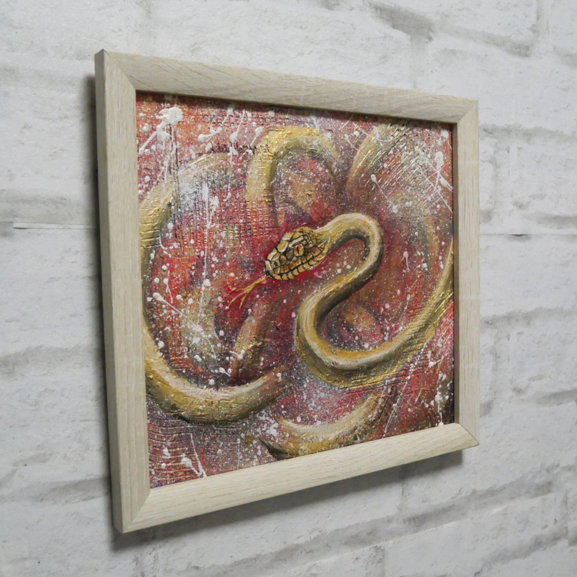 干支の象徴、黄金の蛇を描いた美しい油彩作品「巳年」。背景には情熱的な赤色と金色が広がり、その上に白い点々と模様が施されています。このアートは、2025年の巳年にぴったりで、飾ることで運気や金運、そして上昇をもたらすと信じられています。新年を共に迎えるにふさわしい特別な一枚です。