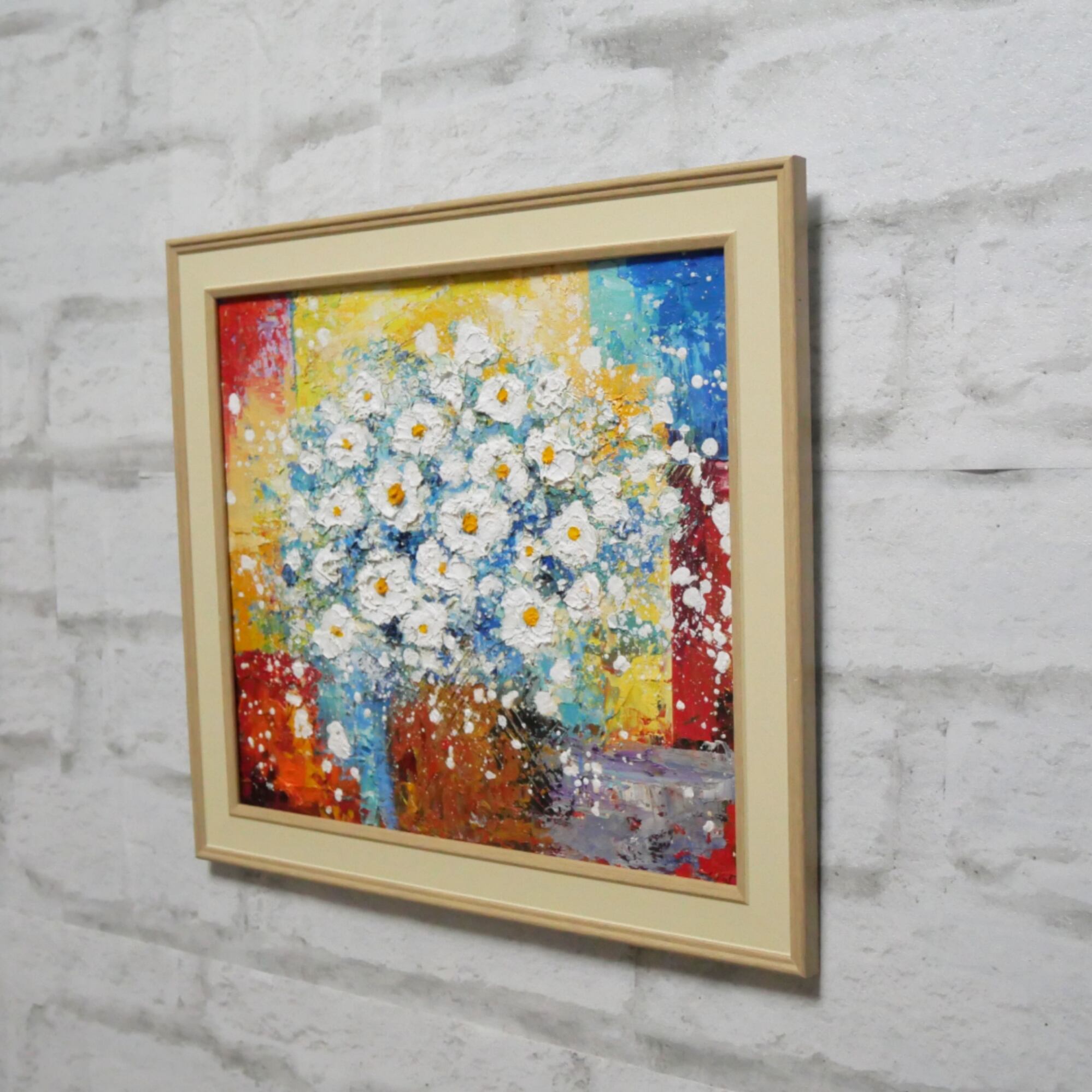 清らかな白いノースポールの花が、抽象的な背景と共に美しく描かれた油彩作品「白い花」。このアートは、そのシンプルでありながら深い美しさで、見る人の心に安らぎをもたらします。自然の優雅さを感じられる一枚で、インテリアに華やかさを添えてくれることでしょう。