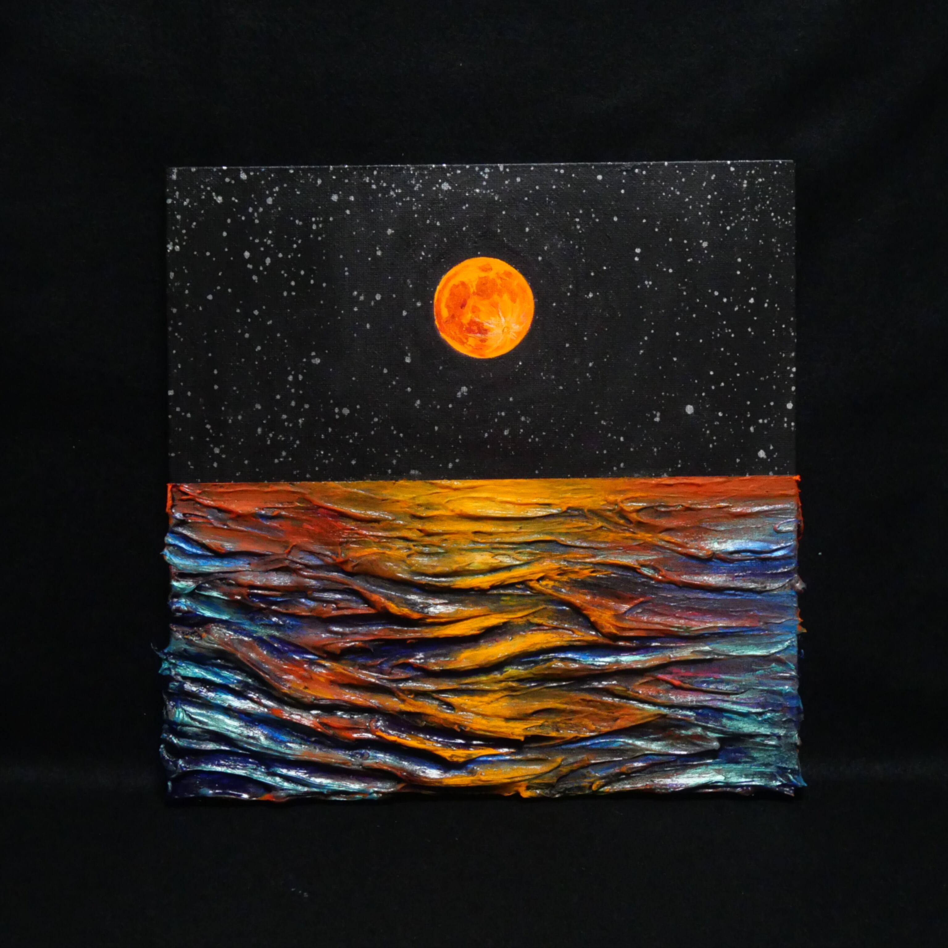使用している油絵の具は高品質な【ホルベイン】、アクリル絵の具には【リキテックス】、さらに特別なジェルメディウムを使用しています。このこだわりの素材が織りなす深みある色合いとテクスチャーが、この「オレンジ色の満月」をより魅力的な作品に仕上げているのです。