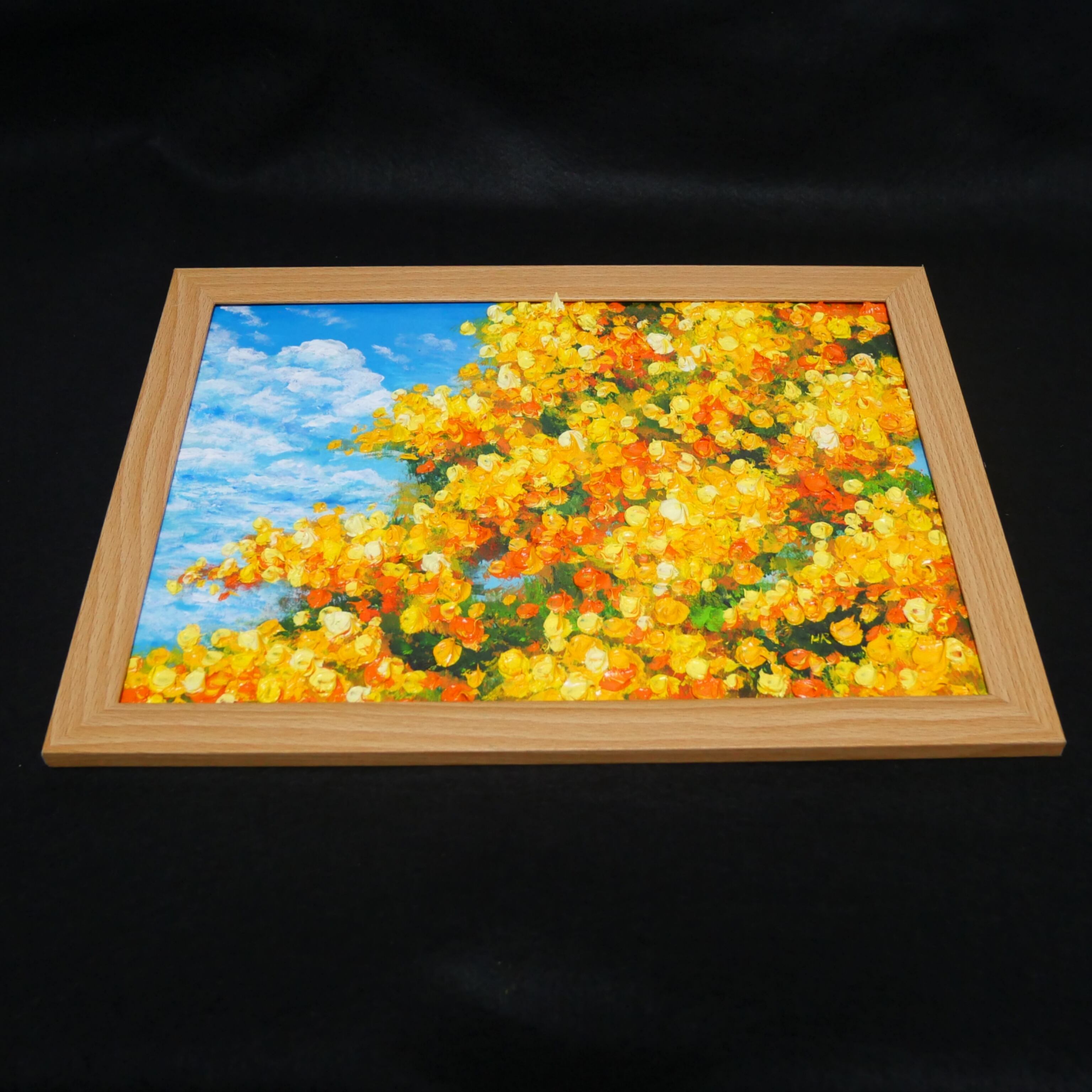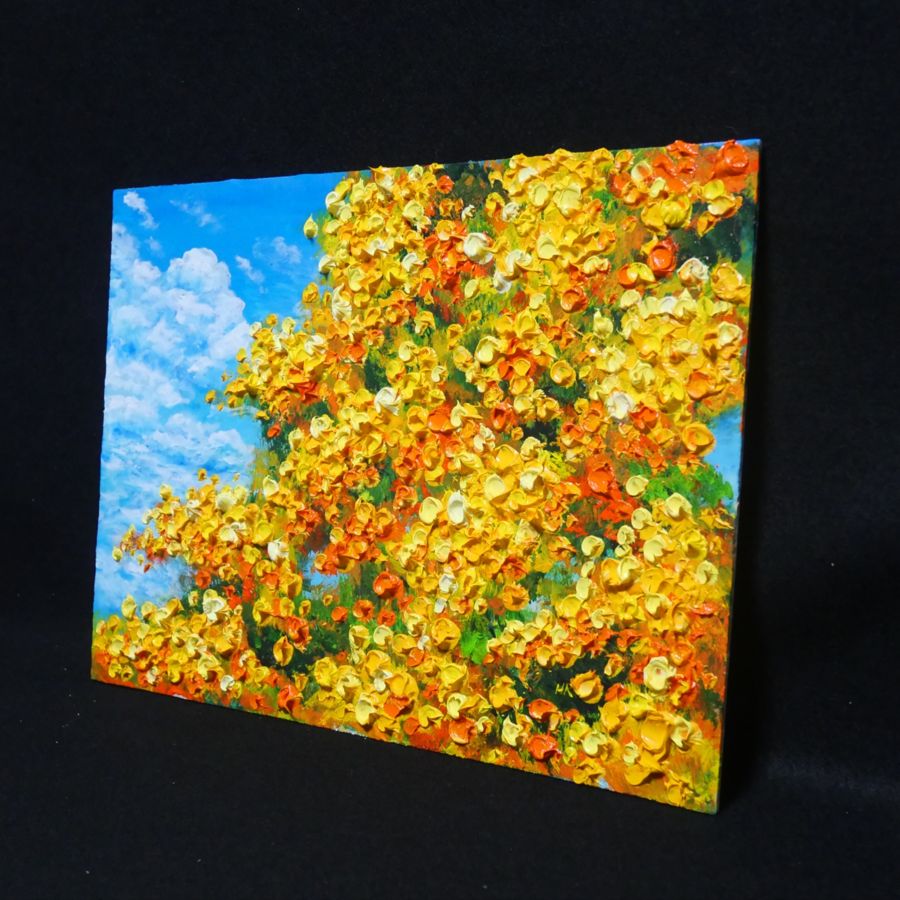 鮮やかな青空とふわふわの雲、そして美しいミモザの花々を描いた油彩作品「青空のミモザ」。この作品では、春の温かいひとときを感じさせる風景が広がり、見る人に心の安らぎを提供します。ミモザの鮮やかな黄色が、青空の深さと絶妙に調和し、あなたのインテリアに華やかさを加えることでしょう。