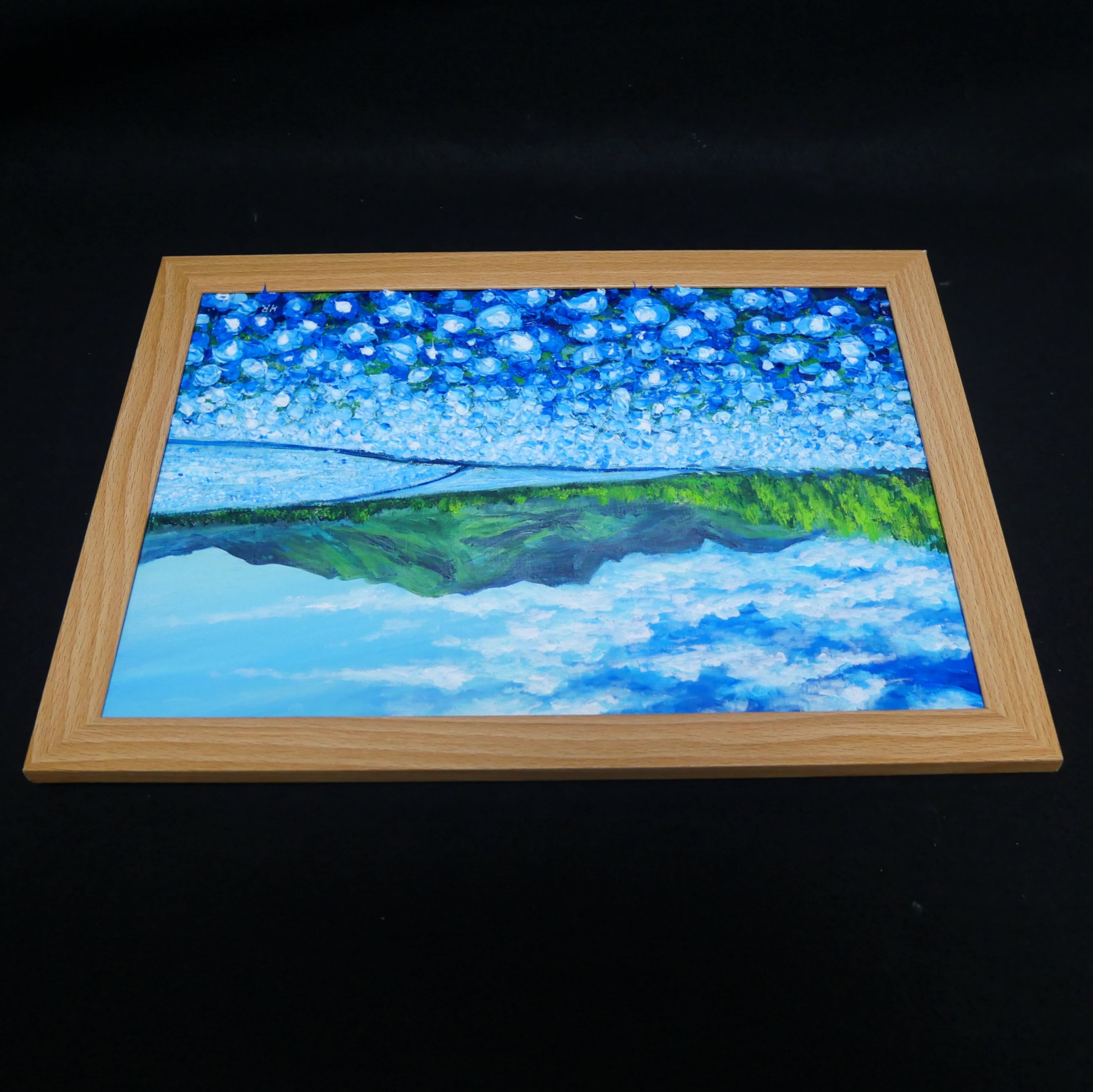 「くじゅう花公園のネモフィラ畑」は、大分県竹田市久住町の美しい風景を描いた魅力的な油彩作品です。この作品では、青空のもと広がるネモフィラの花畑が鮮やかに表現され、見る人に心温まるひとときを提供します。優雅な色彩と繊細なタッチが、あなたのインテリアに自然の美しさをもたらします。