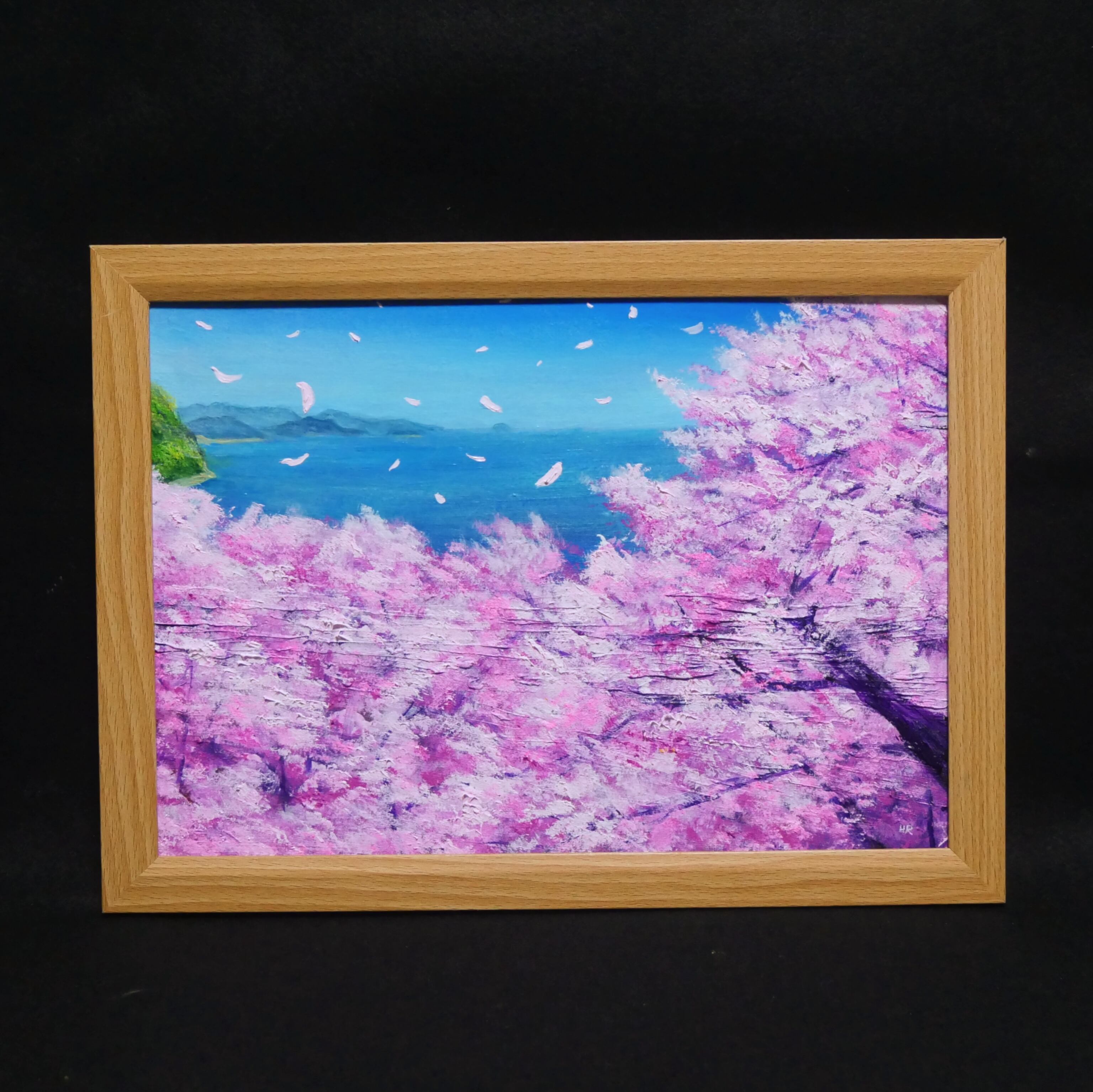 使用される油絵具は、一流の【ホルベイン】を使用し、アクリル絵具【リキテックス】との組み合わせで、神秘的で鮮やかな色合いを生み出しています。この「海に舞う桜」は、春の喜びと美しさを感じさせてくれる特別な作品となるでしょう。