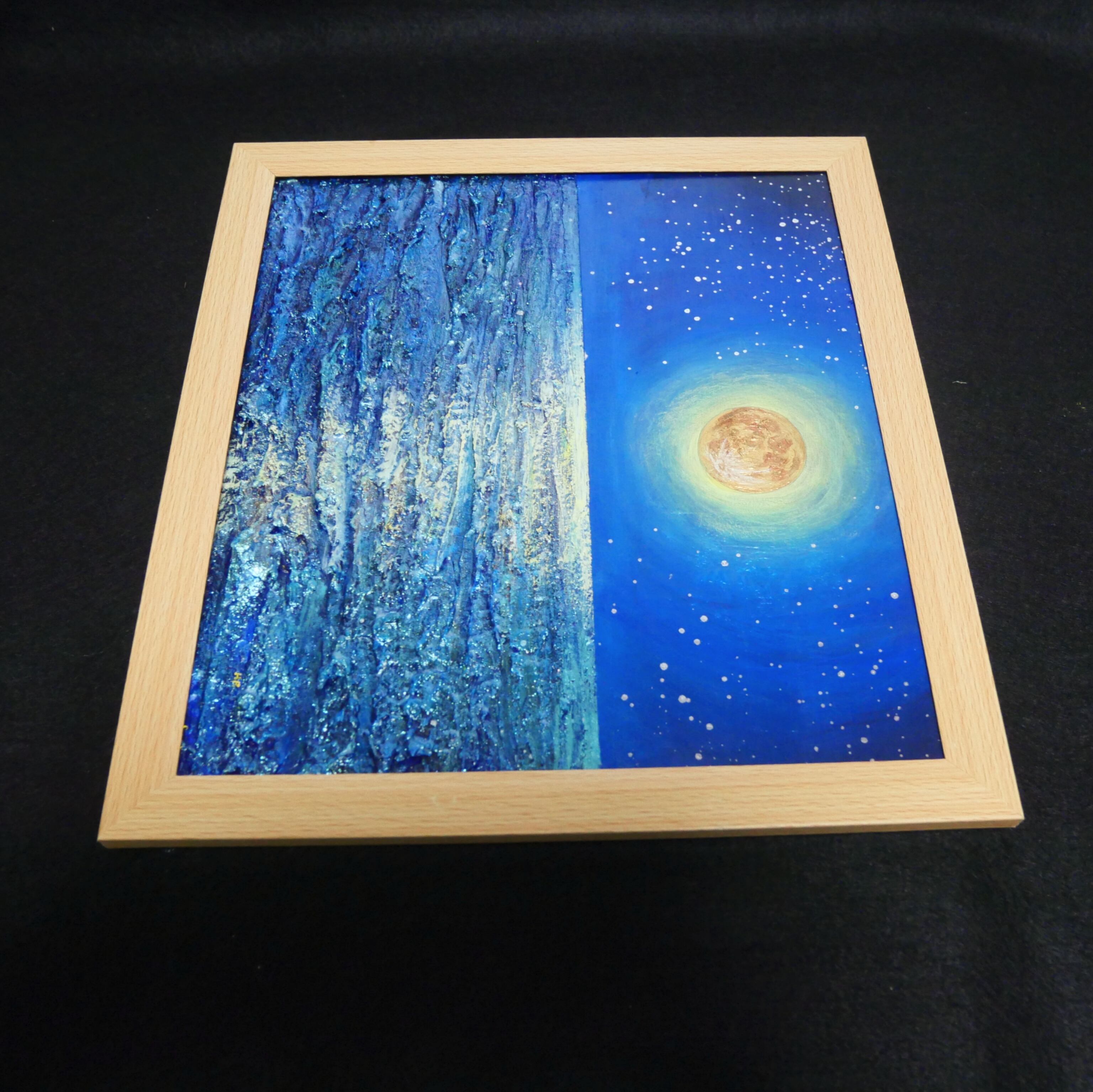 使用される油絵具は、一流の【ホルベイン】を使用しており、高級な偏光顔料#30クロマパールブルーを加えることで、海のキラキラ感を際立たせています。この「月下の海」は、夜の静けさと神秘的な美しさを感じさせてくれる特別な作品となるでしょう。